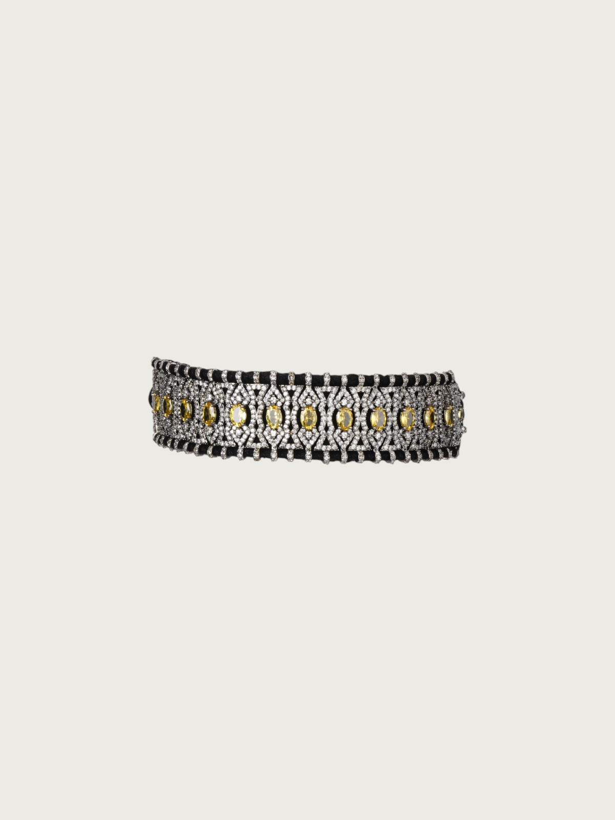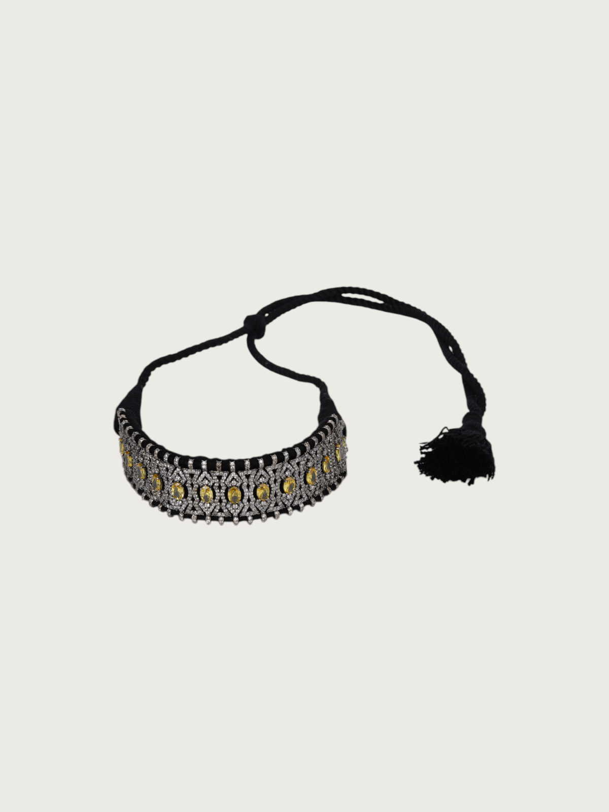 Discover the bold charm of our yellow choker necklaces, woven with rich, vibrant threads in black. These choker-style necklaces blend traditional motifs with a modern silhouette—featuring a base of silver-toned metal adorned with intricate, sparkling detailing and colored accents in yellow.