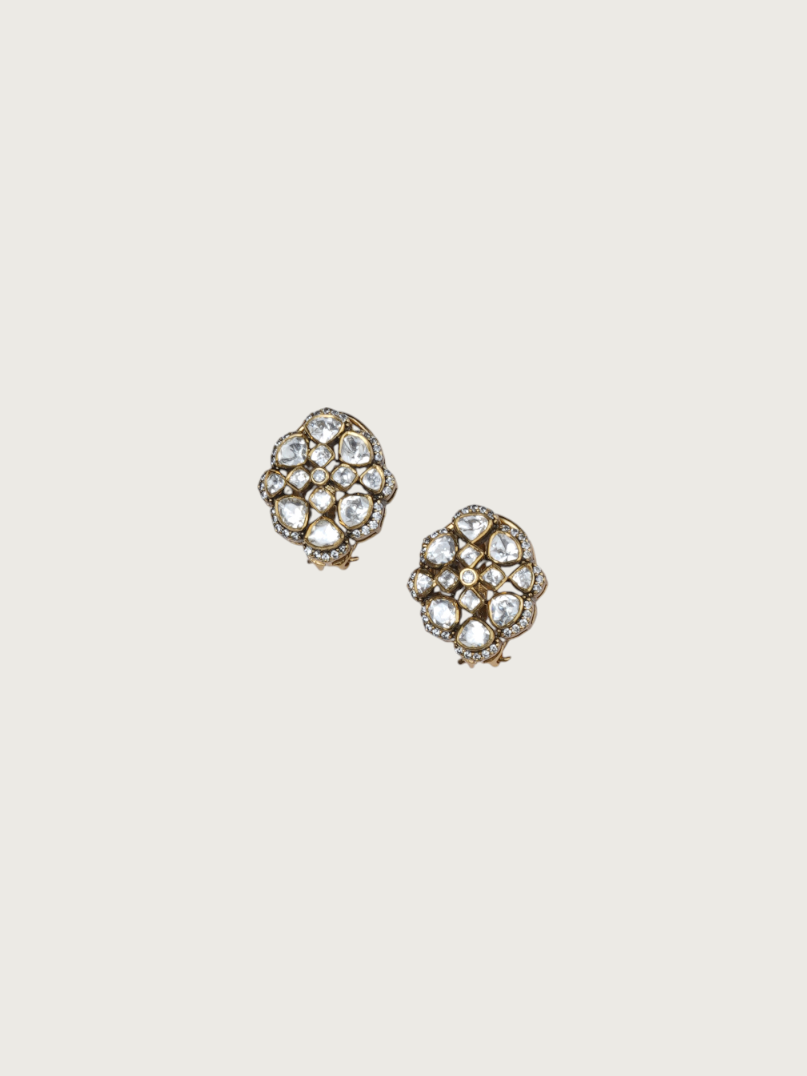 A classic tribute to vintage craftsmanship, these stud earrings crafted in 925 silver feature a delicate cluster of polki-style stones arranged in a blooming floral motif. The victorian-toned finish adds an antique charm, while the compact size ensures everyday elegance. Intricately designed with a traditional touch, these earrings reflect timeless sophistication with a sparkle that catches the light from every angle.