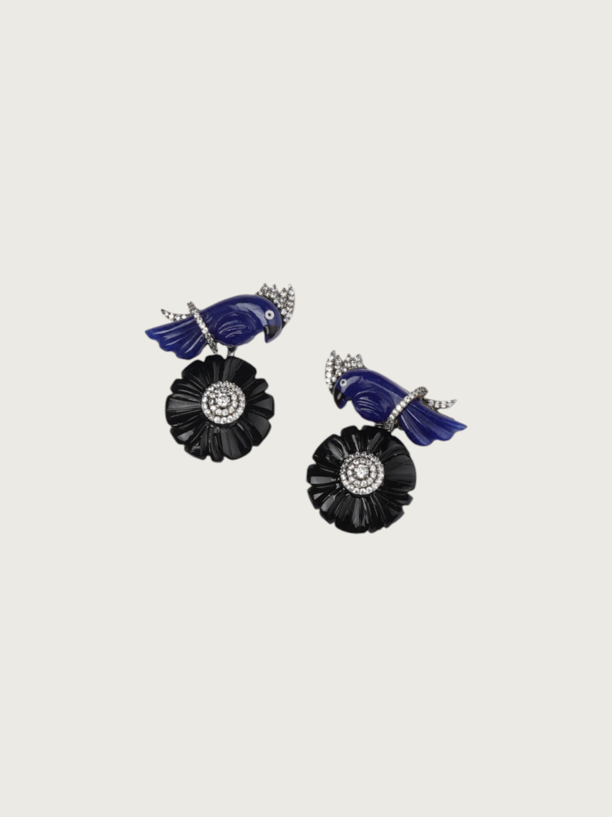 Channel playful elegance with our Whimsical Parrot & Floral Drop Earrings. These captivating designs feature meticulously hand-carved parrot motifs perched above intricately detailed floral drops, blending whimsy with sophistication. The parrots, adorned with sparkling crowns and eye-catching detailing, appear in vibrant shades like berry mauve and deep navy. The floral dangles, delicately carved in matching hues, add movement and charm to every glance.