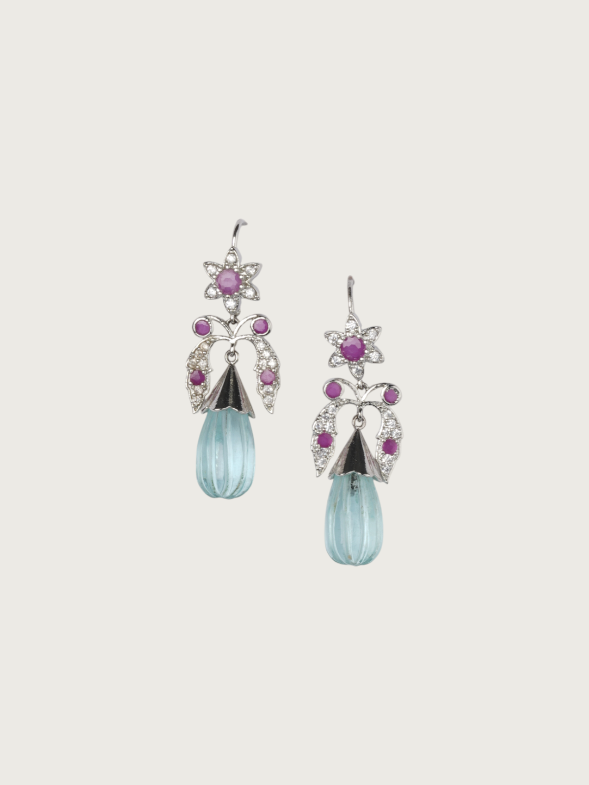 Embrace a refreshing blend of colour and charm with these aqua blue drop earrings, elegantly topped with a floral stud design. These earrings feature intricately carved aqua-toned drops paired with delicate ruby pink stones arranged in a floral motif and accented with tiny white highlights for added sparkle. The silver-toned base enhances the vibrancy of the colours, giving the piece a refined finish with a playful twist.