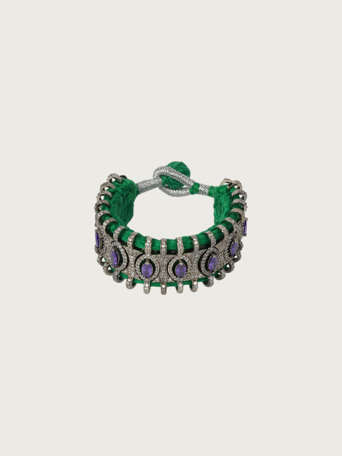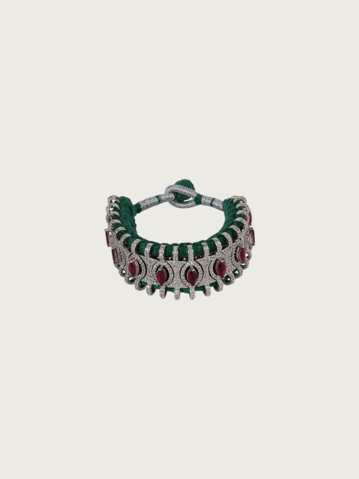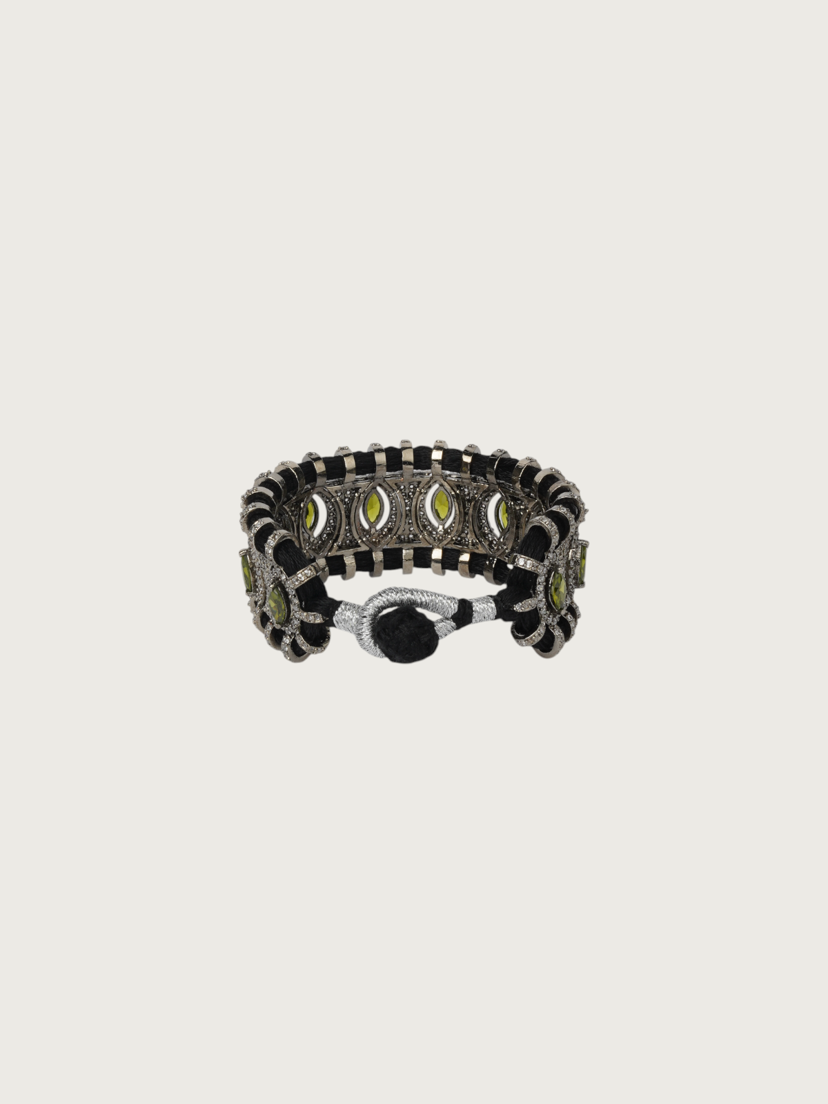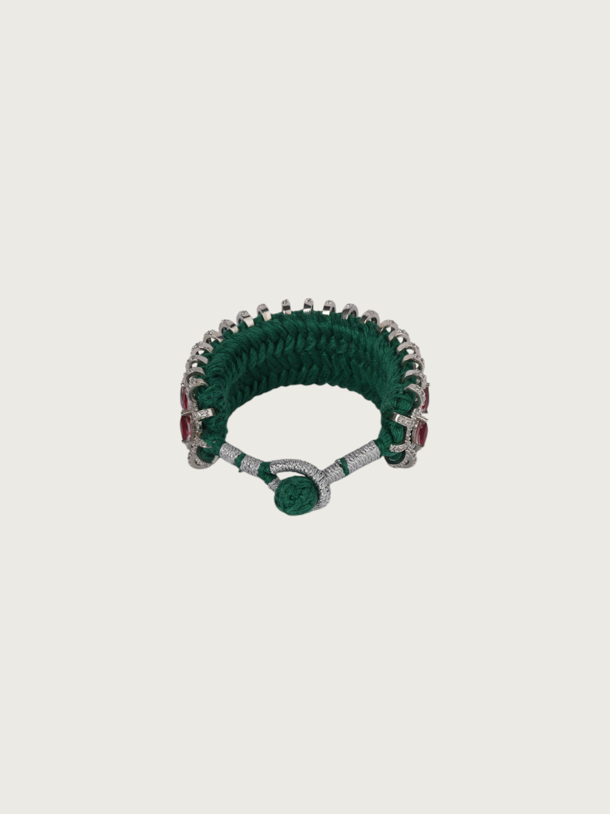 The bracelets are woven with bold and earthy threadwork in shades like beige, forest green, deep black, or ivory, enhancing the bohemian yet luxurious feel. The unique combination of geometric framing and sparkling stonework creates a standout wrist piece.