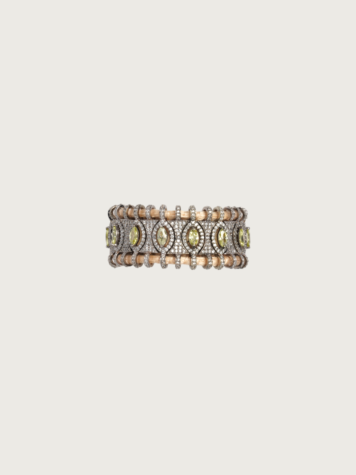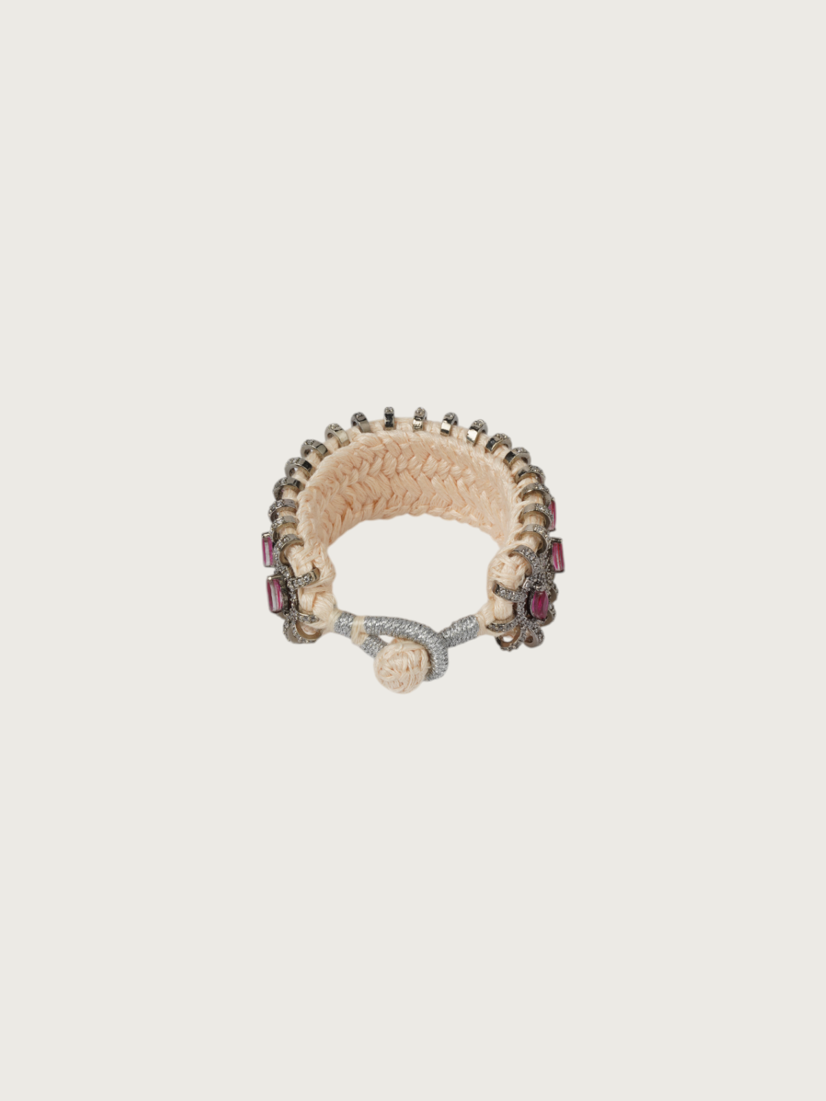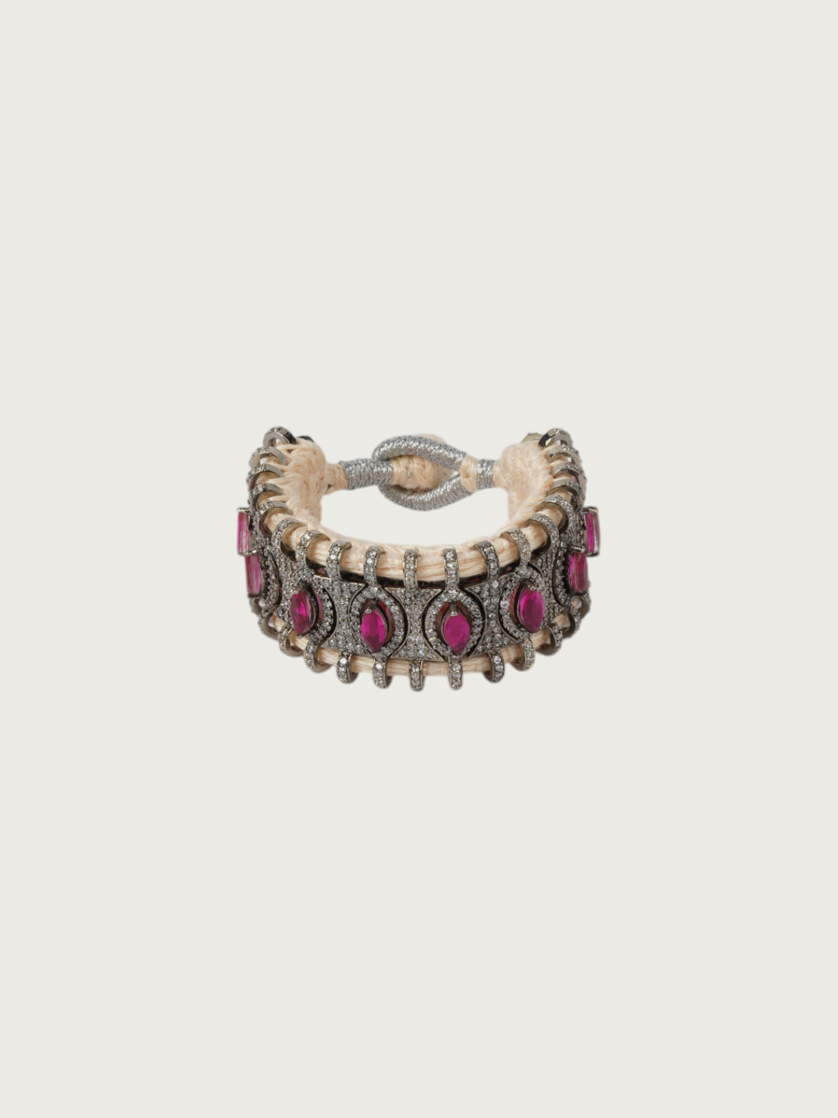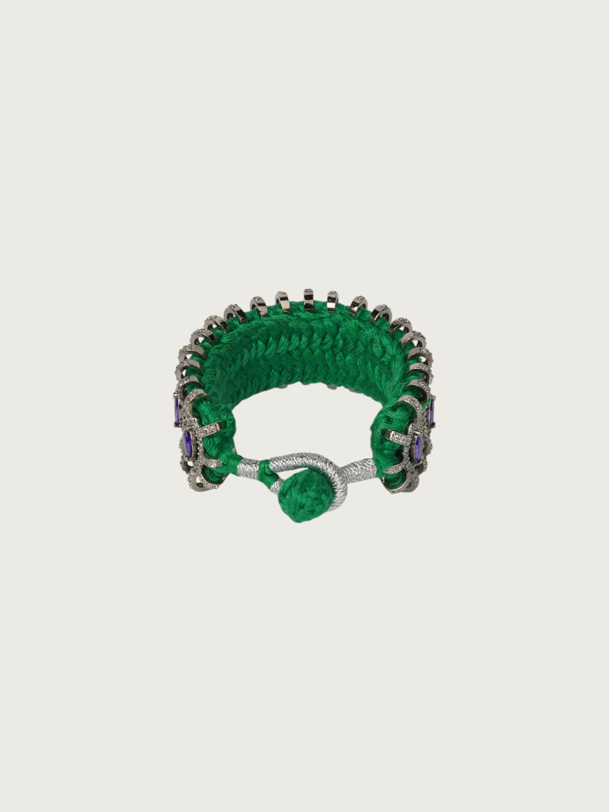 The bracelets are woven with bold and earthy threadwork in shades like beige, forest green, deep black, or ivory, enhancing the bohemian yet luxurious feel. The unique combination of geometric framing and sparkling stonework creates a standout wrist piece.