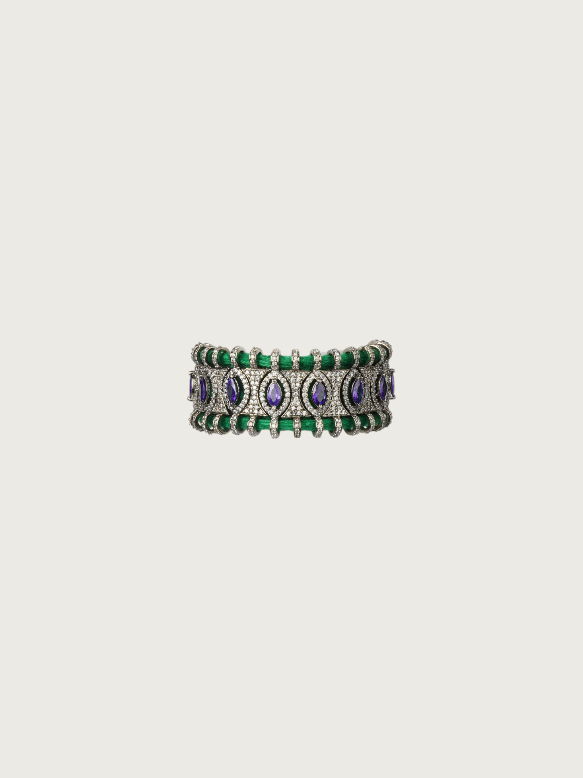 Add a touch of elegance and eclectic charm to your look with our handcrafted marquise stone bracelets. These silver and victorian-toned beauties feature meticulously arranged marquise-cut stones in rich hues—dark pink, garnet red, peridot green, amethyst purple, and turquoise blue—each set against a backdrop of intricate micro-studded textures.