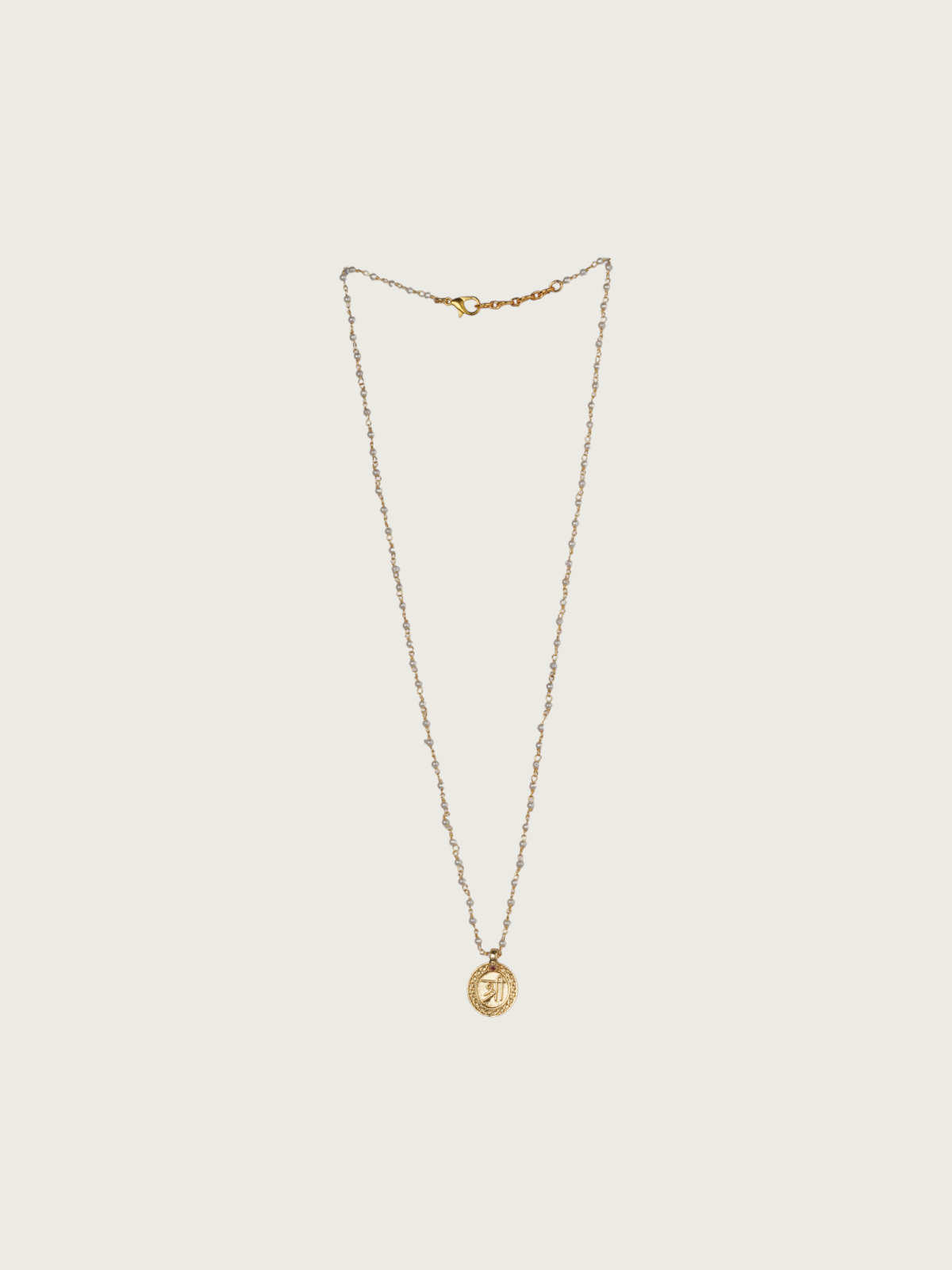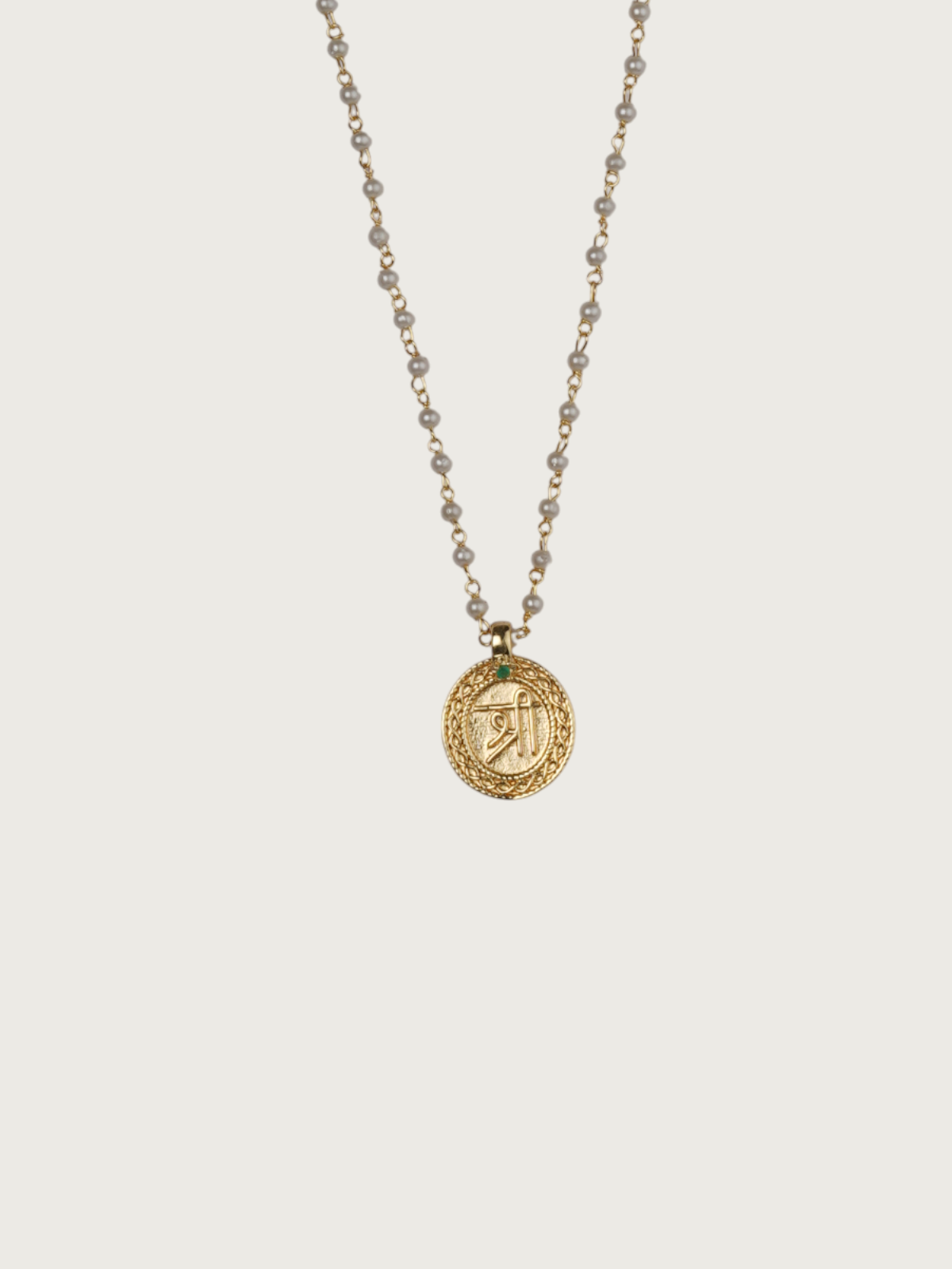 A graceful blend of tradition and simplicity, this gold-toned necklace features a delicate pearl-studded chain and a finely crafted circular pendant with the sacred "Shree" symbol at its center. The pendant is intricately bordered with engraved patterns that enhance its spiritual charm. The luminous pearl links add a soft, ethereal glow, making this piece a serene addition to your everyday or statement jewelry collection.
