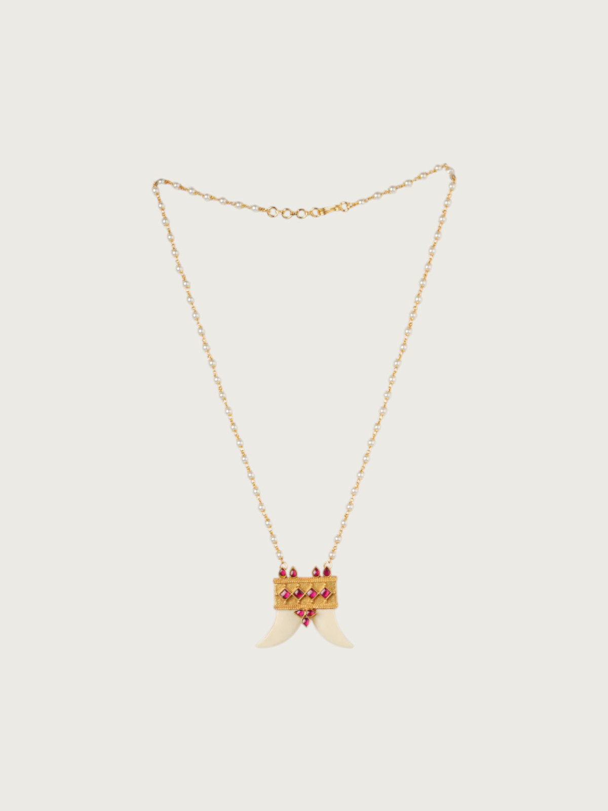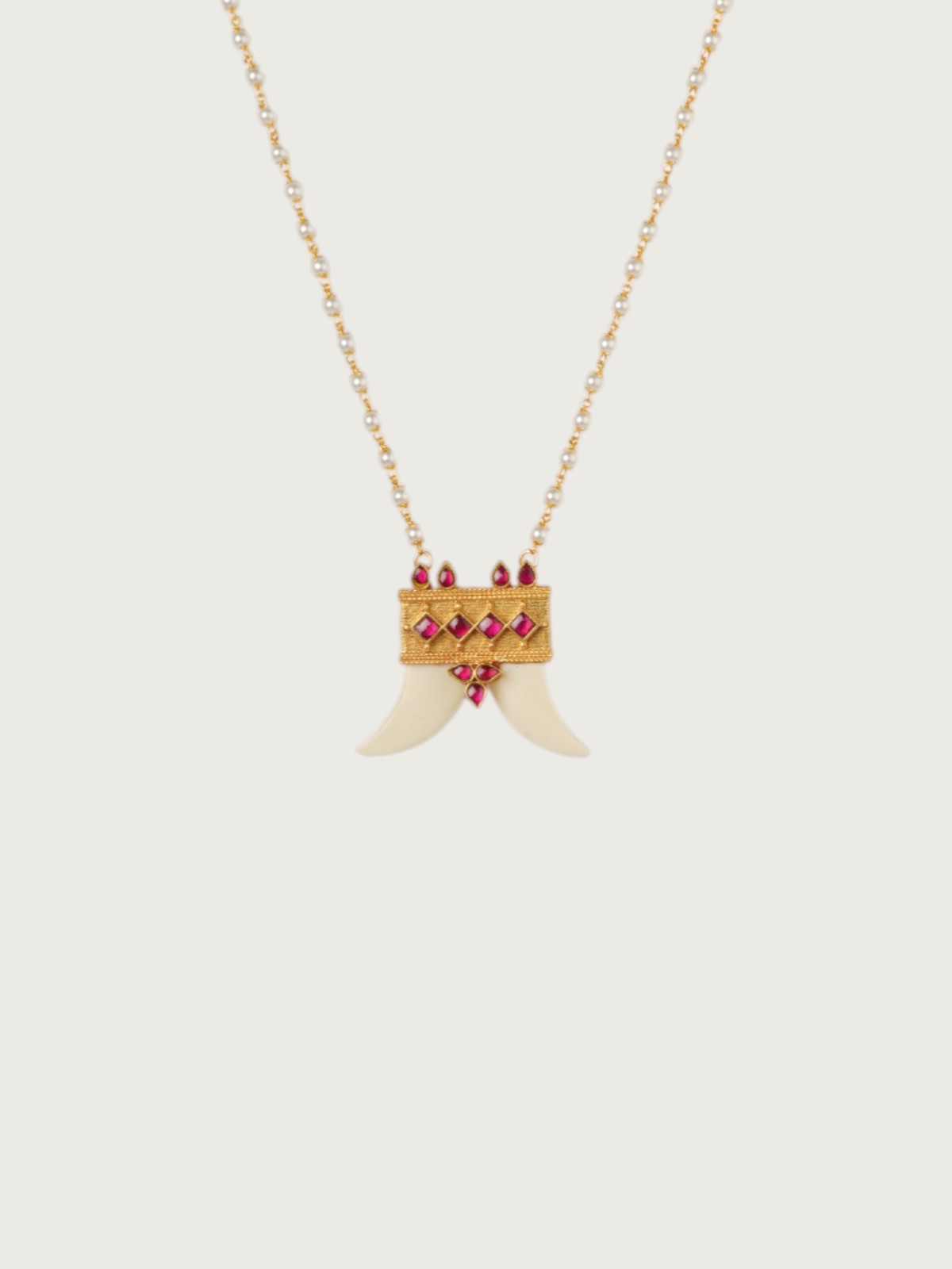A unique design that stands out with bold symbolism, this necklace features a double ivory-hued horn pendant capped with intricate red enamel work. The textured gold-plated detailing on the cap creates a regal contrast against the sleek form of the horns. Strung on a delicate pearl-linked gold-toned chain, the design seamlessly merges power with poise. Whether worn solo or layered, this piece brings a distinctive tribal elegance to your look.