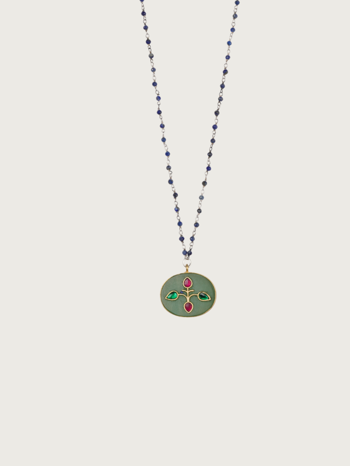 This beautifully handcrafted necklace features a hand-painted oval pendant, intricately designed with vibrant red and green enamel detailing. The pendant showcases a delicate floral stem motif, adorned with ruby-like and emerald-like accents that evoke timeless elegance.