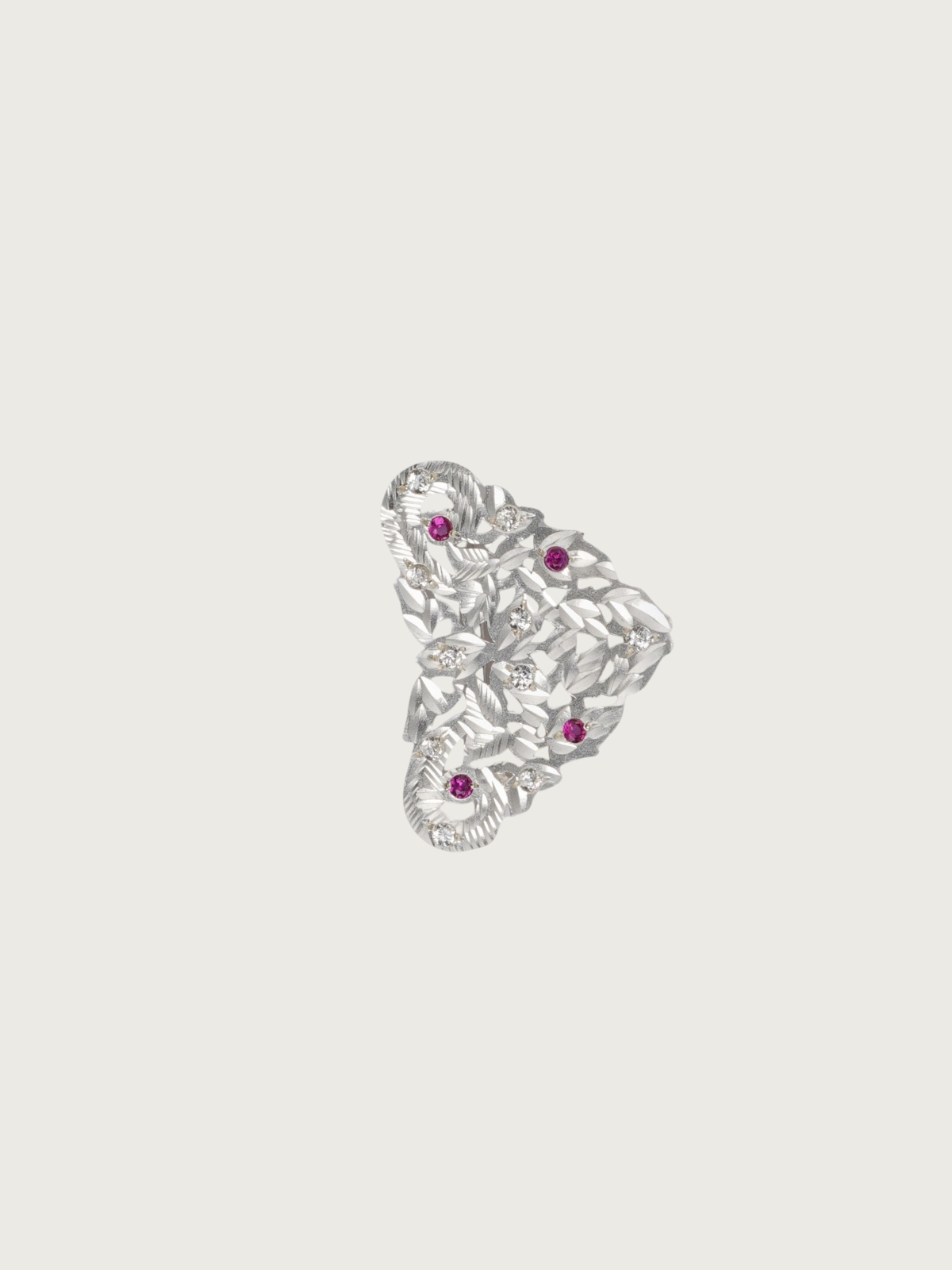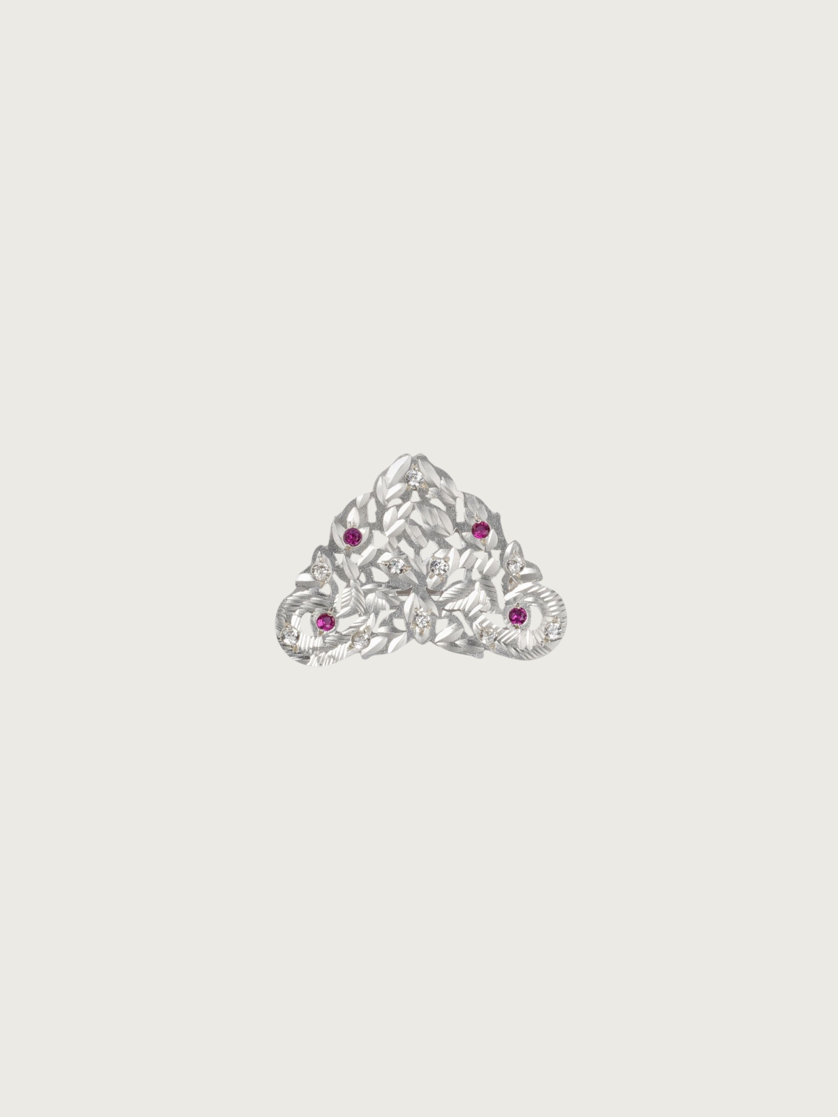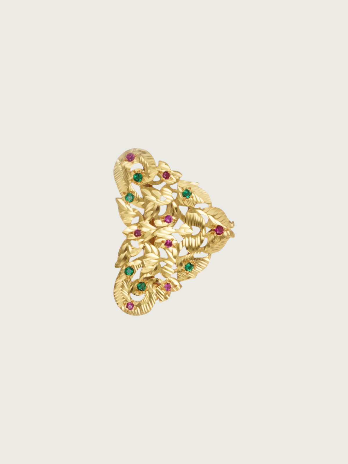 Showcasing intricate artistry, this triangle-shaped brooch features delicate hand-carved floral motifs and subtle pops of deep pink and multicolor accents. Its leaf-laced structure and layered detailing bring an elegant vintage appeal. Designed for those who appreciate fine heritage-inspired craftsmanship.