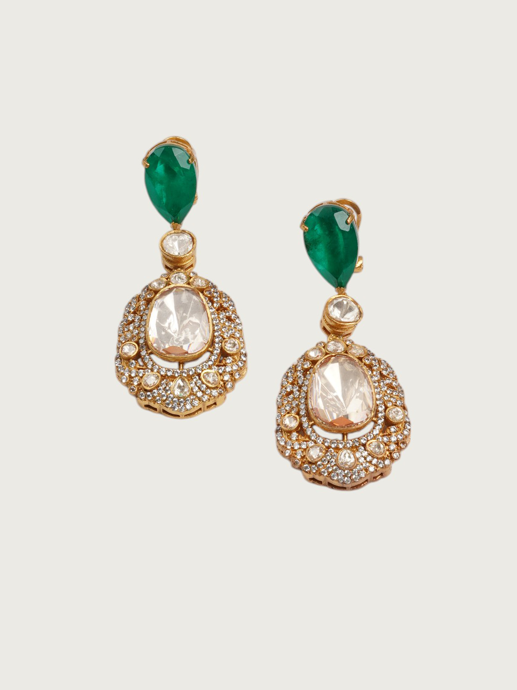 Elevate your style with these exquisite green kundan earrings, designed to add a touch of elegance to any outfit. Featuring a dazzling white kundan centerpiece, surrounded by delicate hand-set crystals, and crowned with a stunning green teardrop stone, these earrings blend traditional charm with modern sophistication.
