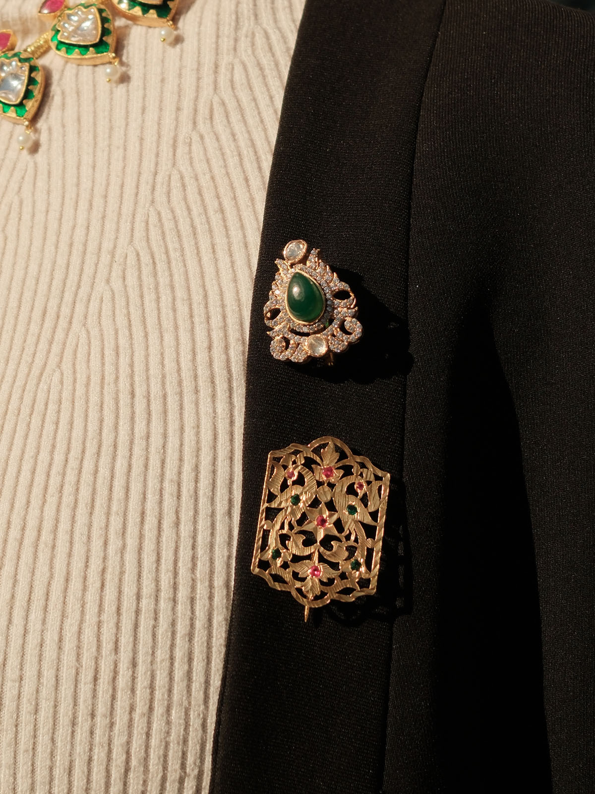 The Green Lace Brooch by Tver is a timeless accessory inspired by Mughal-era designs. Crafted in gold-plated brass, it features a striking green oval center with intricate crystal detailing in a lace-like pattern. A versatile statement piece that blends classic elegance with modern minimalism.