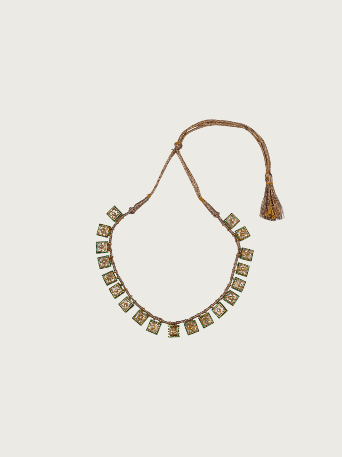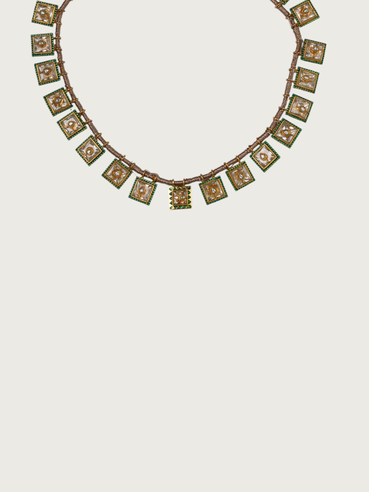 The Verdant Square Necklace by Tver brings together the regal charm of Kundan with the contemporary structure of enamelled squares. Set in gold-plated brass, each square pendant features delicate white Kundan work bordered by green enamel, forming a striking layout around a hand-knotted brown thread. The adjustable tie-back adds both comfort and versatility, making this piece a standout addition to any jewelry collection.