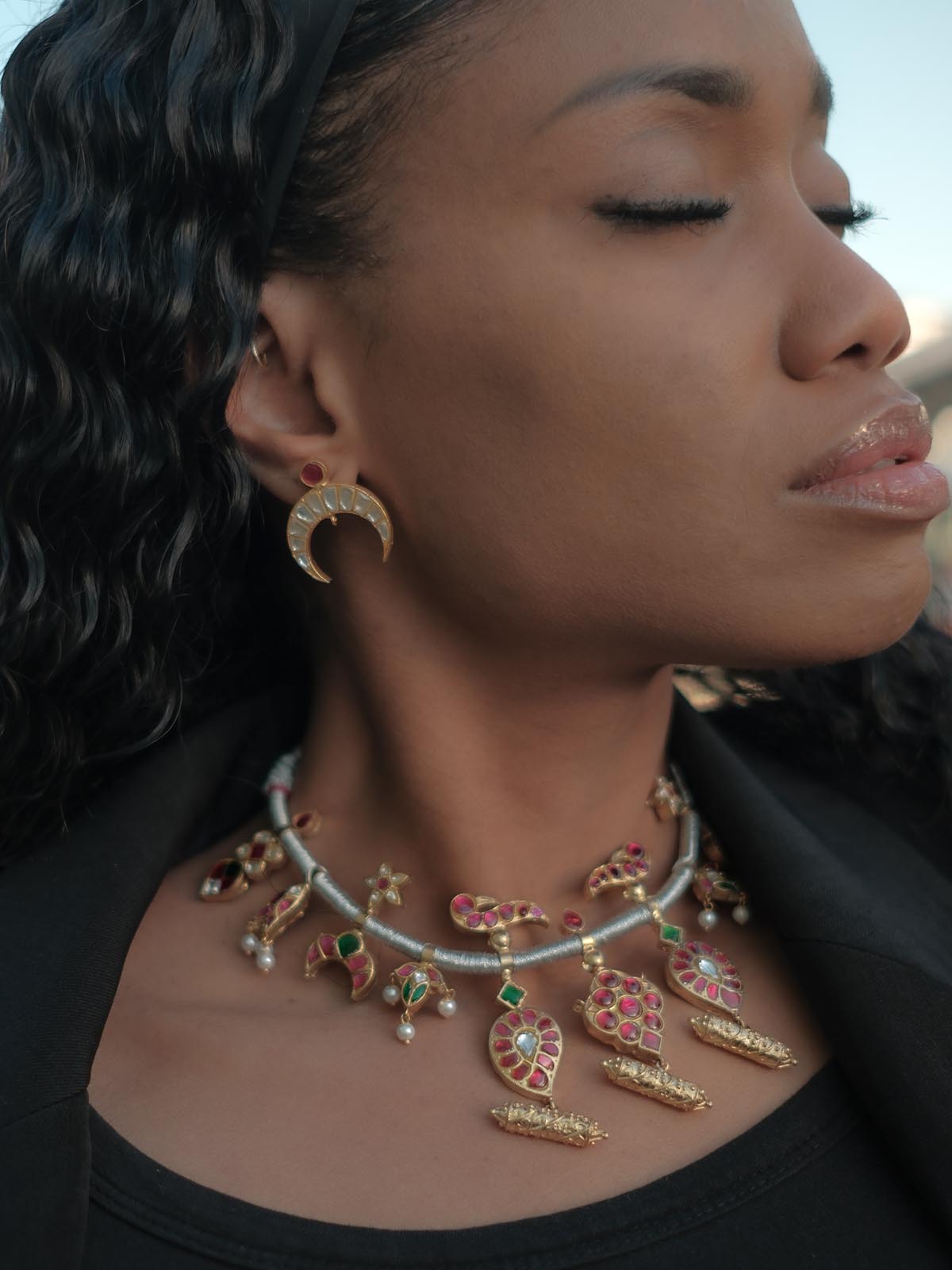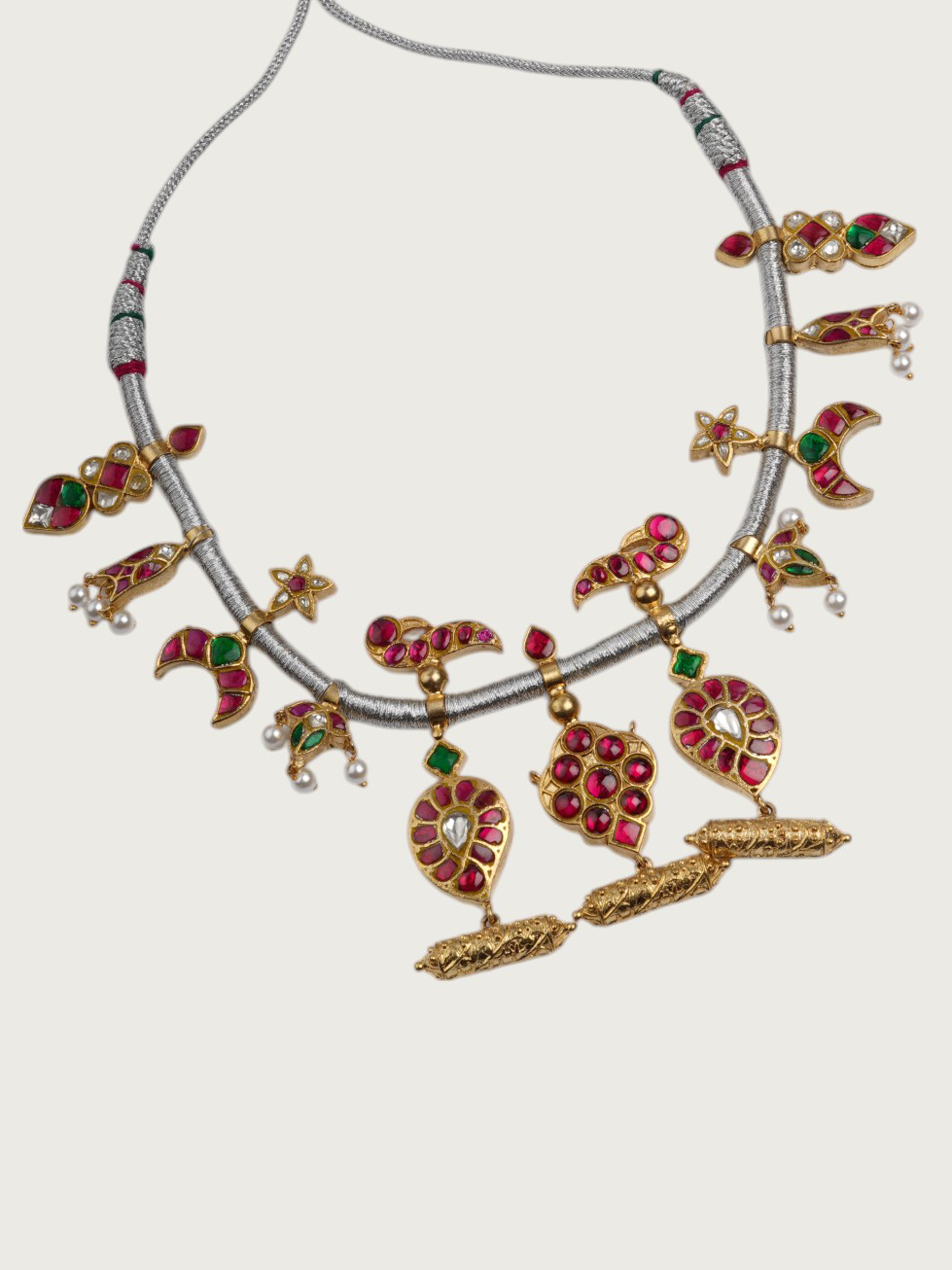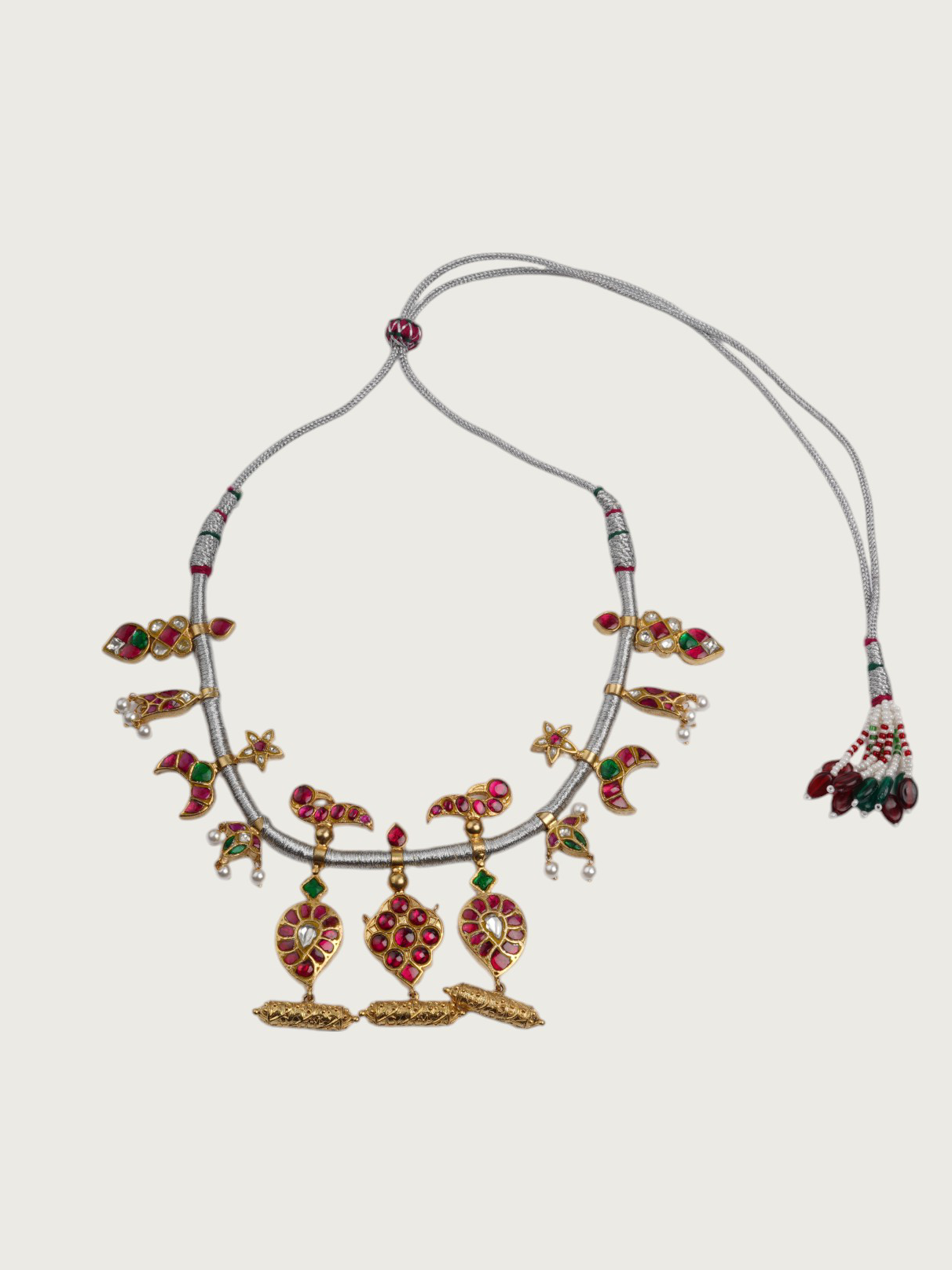 Step into timeless elegance with Tver's Royal Peacock Charm Necklace. This necklace, crafted from brass with gold plating, features intricately designed peacock and floral charms inspired by Mughal-era artistry. The adjustable thread closure ensures a comfortable fit, making it a statement piece for everyday sophistication.