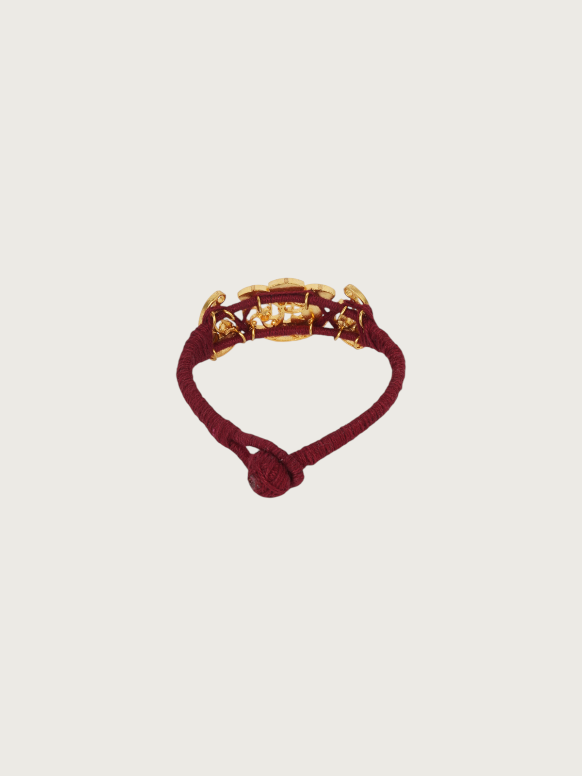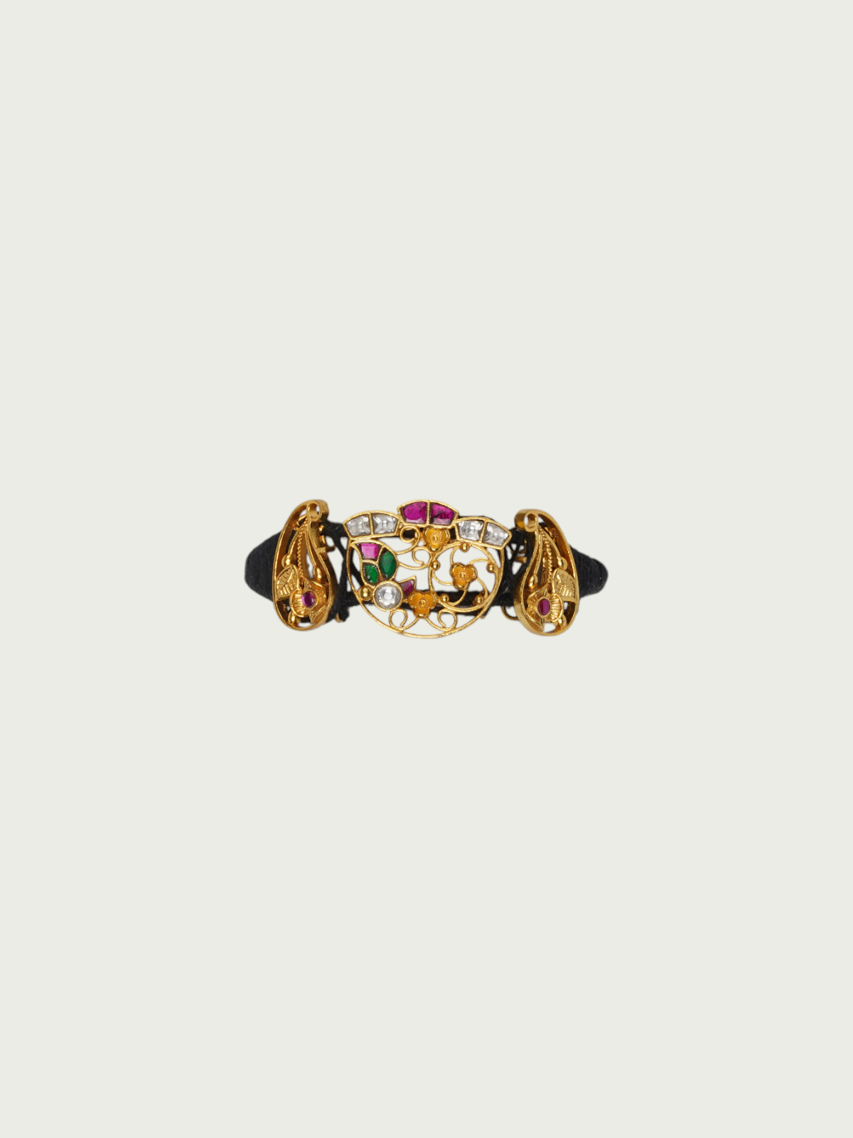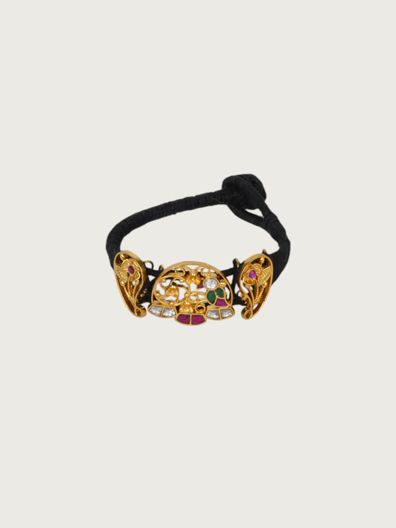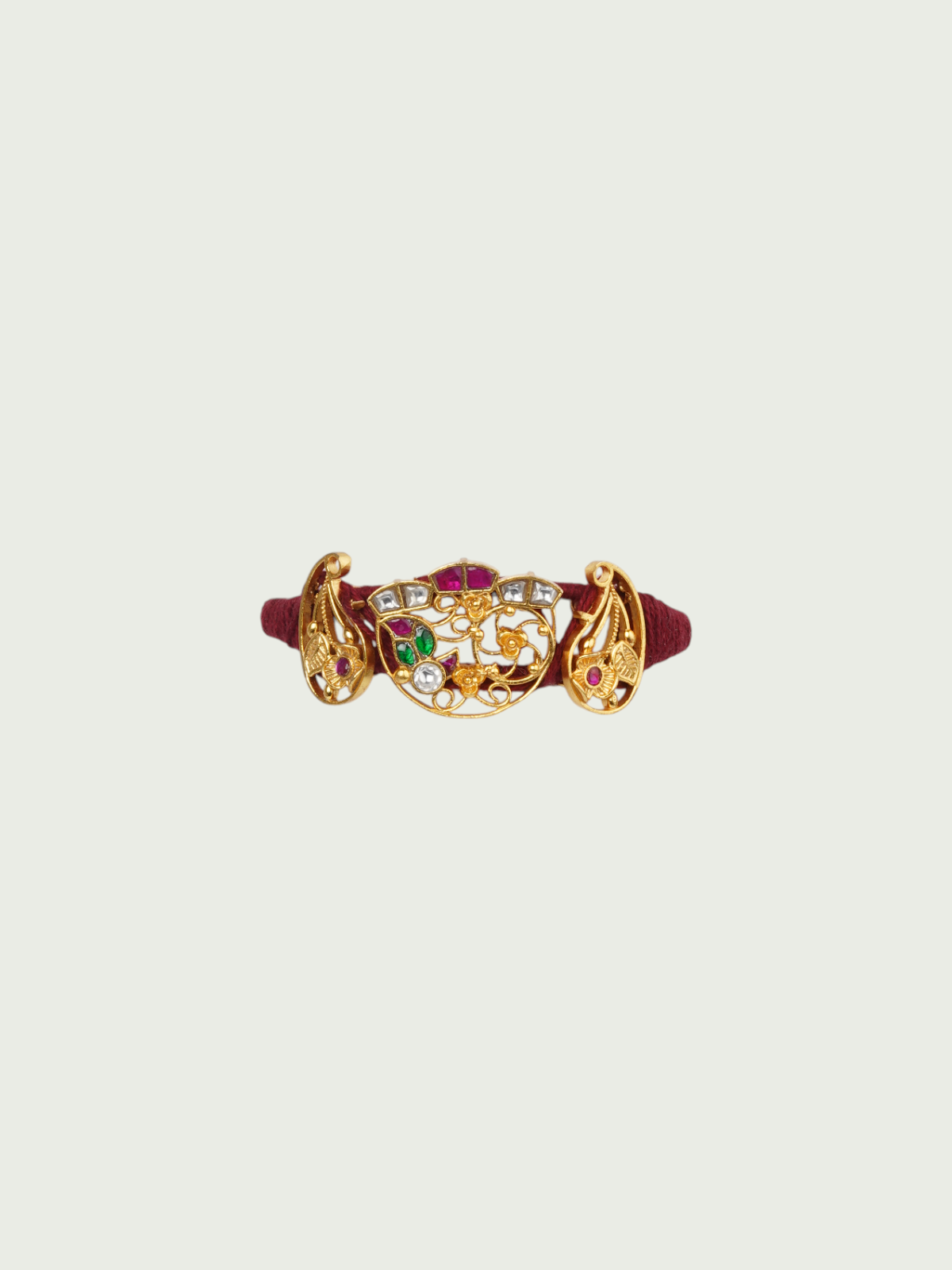 A radiant expression of craftsmanship, this handcrafted bracelet features a gold-plated half-moon jadau motif set. Embellished with vibrant red, green, and white detailing in floral and geometric patterns, this piece carries the essence of heritage with a fresh bohemian spirit. The side elements mirror ornate peacock-inspired forms, lending an elegant curvature to the design. Adjustable and striking, this bracelet is a versatile addition to your collection.