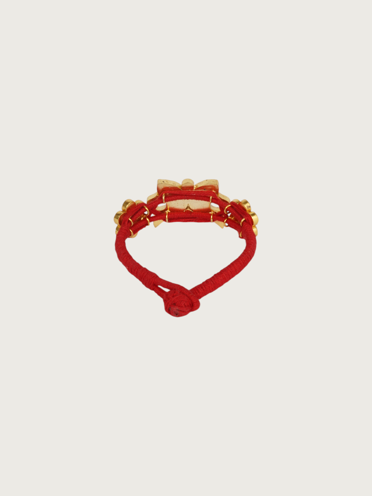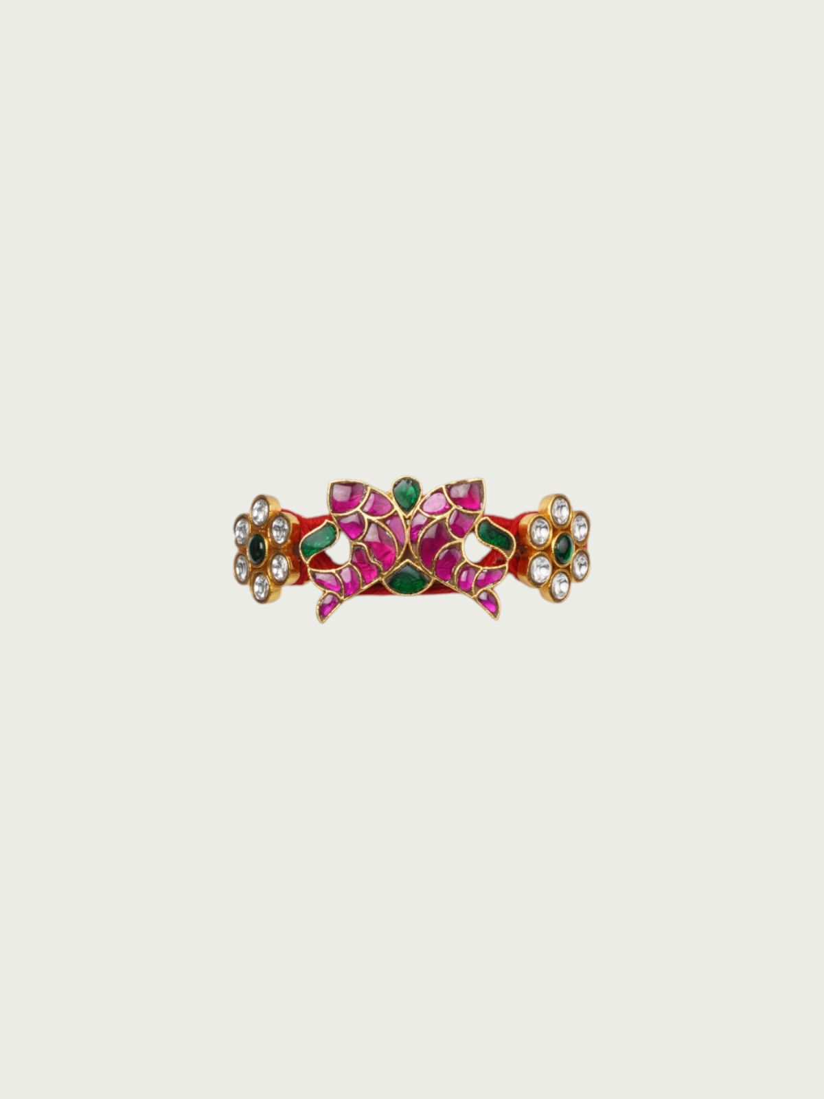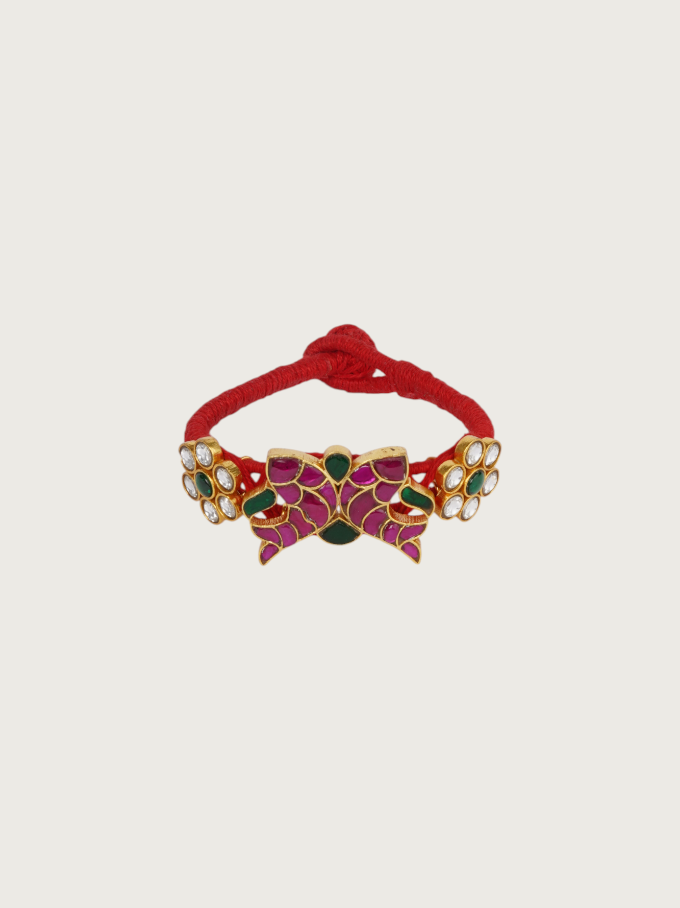 Playful yet graceful, this gold-plated bracelet features a charming bow design at its center, adorned with hand-painted pink and green meenakari and bordered with delicate floral clusters on either side. The deep green cord tie adds a vibrant contrast, making it a standout accessory for layering or solo wear. Designed for those who love expressive jewelry, this piece adds a touch of whimsy and bold color to your collection.