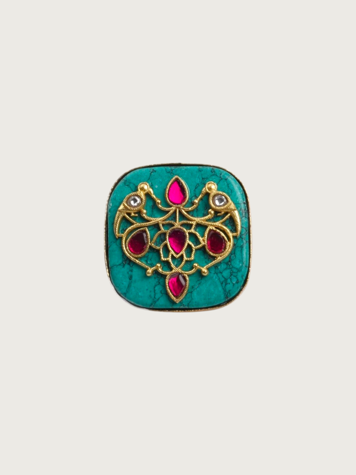 A vibrant pop of heritage and artistry, this handcrafted brooch features a rich turquoise enamel base, brought to life with bright pink stone accents in elegant teardrop. Golden wire detailing adds depth to the design, creating a floral motif that’s both traditional and refreshing. The intricate composition and antique finish make it an ideal statement piece to elevate any look.
