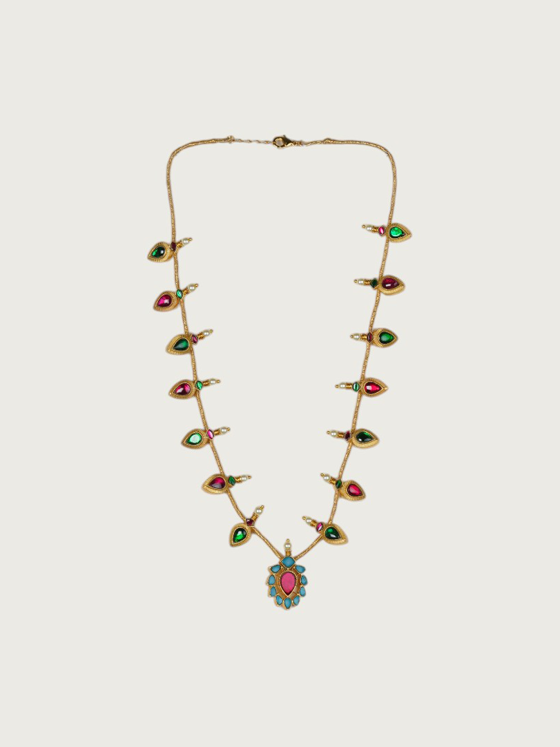 Add a pop of color with this gold-plated necklace featuring vibrant teardrop accents and a center pendant in soft blue and coral hues. Lightweight and versatile, it's perfect for any occasion.