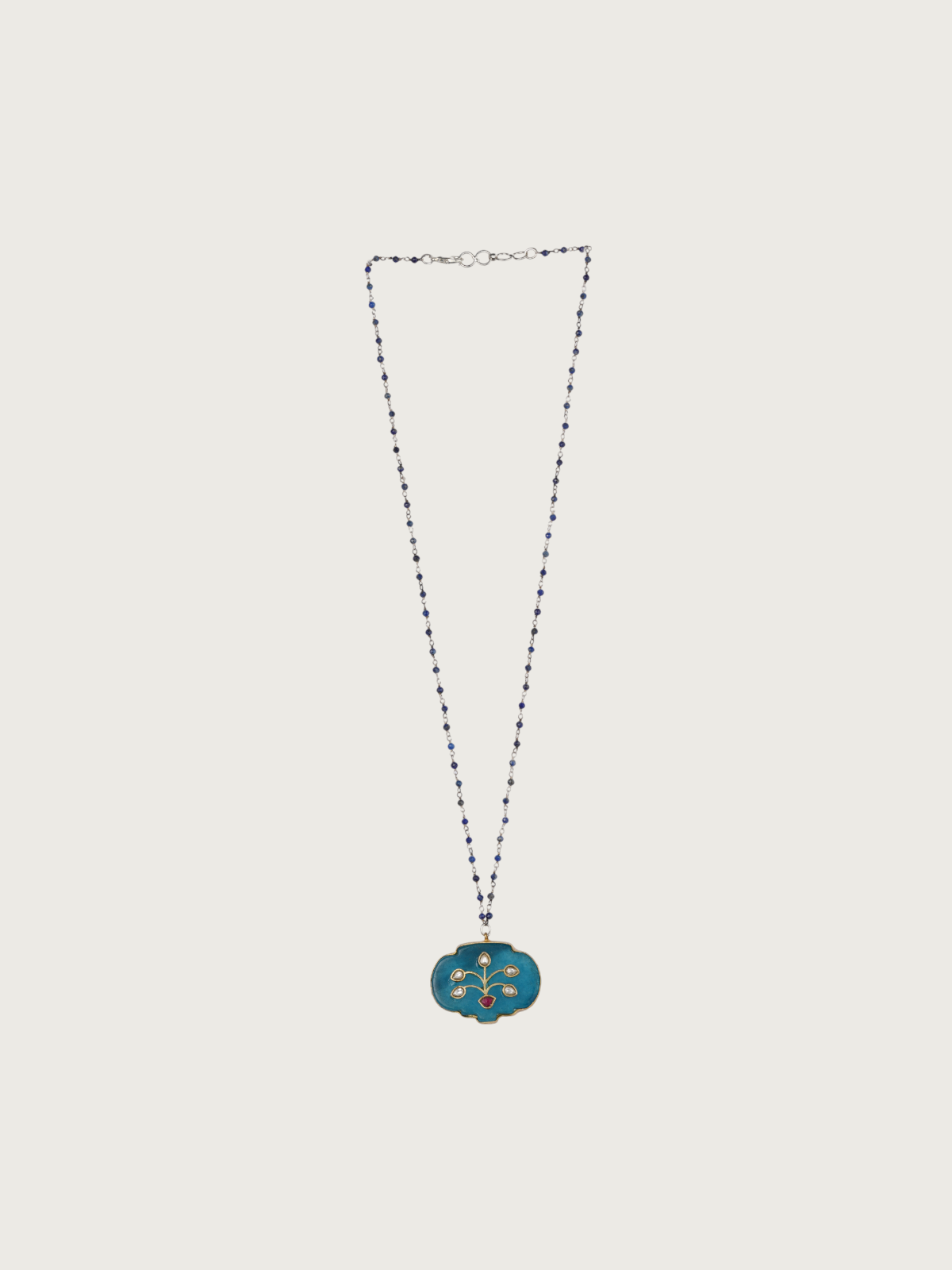 The vibrant pendant is suspended from a chain adorned with blue and silver-toned beads, enhancing the richness of the piece. Whether layered or worn solo, this piece effortlessly merges traditional charm with a playful pop of color.