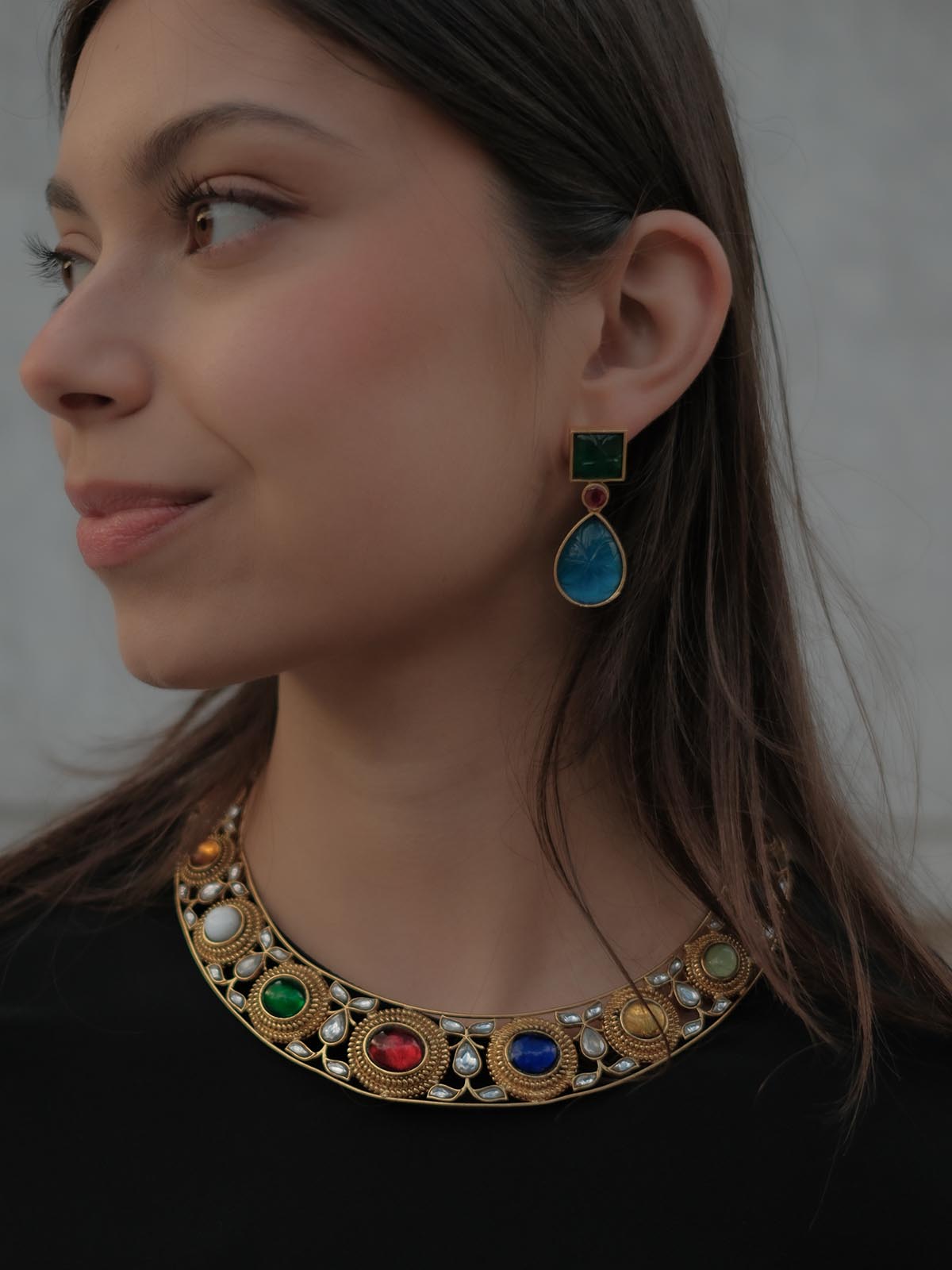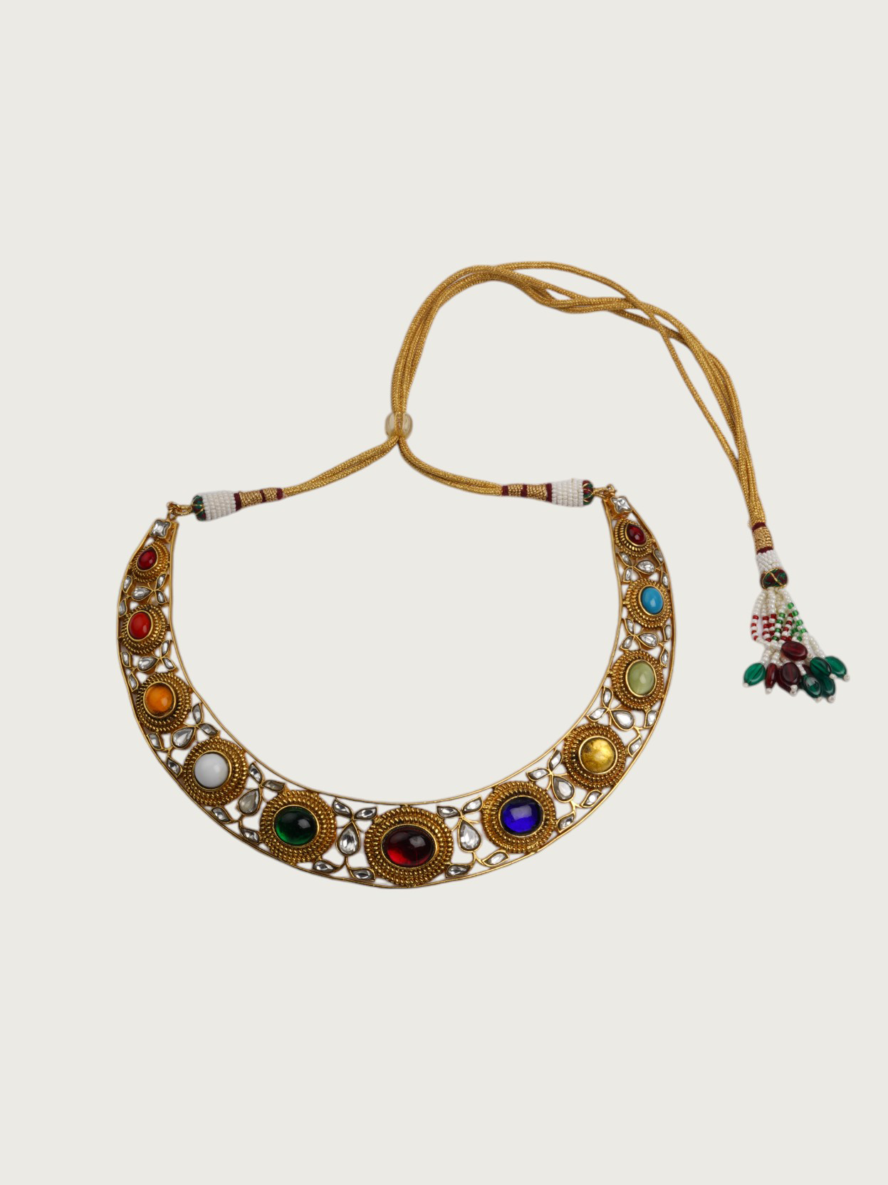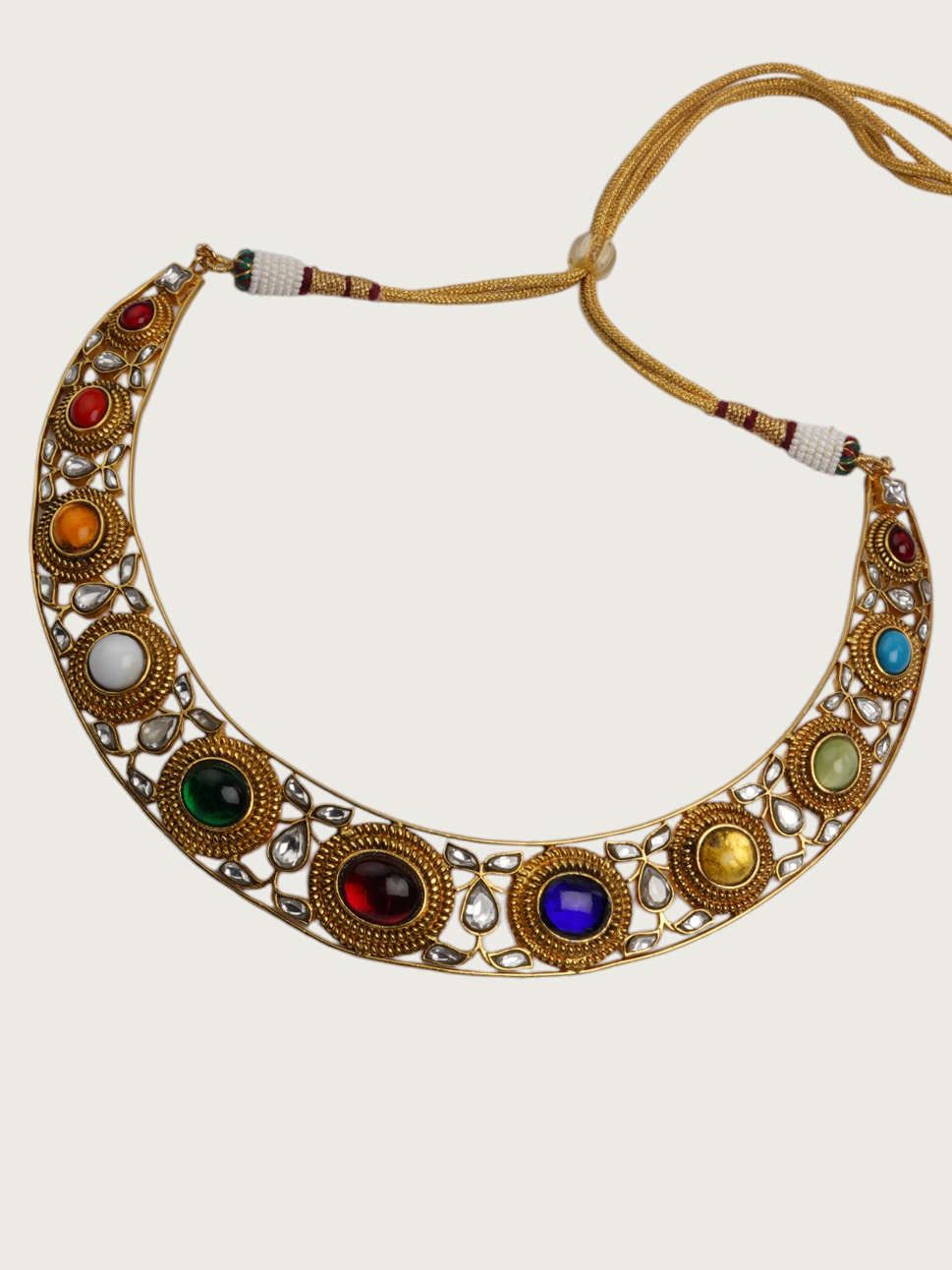 This gold-plated collar necklace features vibrant multicolor accents in a symmetrical design. The intricate detailing adds a touch of sophistication, making it an elegant statement piece for any look.