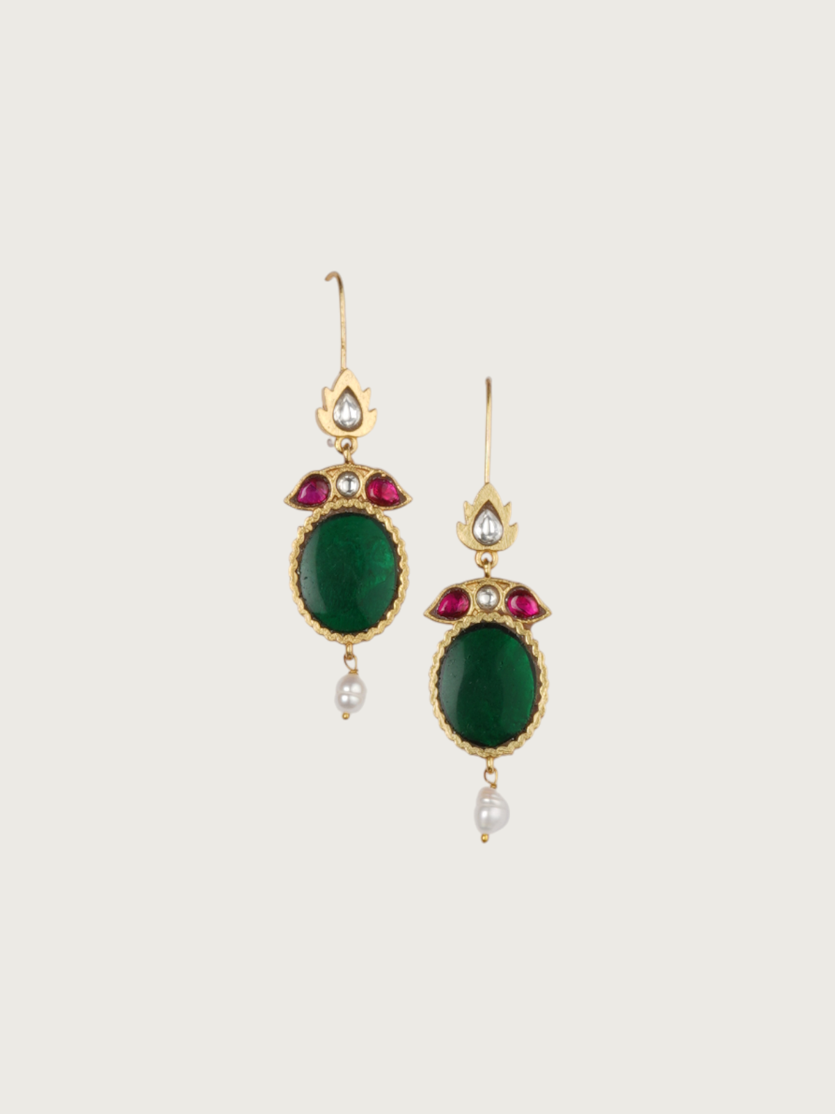 A striking pair of handcrafted gold-plated earrings featuring deep green oval stones accented by pink and white details. The design is elevated with delicate pearl drops, adding a refined finish to its bold color palette.