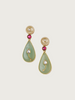 These handcrafted gold-plated earrings blend soft pastel green tones with hints of pink and gold for a refined, artistic look. The teardrop-shaped green base is delicately detailed with kundan-inspired white inlays, complemented by a luminous pink accent and a gold pearl top.