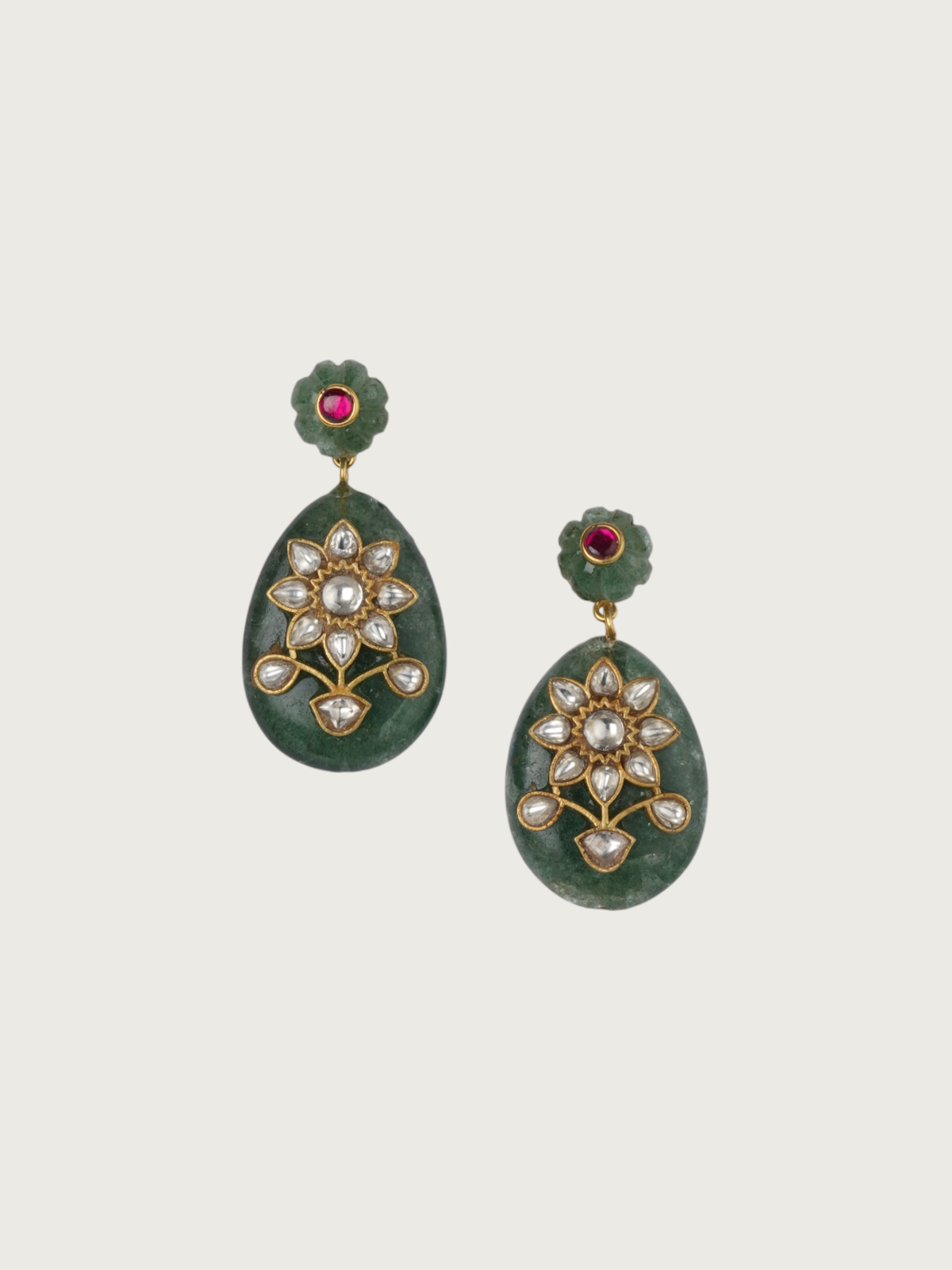 These handcrafted gold-plated earrings feature a regal combination of deep green and soft gold, adorned with floral kundan motifs. The drop-shaped base highlights a symmetrical flower pattern accented with white stones, while the upper stud blooms with a pink center set against a carved green design.