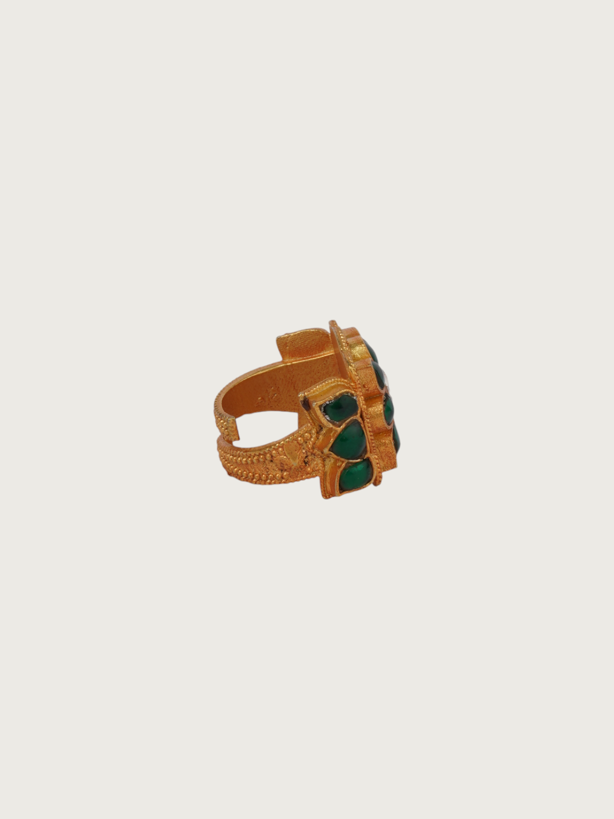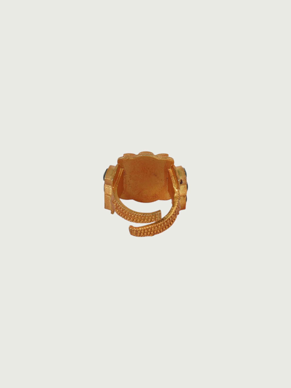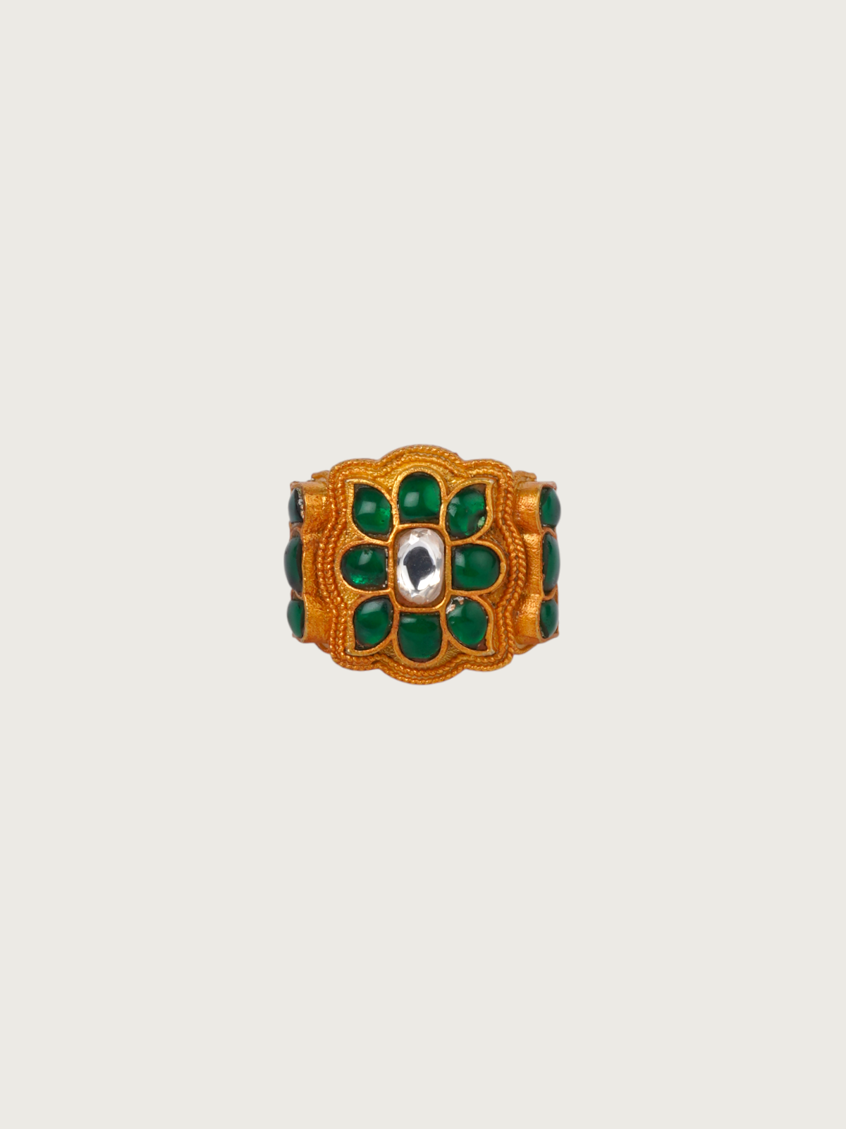 Immerse yourself in the elegance of Indian heritage with this handcrafted gold-plated wide band ring. Inspired by the by royal Mughal-era jewels, this ring features intricate floral detailing, crafted in high-quality brass with a luxurious gold-plated finish. A timeless piece that blends heritage charm with contemporary minimalism, perfect for everyday wear or as a statement accessory. This ring offers a bold yet versatile accessory for your collection. Its wide band design ensures a comfortable fit while making a statement with every wear.