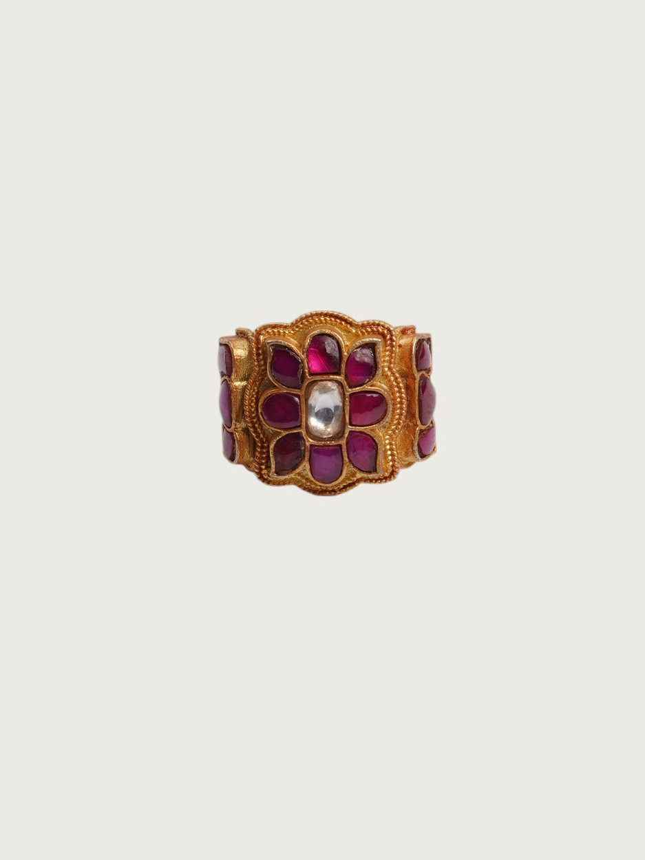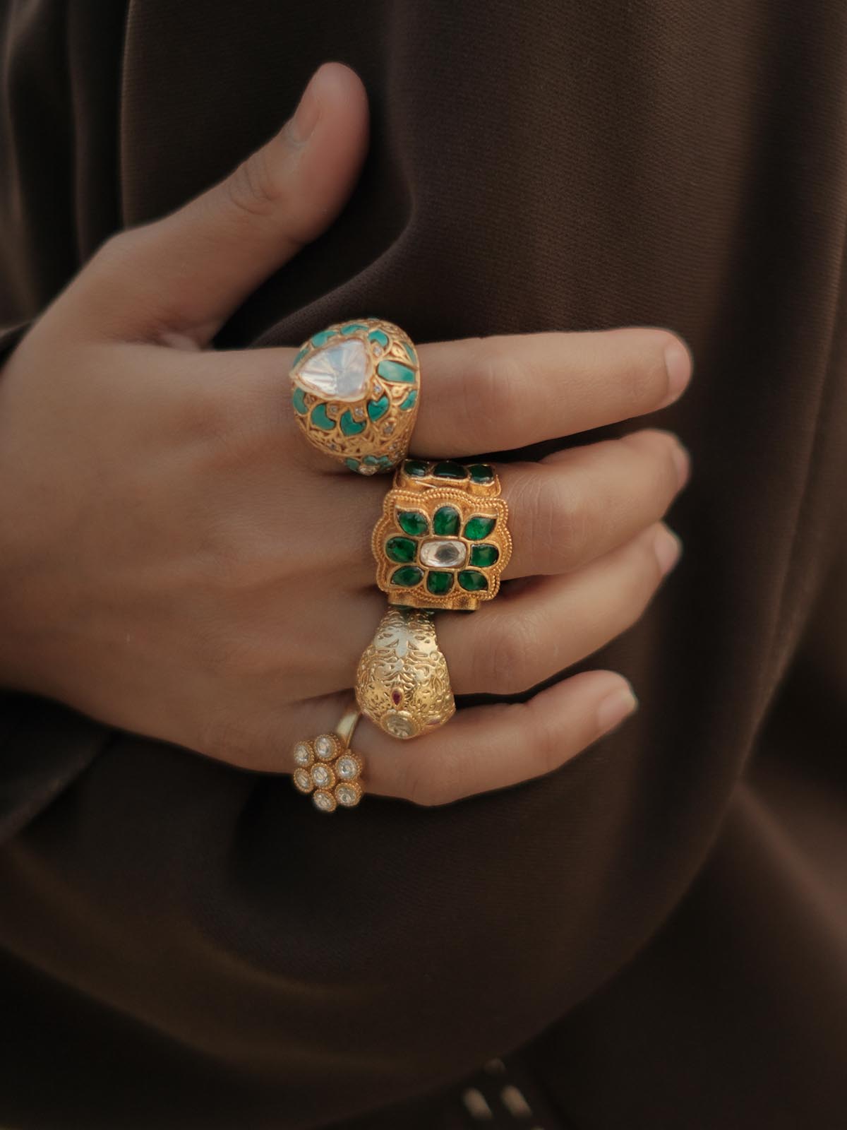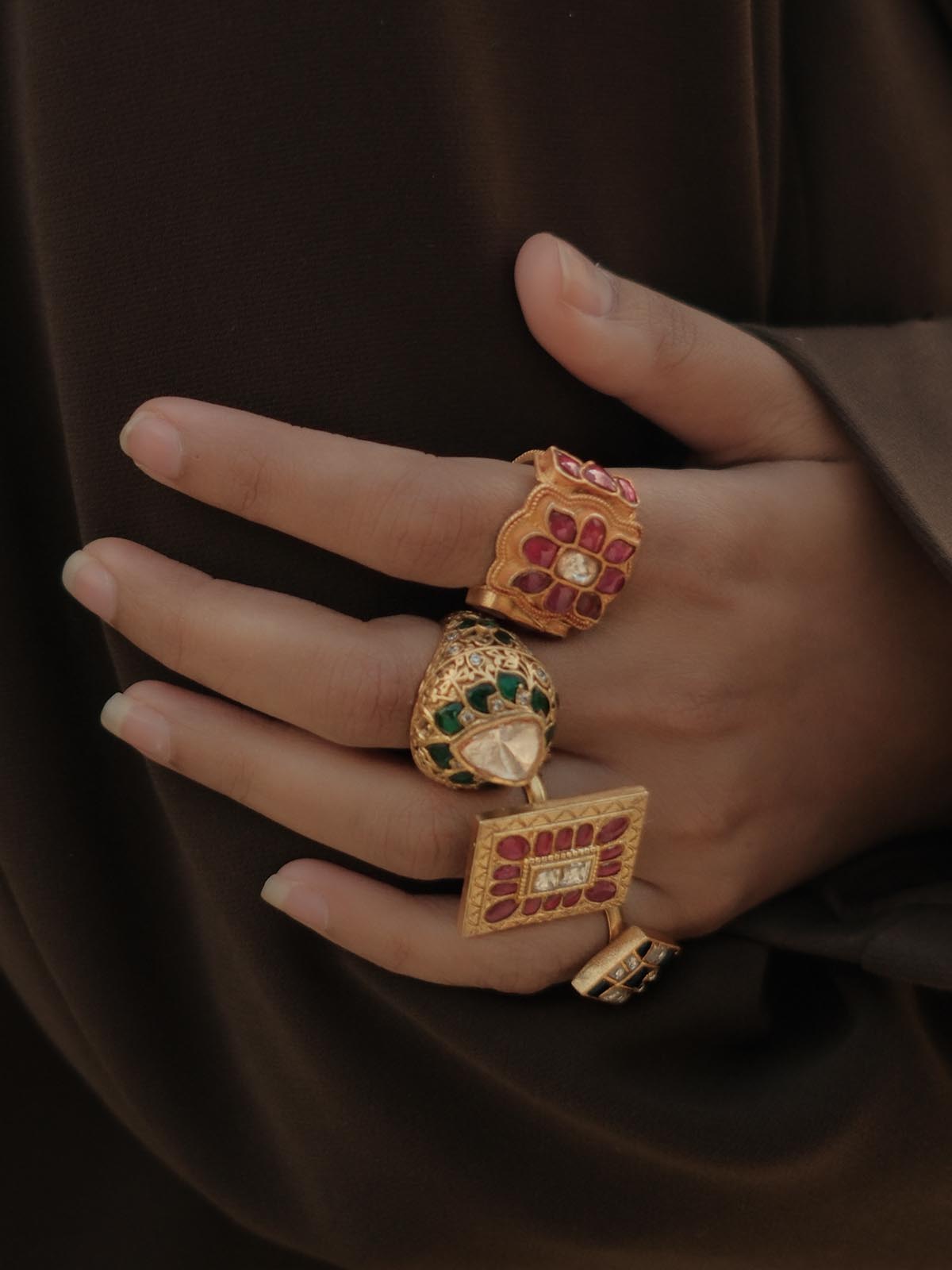 Immerse yourself in the elegance of Indian heritage with this handcrafted gold-plated wide band ring. Inspired by the by royal Mughal-era jewels, this ring features intricate floral detailing, crafted in high-quality brass with a luxurious gold-plated finish. A timeless piece that blends heritage charm with contemporary minimalism, perfect for everyday wear or as a statement accessory. This ring offers a bold yet versatile accessory for your collection. Its wide band design ensures a comfortable fit while making a statement with every wear.