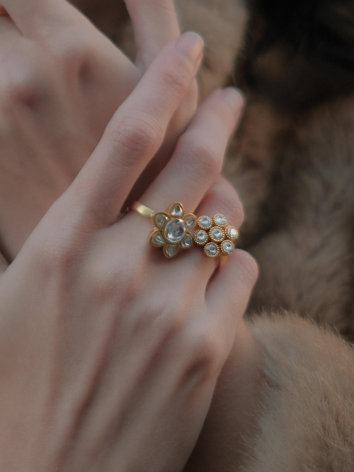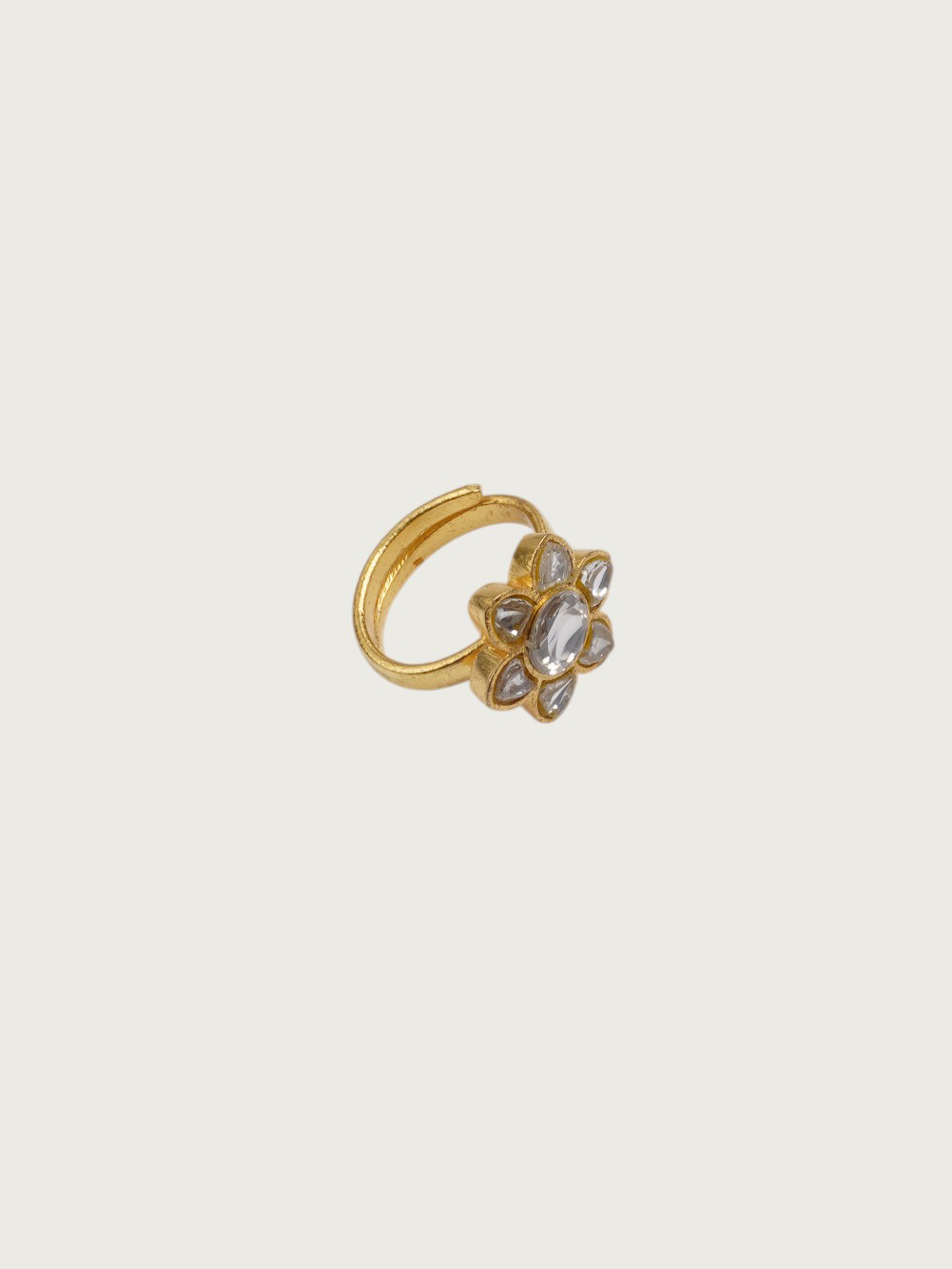 The Mughal Daisy Adjustable Ring is a charming blend of heritage and minimalism. This handcrafted ring features a delicate daisy-inspired design with intricately arranged embellishments, set in a gold-plated finish for a timeless appeal. Its floral motif evokes the elegance of Mughal craftsmanship while maintaining a modern, minimalistic style.