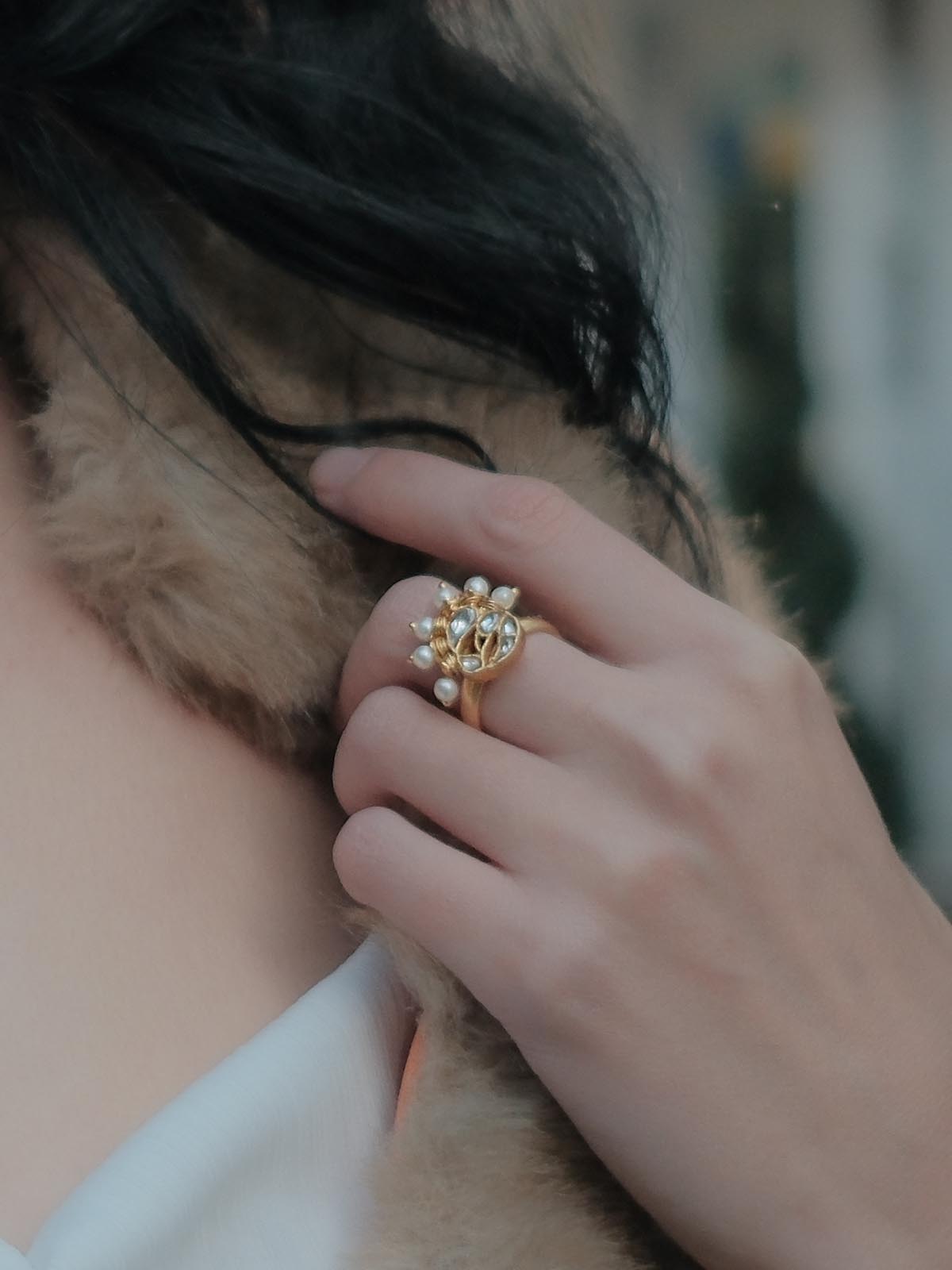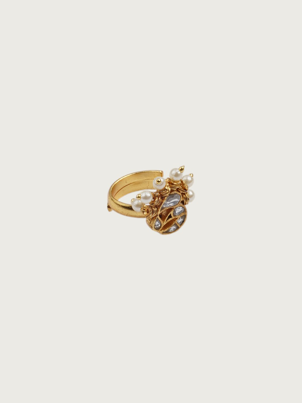The Mughal Peacock Inspired Cluster Ring is a striking blend of traditional craftsmanship and intricate detailing. Handcrafted with a delicate cluster of pearls surrounding an ornate gold-plated centerpiece, this ring embodies vintage elegance. The regal design, enhanced by fine embellishments, makes it a statement of refined artistry.