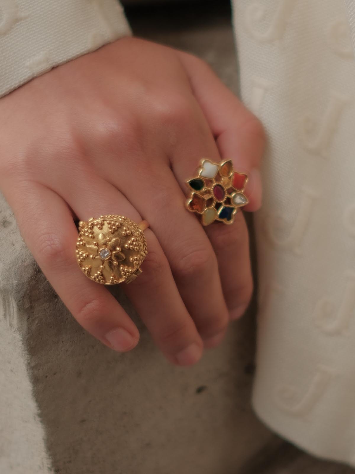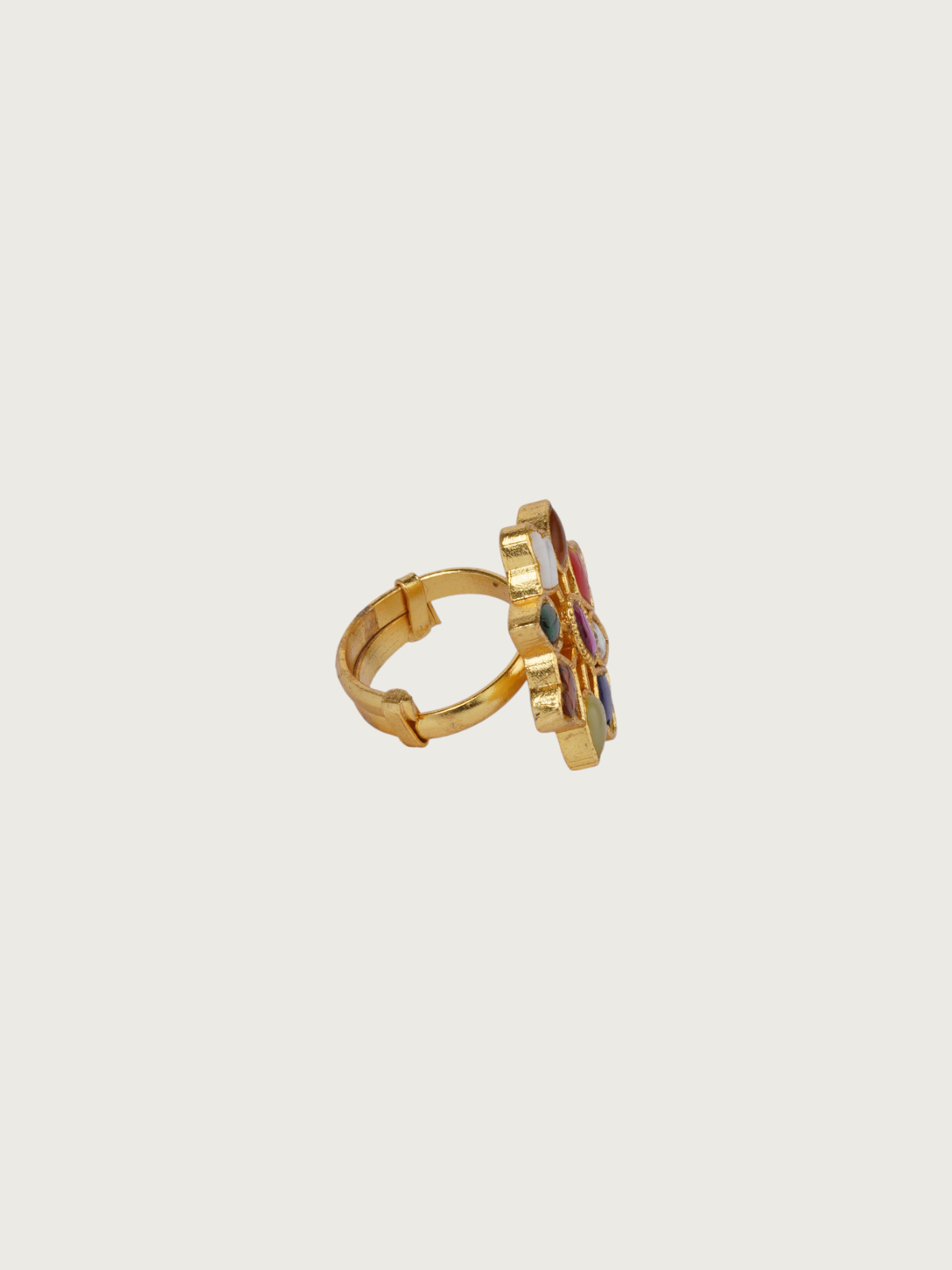 The Navratna Mughal Adjustable Ring is a vibrant celebration of heritage and craftsmanship. Inspired by traditional Indian jewelry, this handcrafted ring features a radiant floral design with colorful embellishments, symbolizing prosperity and protection. The intricate detailing and rich hues are set in a gold-plated finish, making it a statement piece with timeless appeal.
