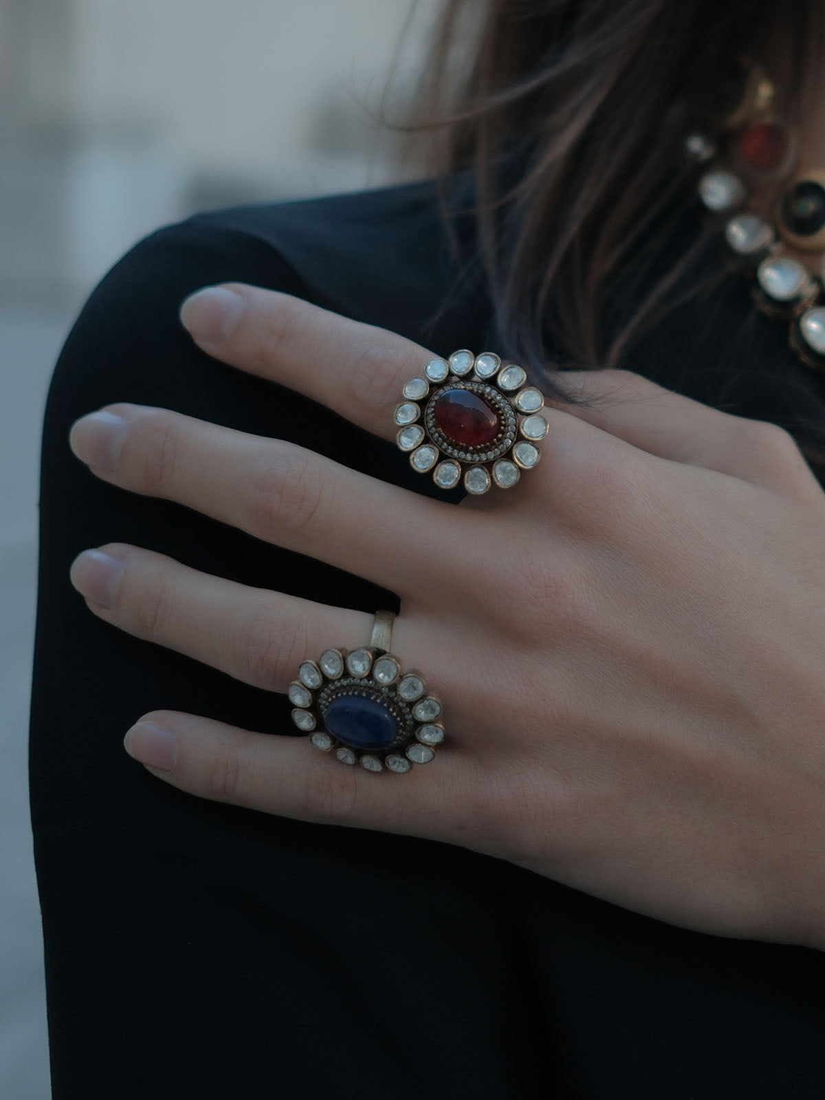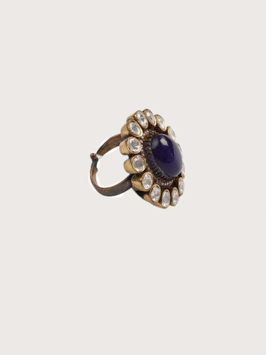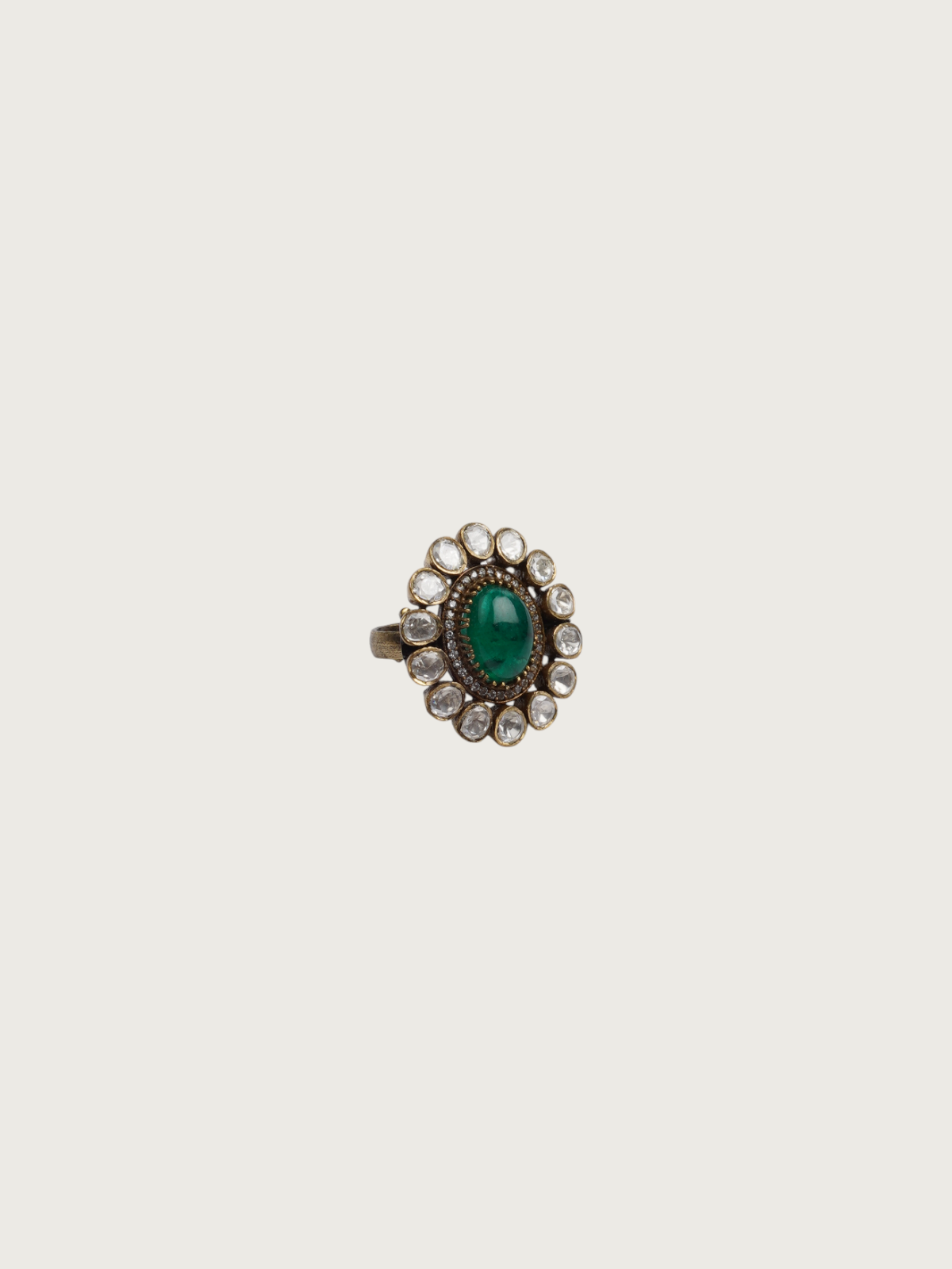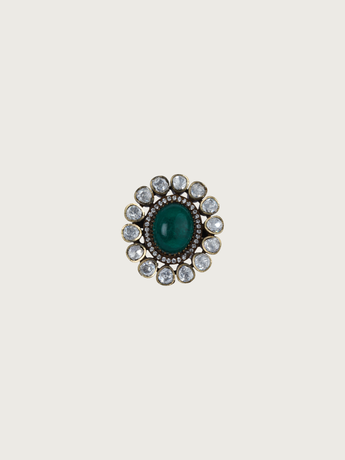 Step into the elegance of Indian royalty with this Mughal-inspired statement ring, featuring a rich cabochon stone encircled by an exquisite floral setting of polki-style clear stones. The victorian-plated brass band enhances its vintage charm, making it a stunning heirloom-inspired piece for those who appreciate regal aesthetics.