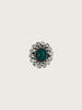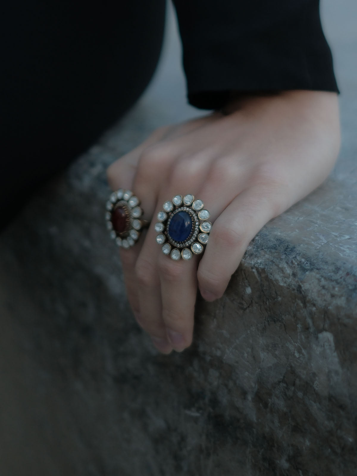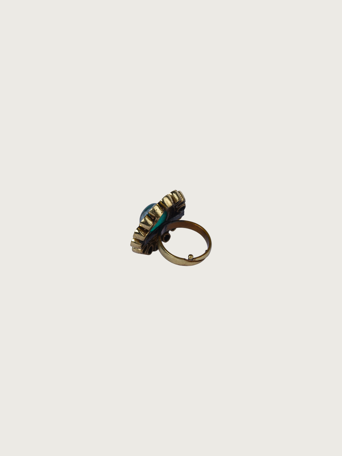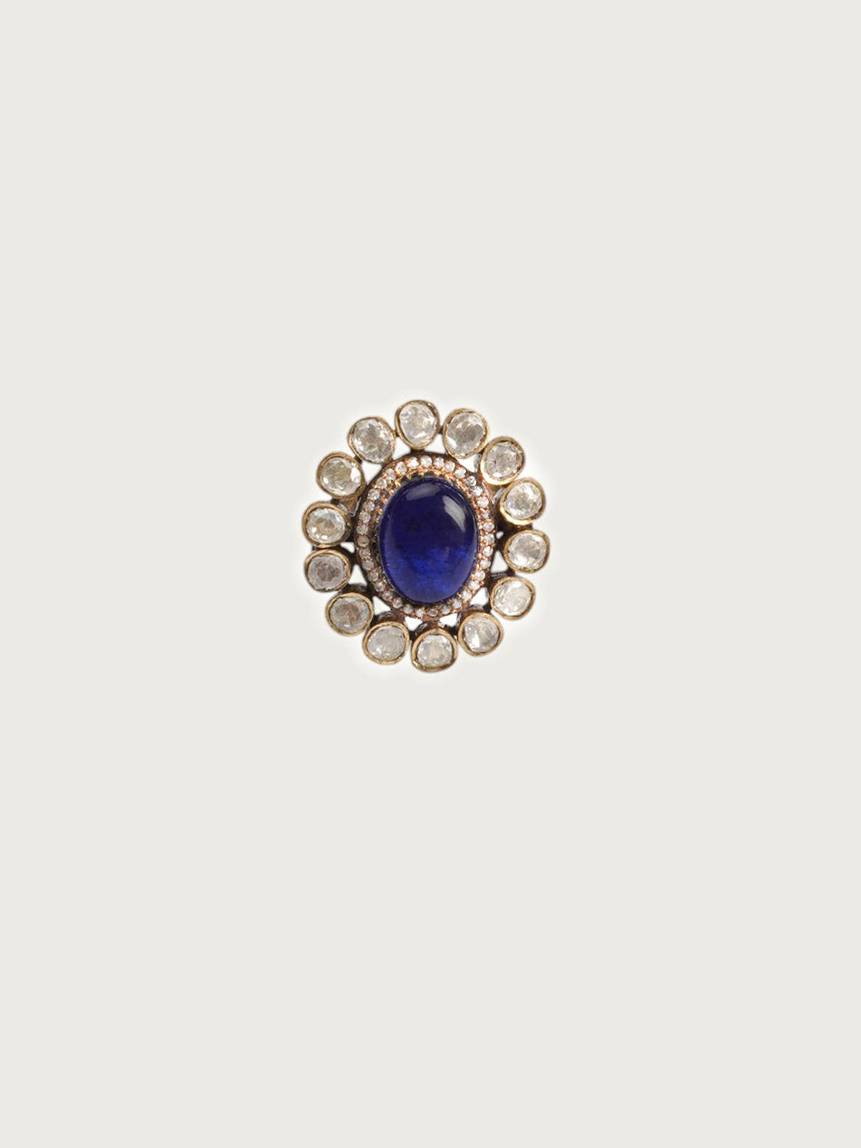 Step into the elegance of Indian royalty with this Mughal-inspired statement ring, featuring a rich cabochon stone encircled by an exquisite floral setting of polki-style clear stones. The victorian-plated brass band enhances its vintage charm, making it a stunning heirloom-inspired piece for those who appreciate regal aesthetics.