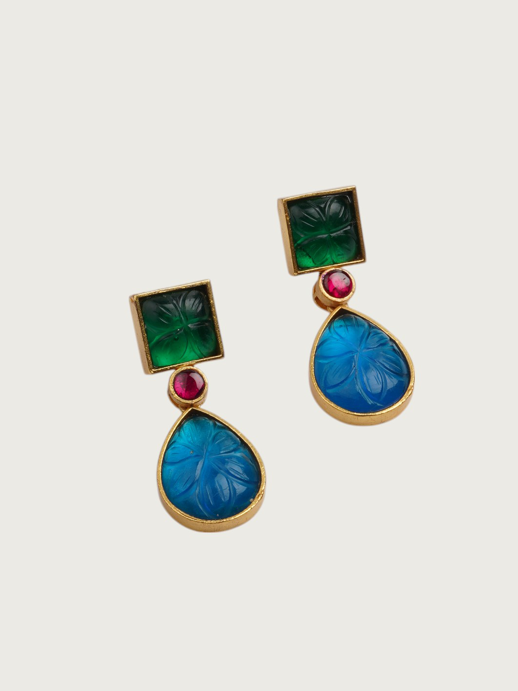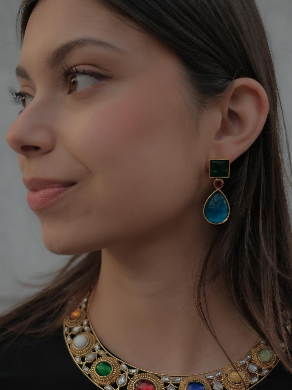 Set in gold-plated brass, the intricate carvings on the gemstones reflect a heritage craftsmanship, making these earrings a statement piece for elegant evening wear, or refined daily styling.