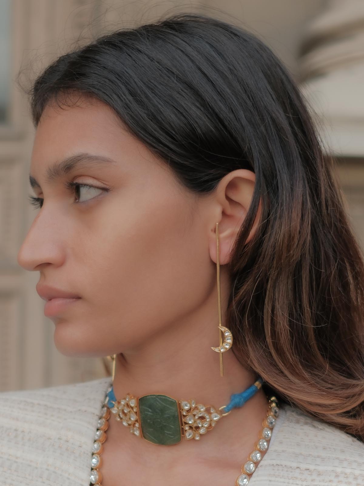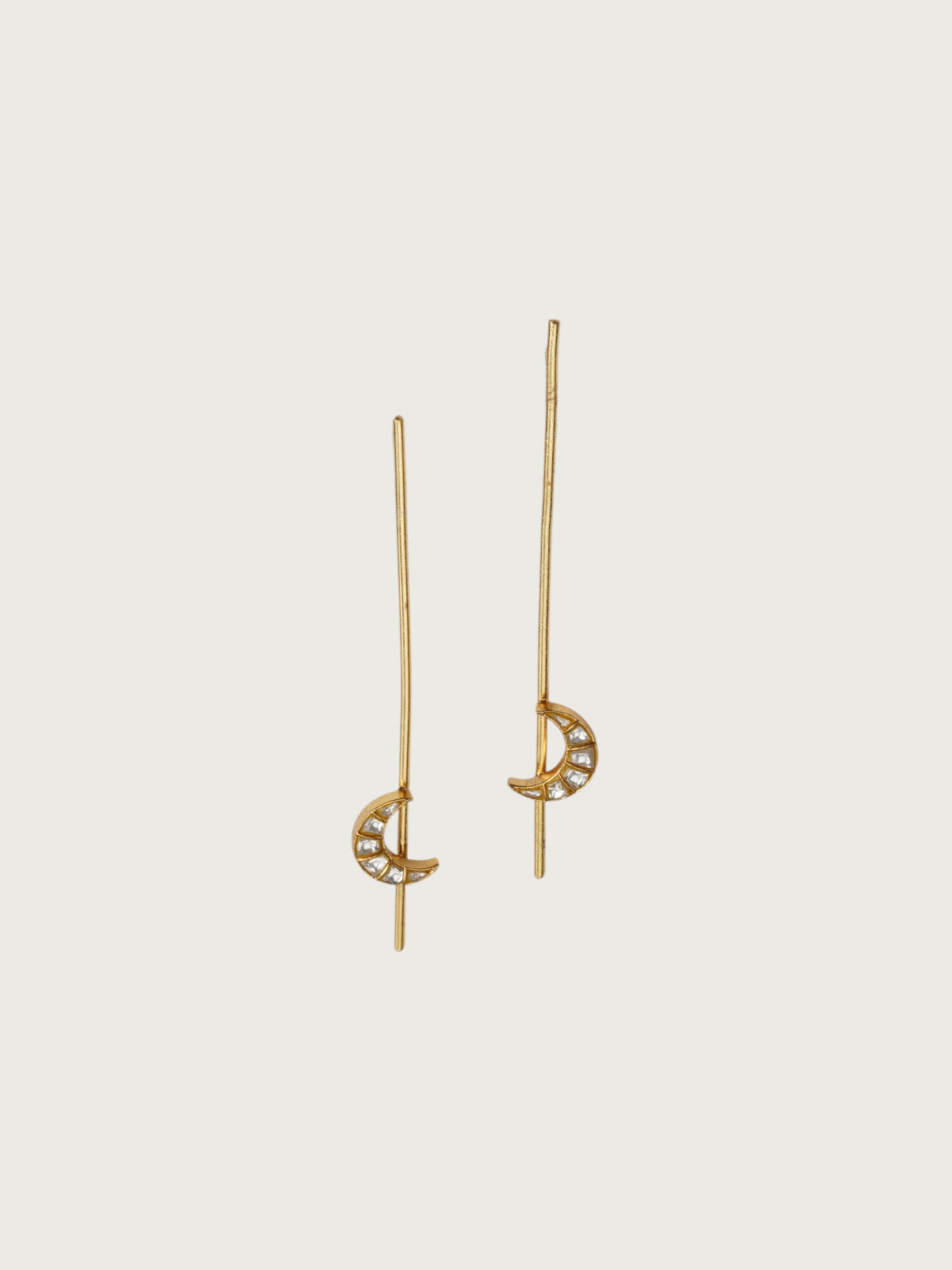 A celestial-inspired piece, these handcrafted gold crescent moon earrings offer a perfect blend of minimalism and Mughal elegance. The delicate polki-style jadau stones embedded in the crescent add a subtle sparkle, while the sleek gold-plated drop design creates a modern, airy aesthetic.