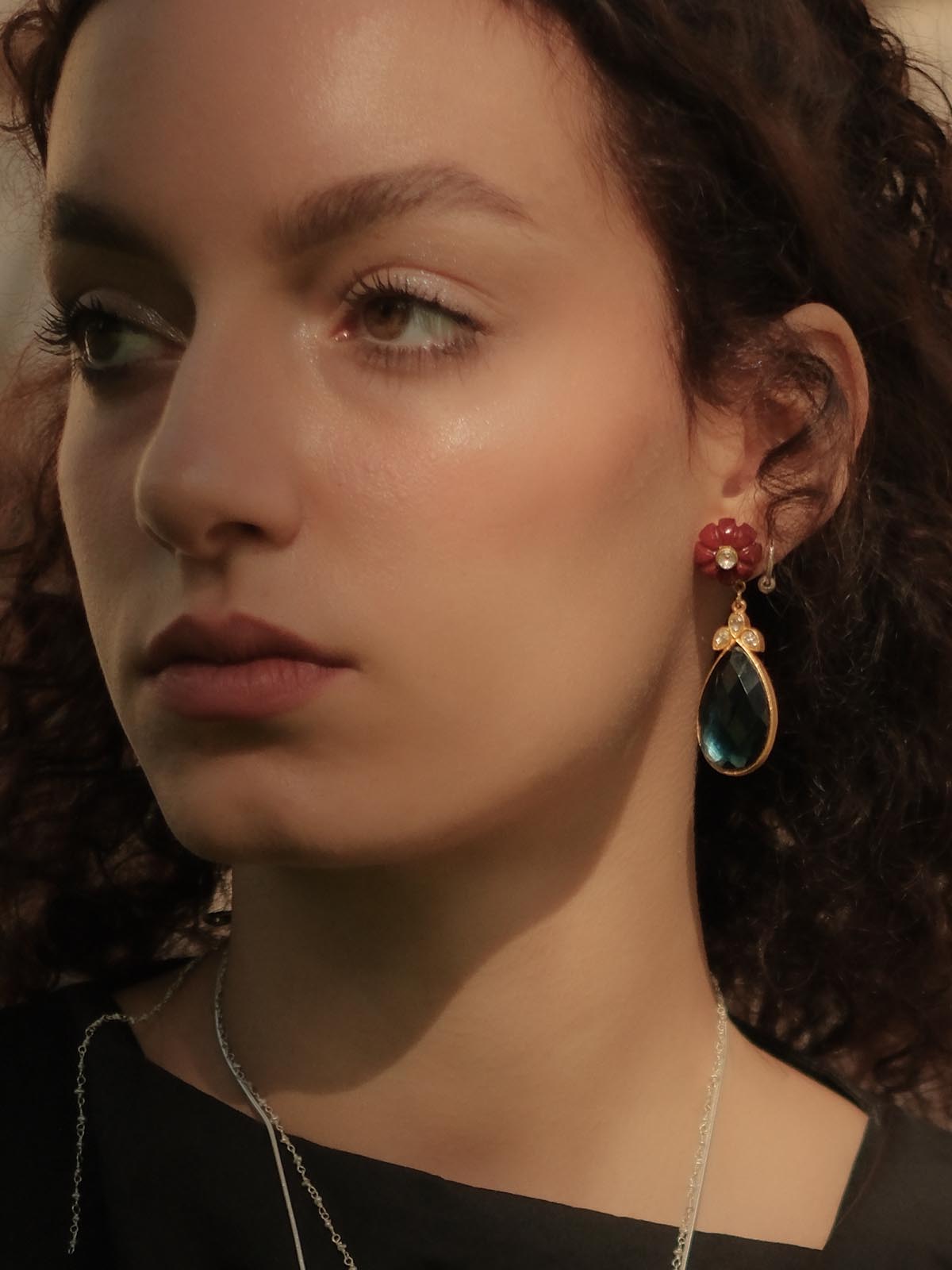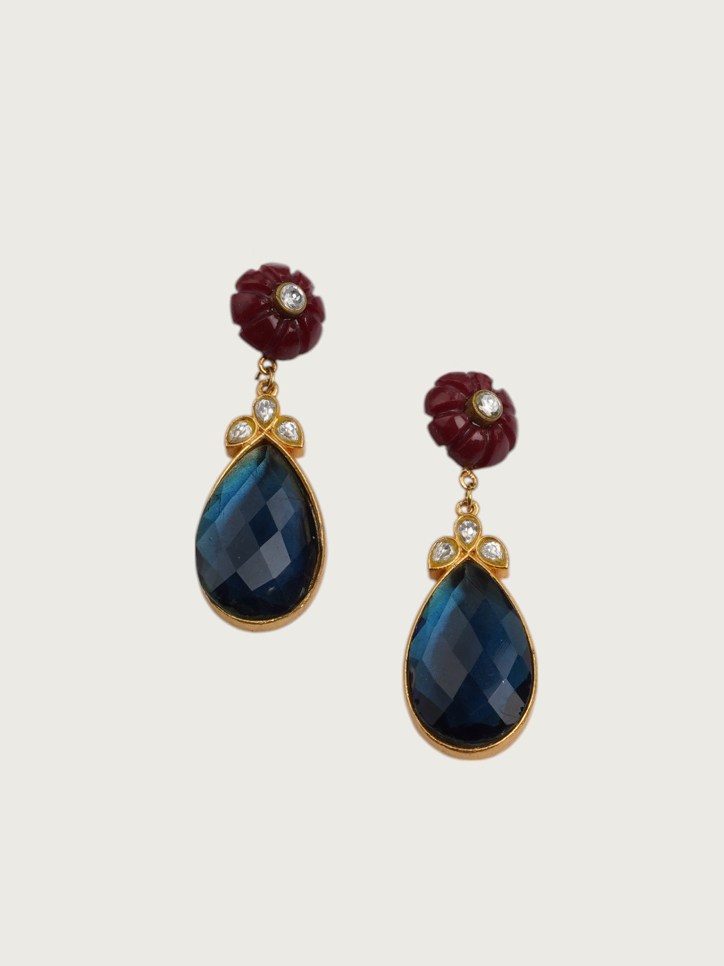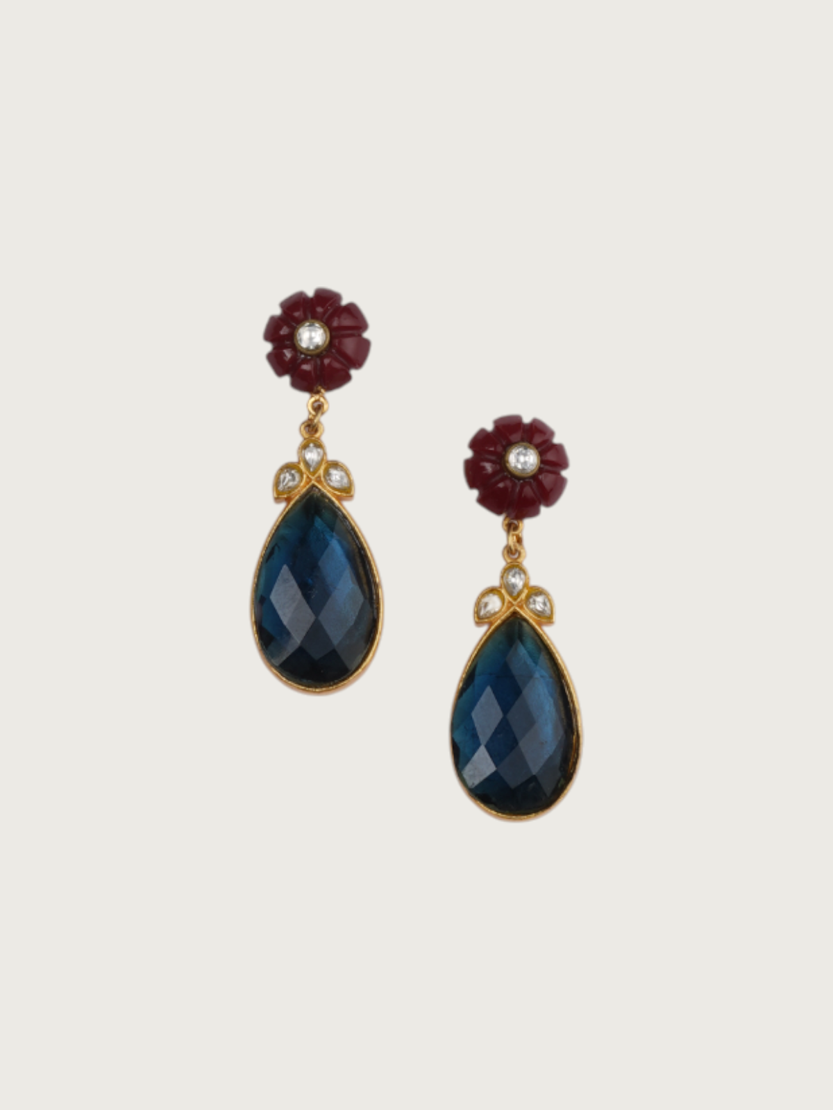 A tribute to Mughal elegance, these handcrafted midnight blue teardrop earrings exude sophistication and charm. Featuring a faceted deep blue stone set in a gold-plated brass frame, these earrings are adorned with a rich burgundy floral stud and delicate kundan-style accents, offering a regal yet minimal aesthetic.