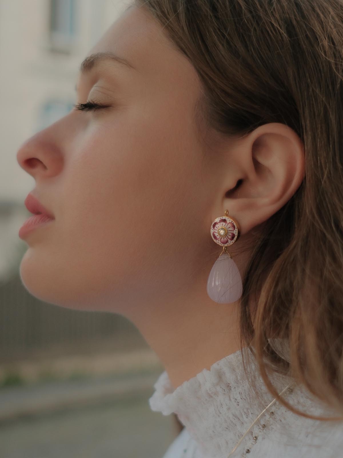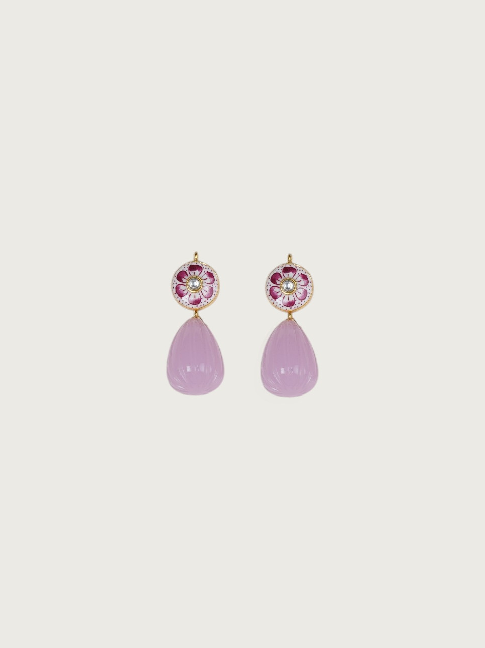 Immerse yourself in the grandeur of Mughal artistry with these exquisite gold-plated enamel and carved baby pink drop earrings. Featuring intricately hand-painted floral enamel work on the stud and a beautifully carved, these earrings echo the luxury of royal Indian jewels. Crafted in brass with fine enamel detailing, they blend heritage elegance with modern minimalism, making them a timeless statement piece.