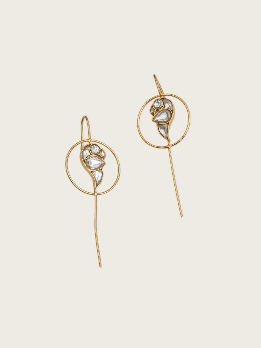 Elevate your elegance with these minimalist Kundan drop earrings, featuring a modern abstract design with delicate gold-plated wirework. The fluid structure gracefully holds hand-cut Kundan stones, blending contemporary aesthetics with heritage craftsmanship.
