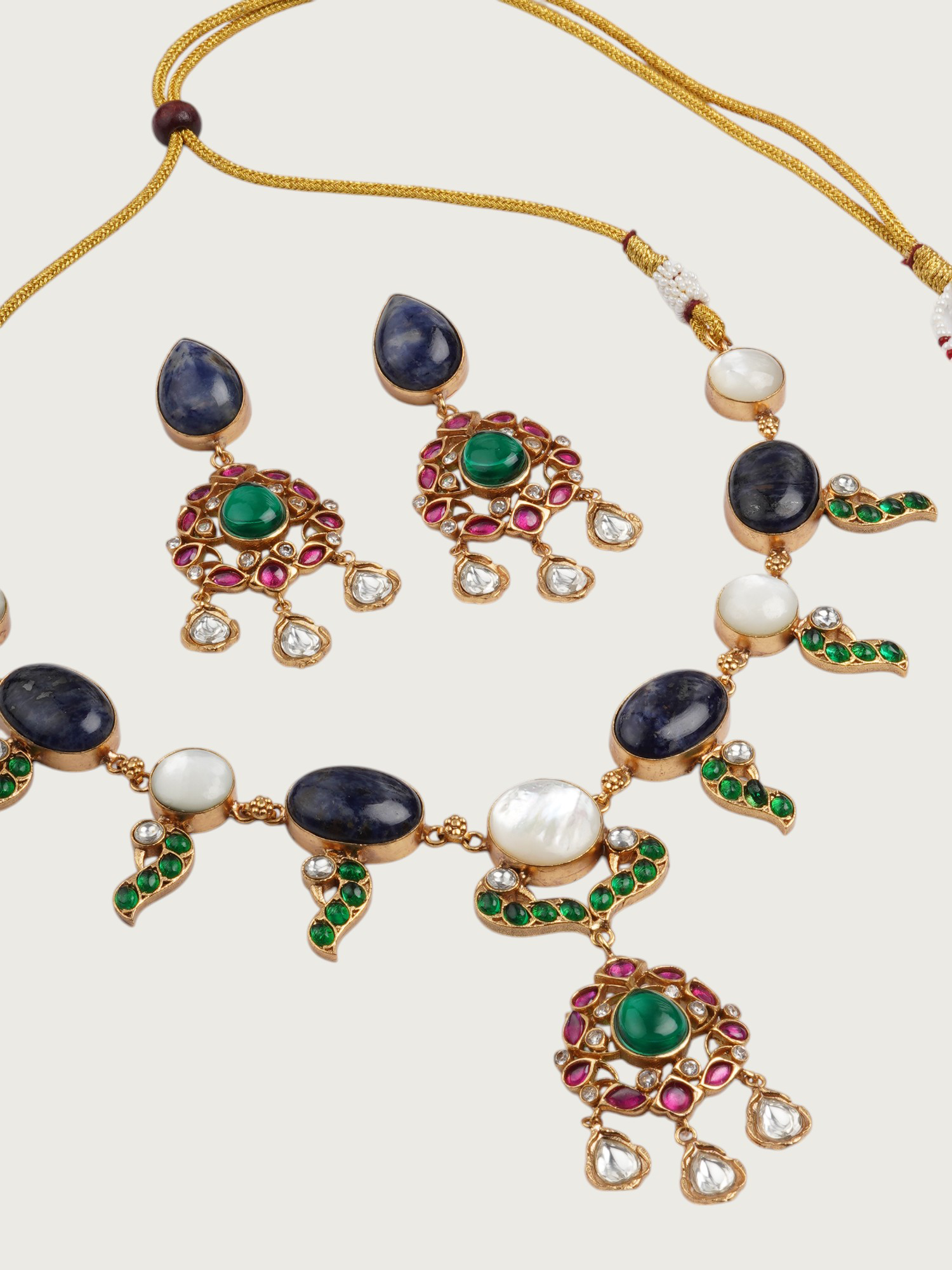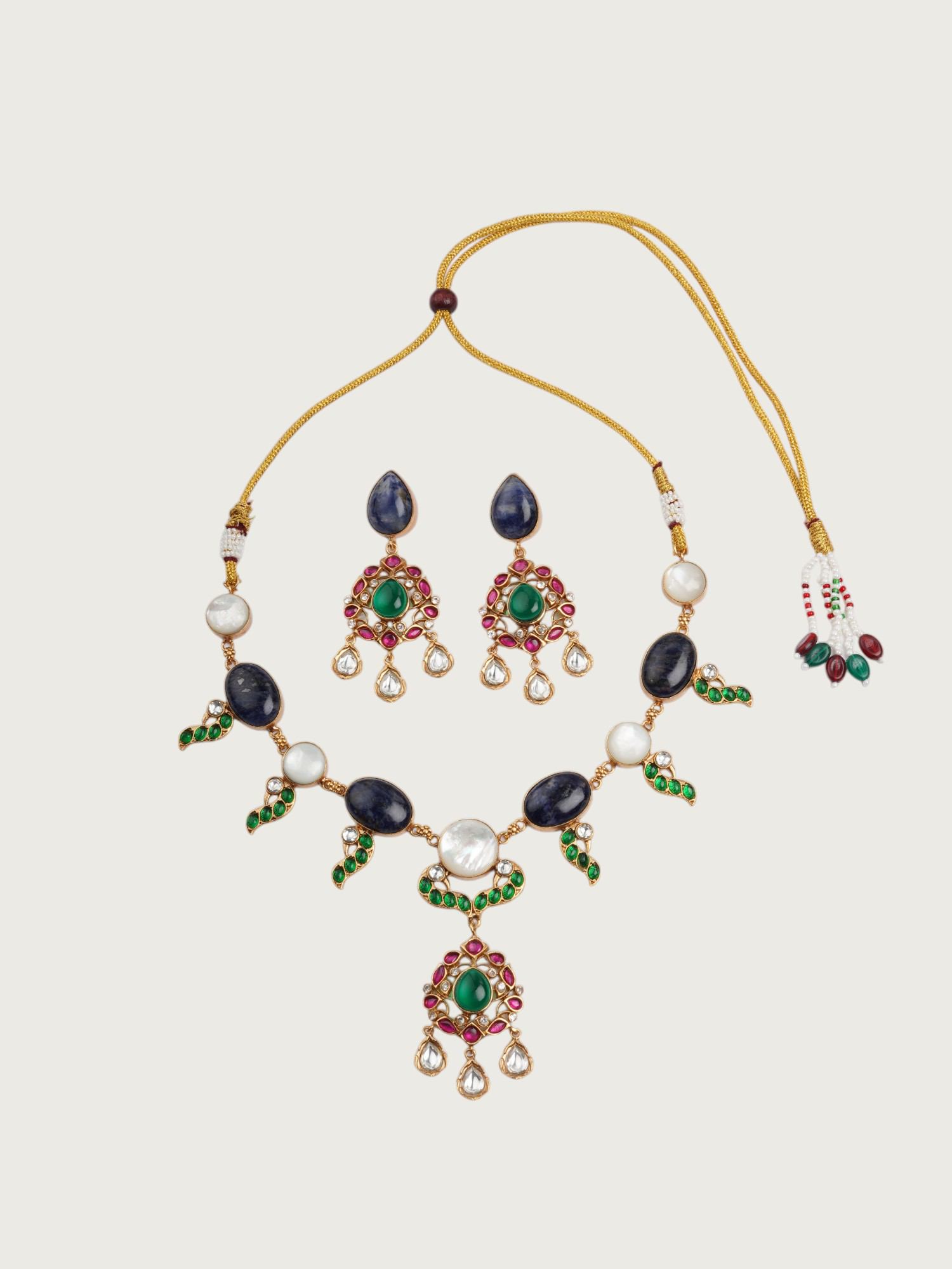Elevate your jewellery collection with this exquisite Kundan necklace set, featuring a harmonious blend of green, pink, blue and pearls. Handcrafted in a traditional royal design, this set is perfect for luxury statement styling. The gold-plated necklace is adorned with uncut polki diamonds, lustrous pearls making it a timeless treasure.