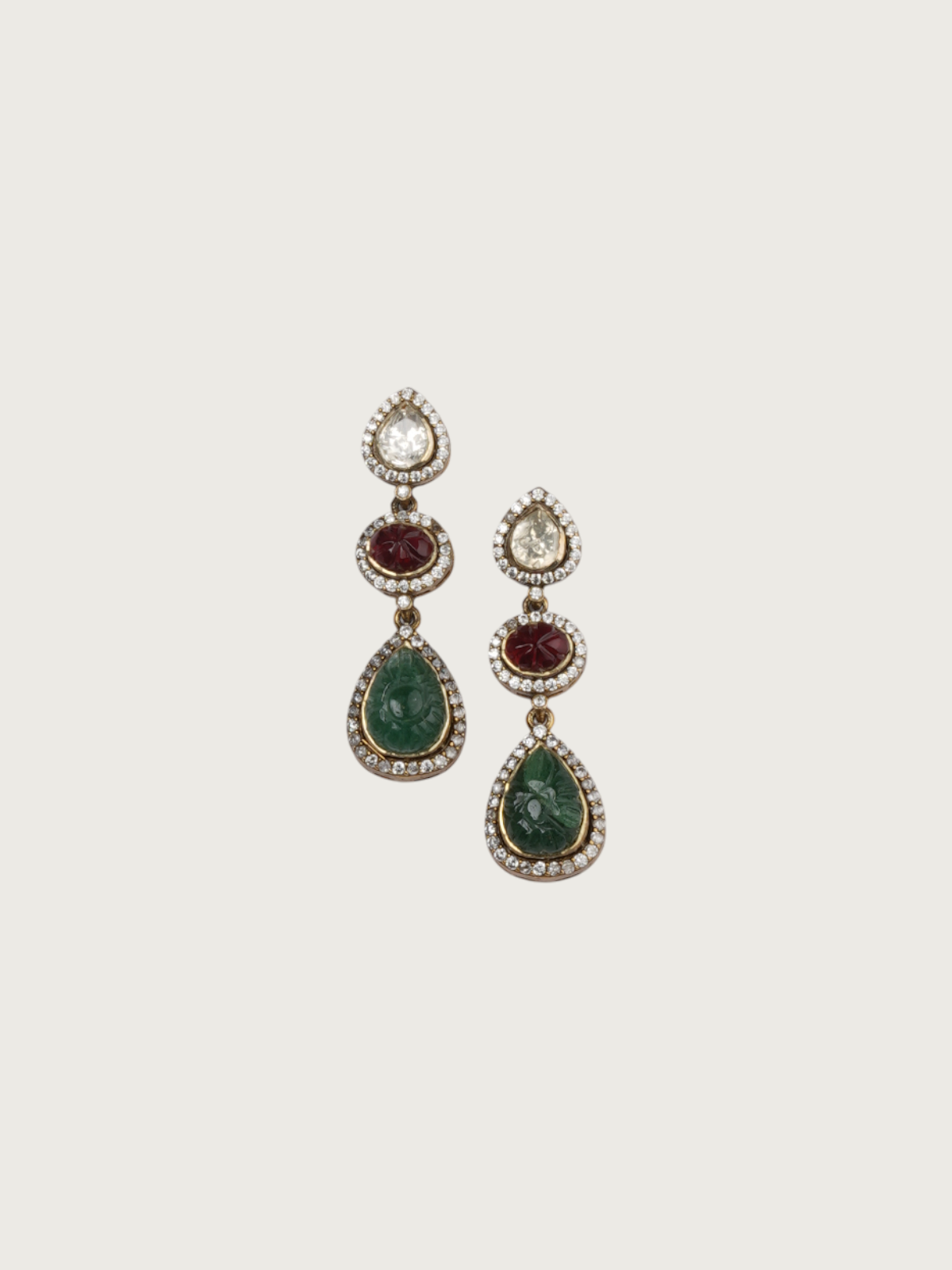 These handcrafted gold-plated earrings feature a regal trio of drops — a sparkling white teardrop top, a rich red oval center, and a carved green teardrop base. Each layer is framed with diamond-like detailing, creating a radiant play of color and light.