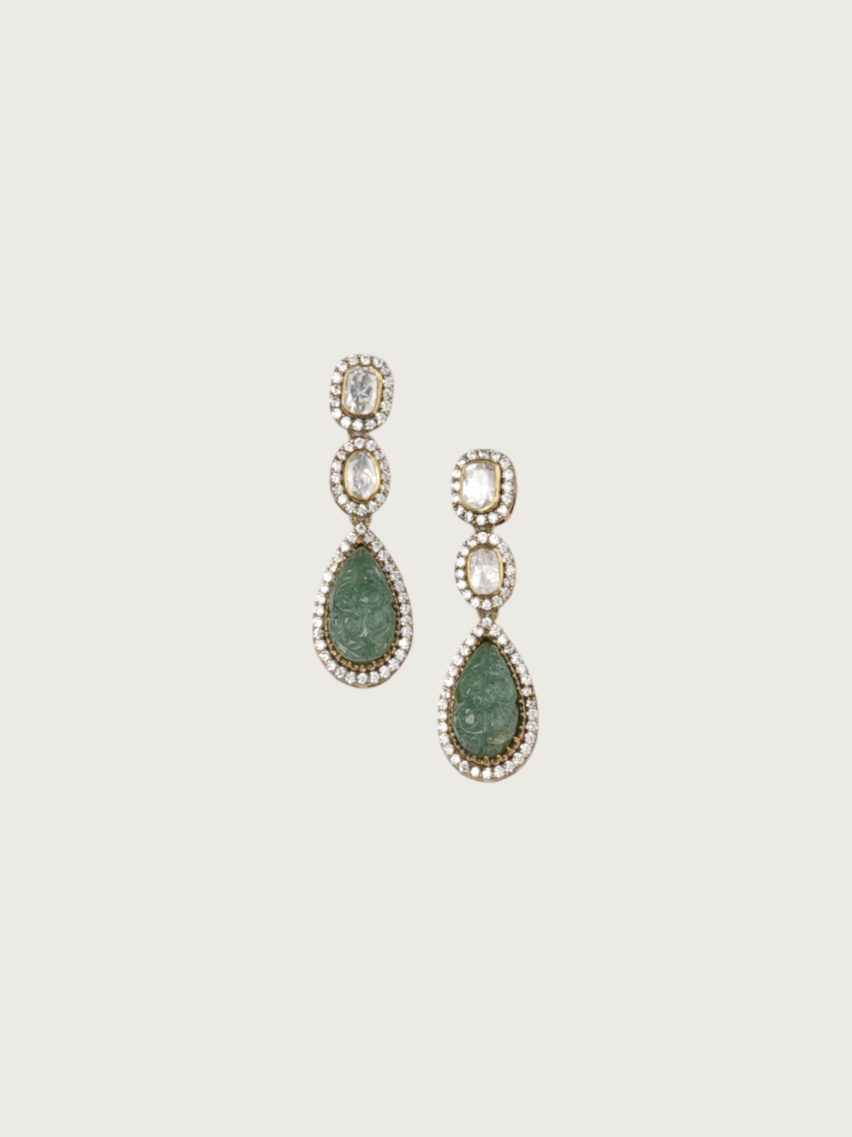 These handcrafted gold-plated earrings feature a graceful dual-drop silhouette with two luminous white stones leading into a carved green teardrop base. Each element is framed in a halo of diamond-like detailing, adding radiant sparkle and depth to the design.