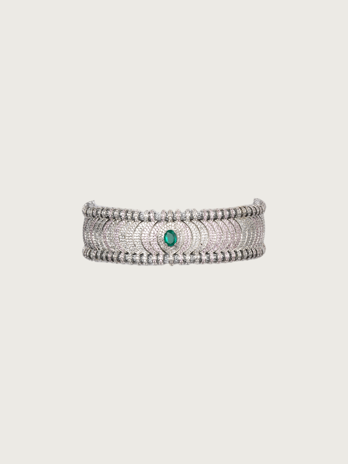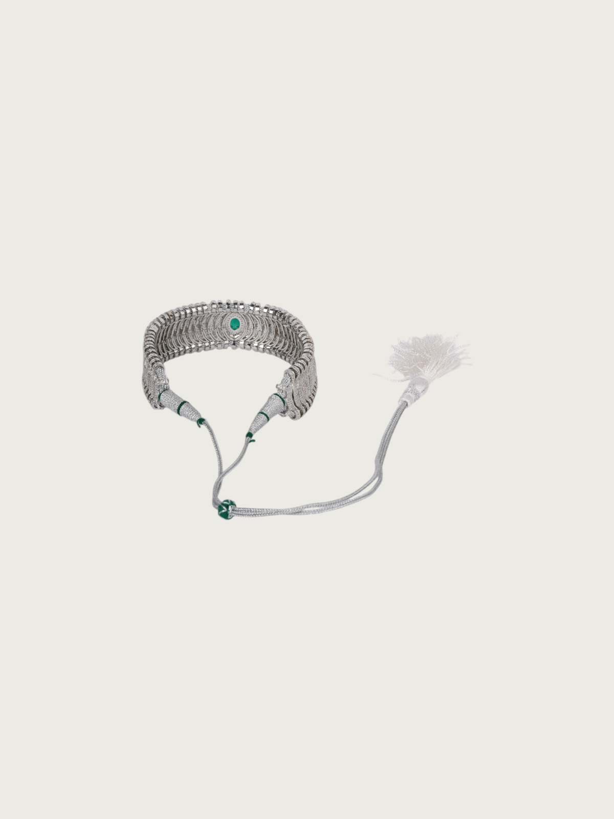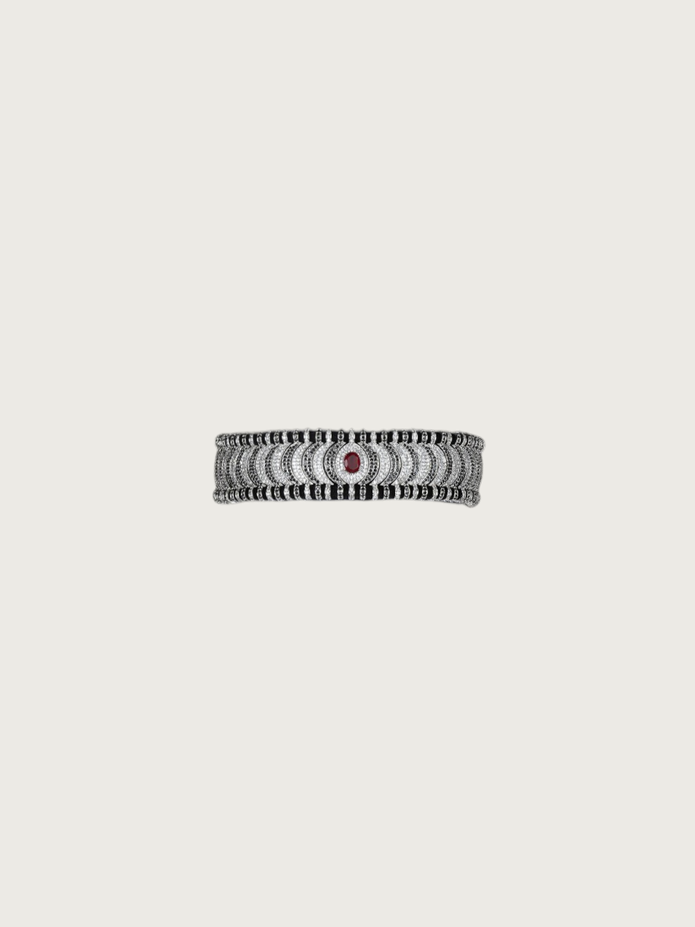 A versatile trio of handcrafted silver-toned adjustable bracelets that blend traditional detailing with a contemporary silhouette. Each bracelet features intricate texturing and a single bold centerpiece — a deep green or rich red stone — that adds character to the minimalist design.