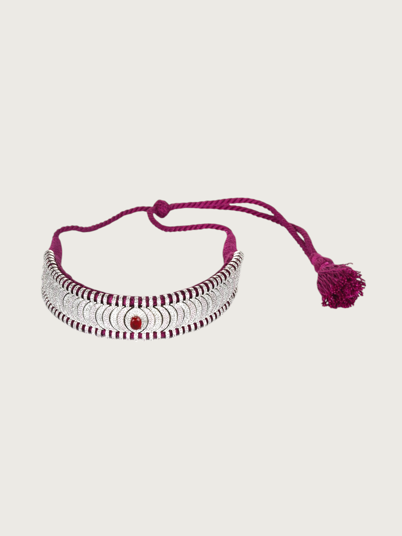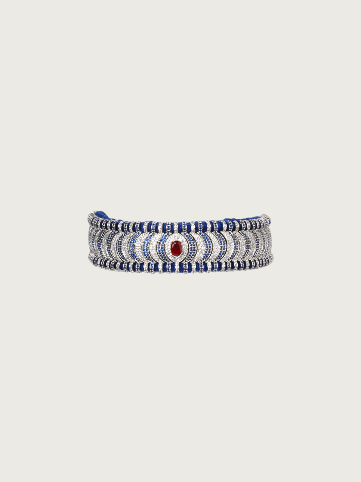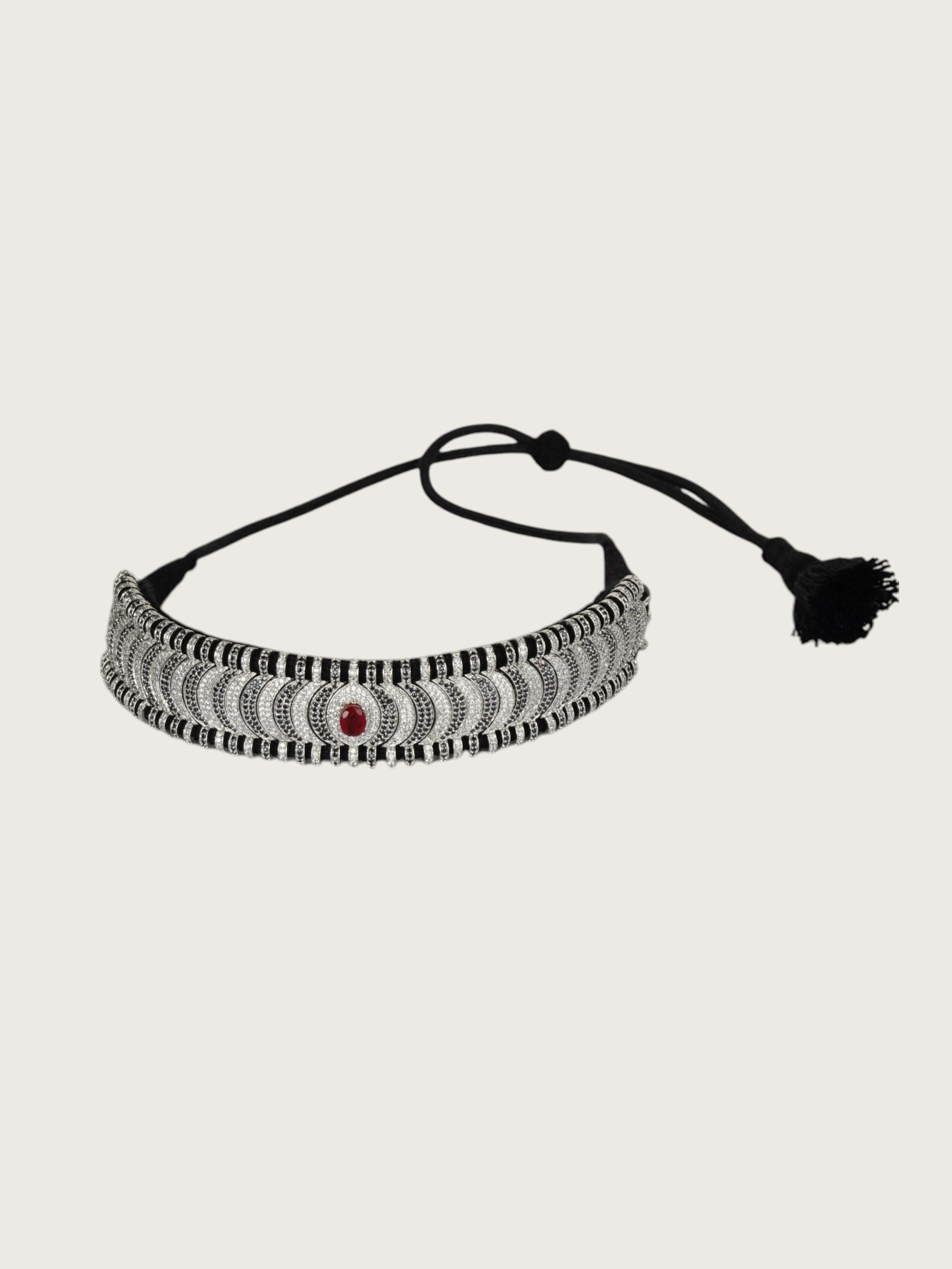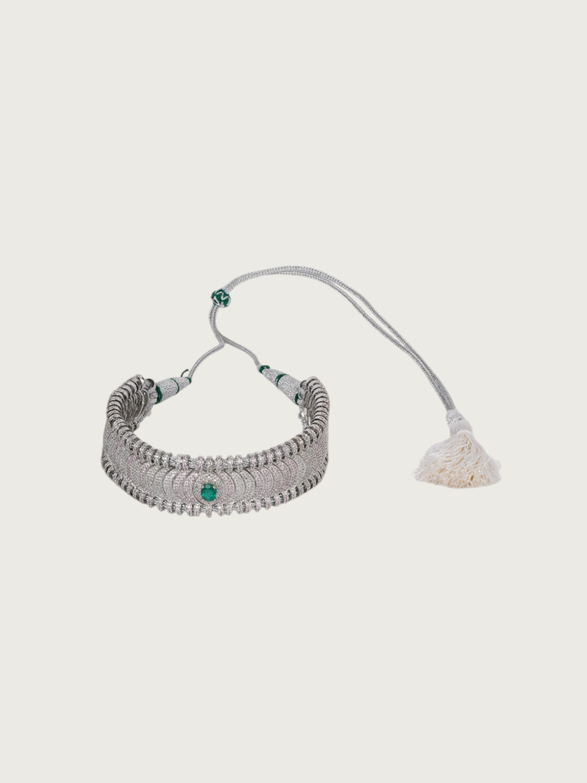 A versatile trio of handcrafted silver-toned adjustable bracelets that blend traditional detailing with a contemporary silhouette. Each bracelet features intricate texturing and a single bold centerpiece — a deep green or rich red stone — that adds character to the minimalist design.