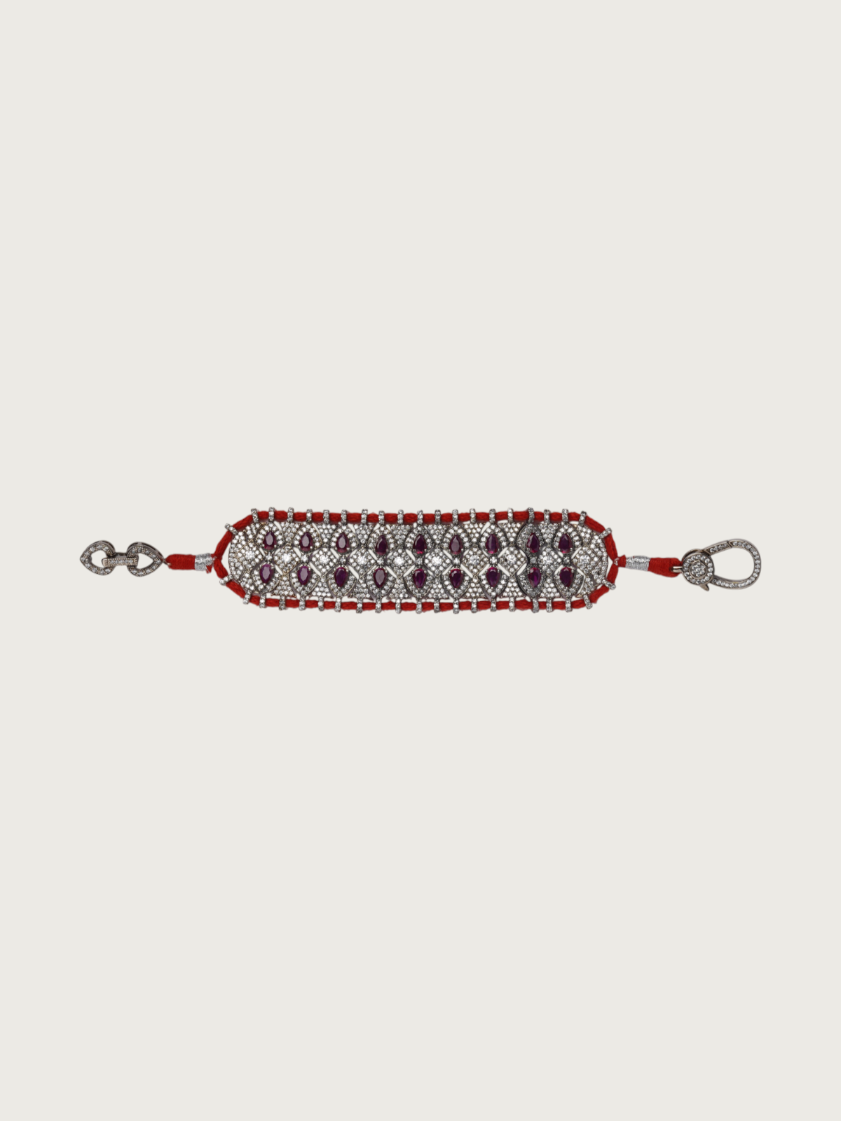 Crafted with an eye for detail, this Tver bracelet combines rich red thread with oxidized silver artistry and pink-toned crystal accents. The intricate openwork design adds dimension, while the vivid color contrast brings modern vibrance to traditional craft.