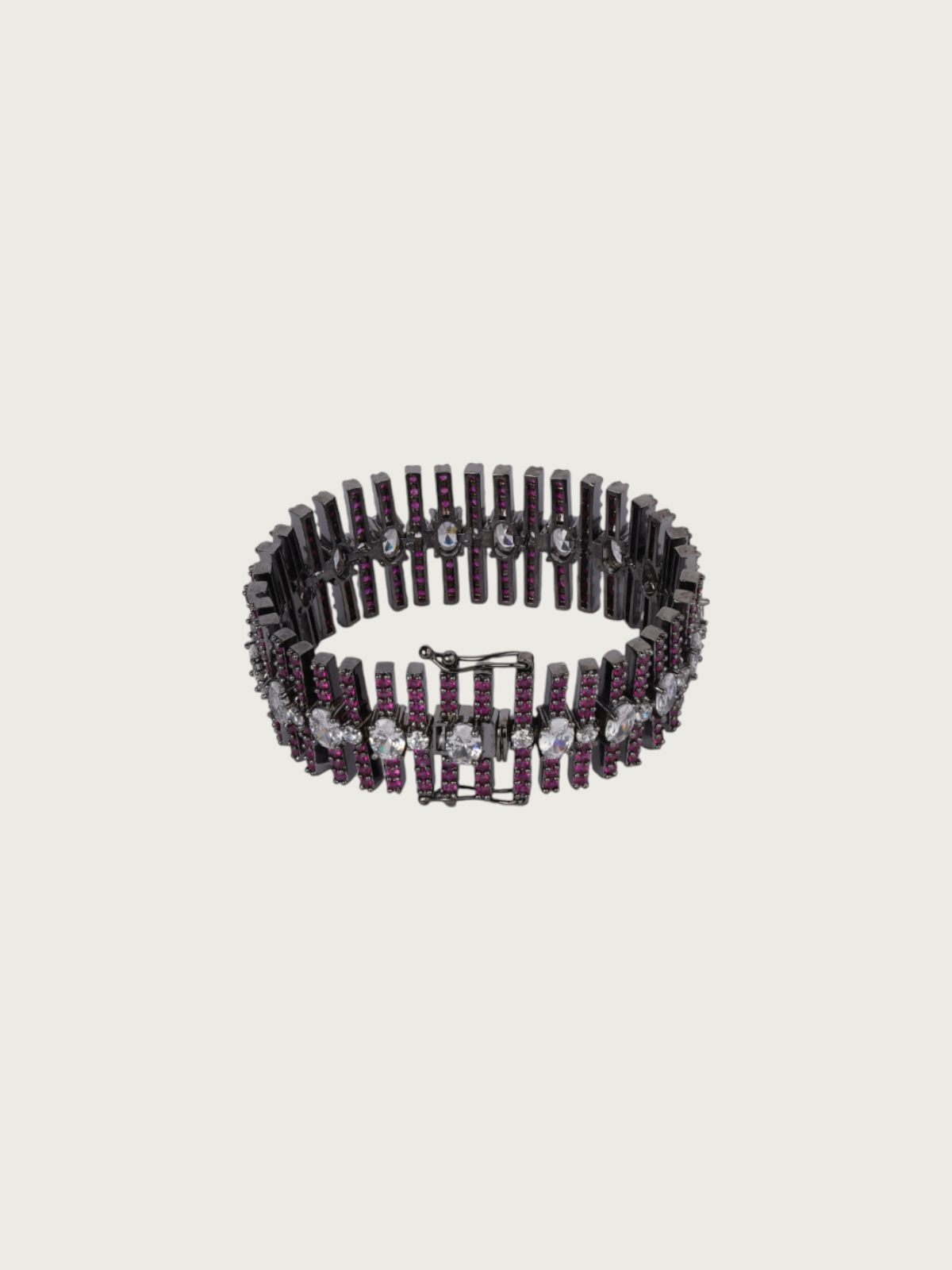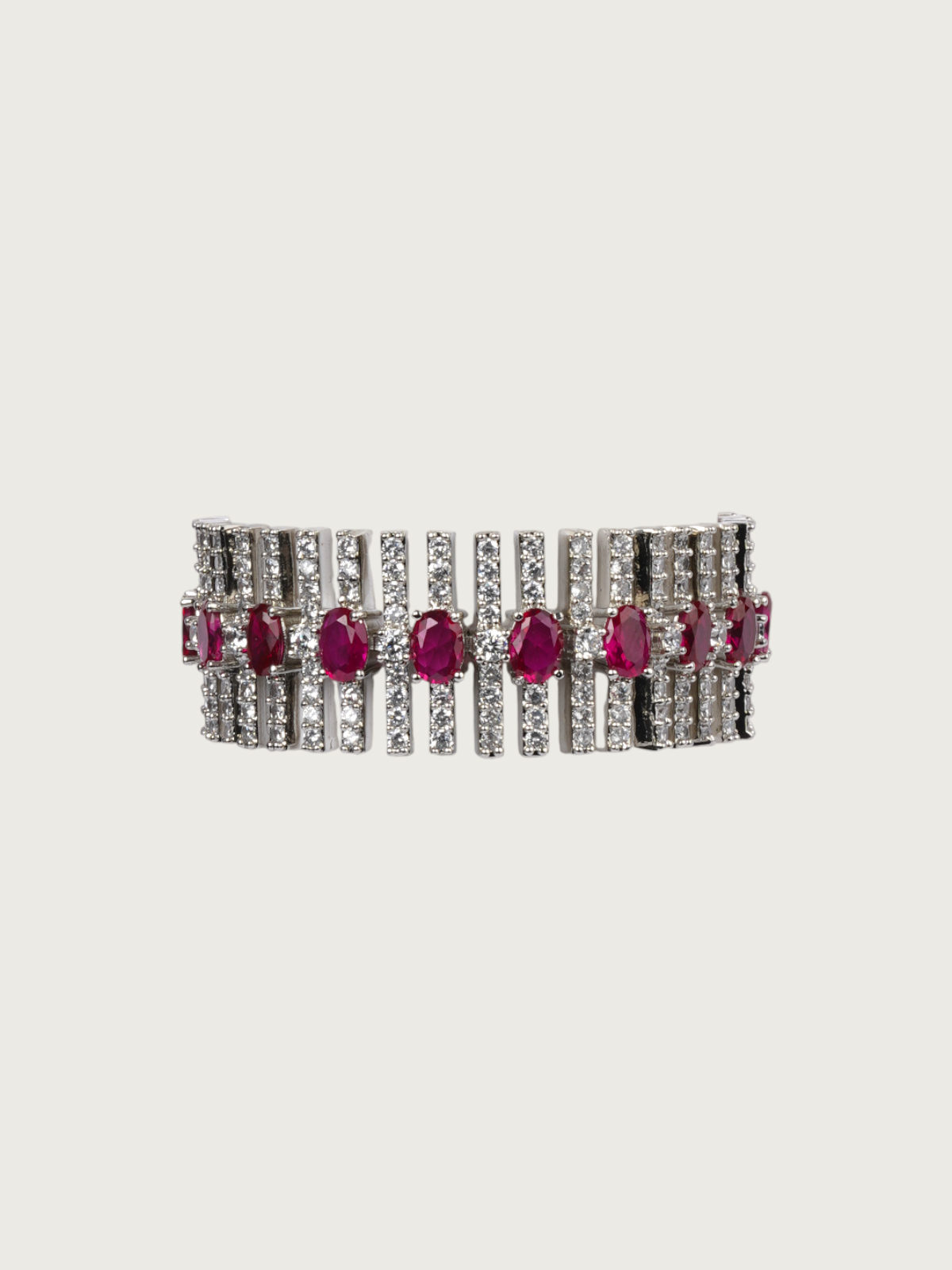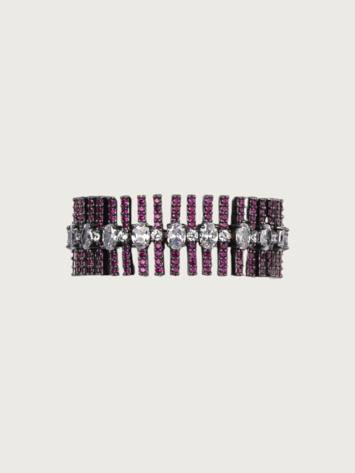 This elegant Tver bracelet features a bold interplay of pink and white stones set in vertical rows along a polished silver-toned frame. Each crystal is precisely aligned to create a striking contrast and rhythmic flow of light. Ideal for those who appreciate refined craftsmanship and modern glamour.