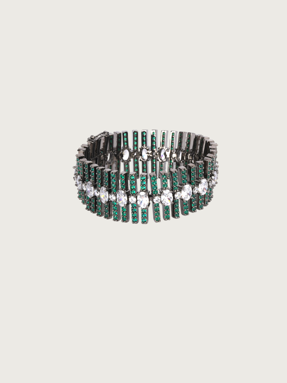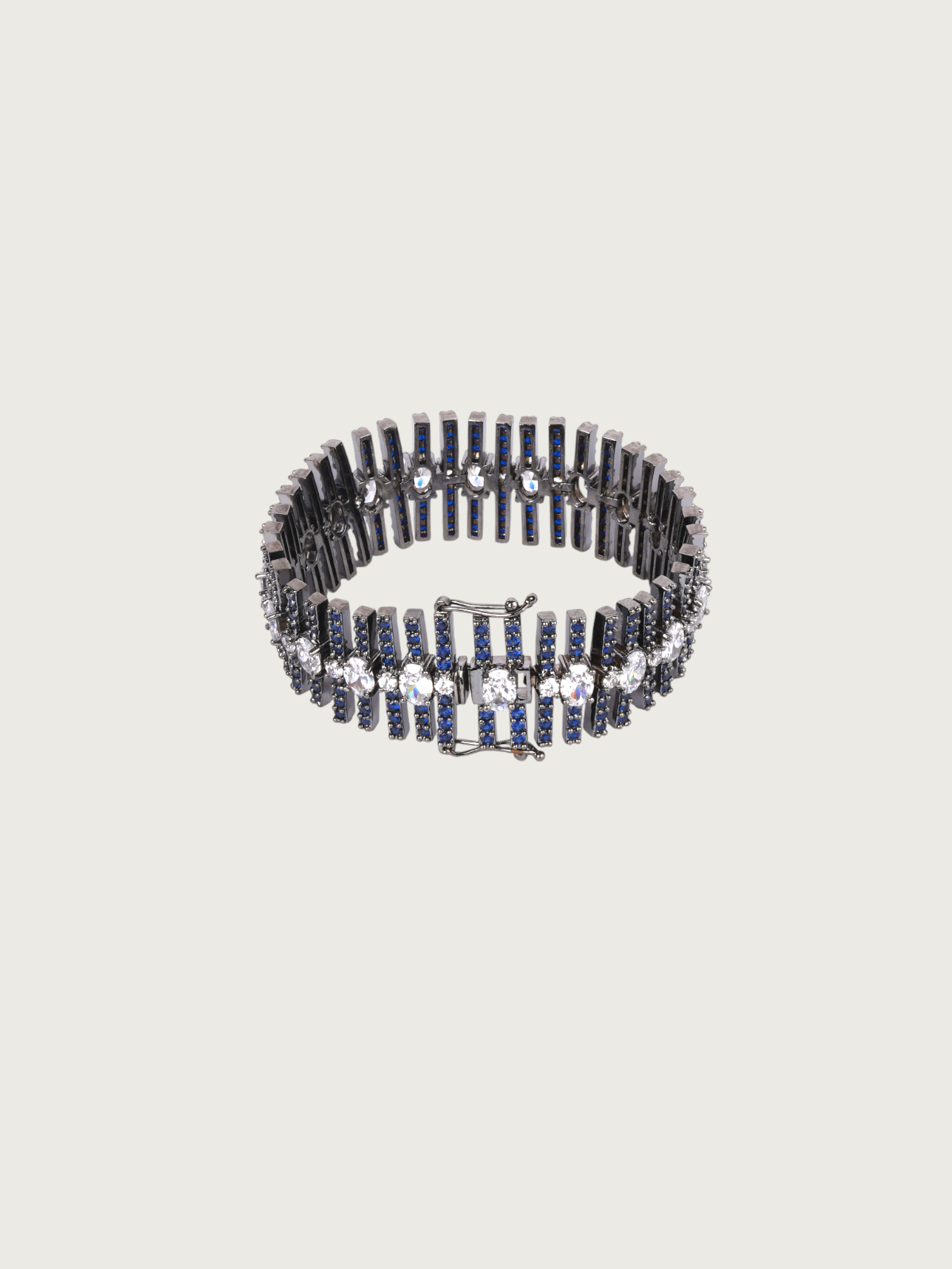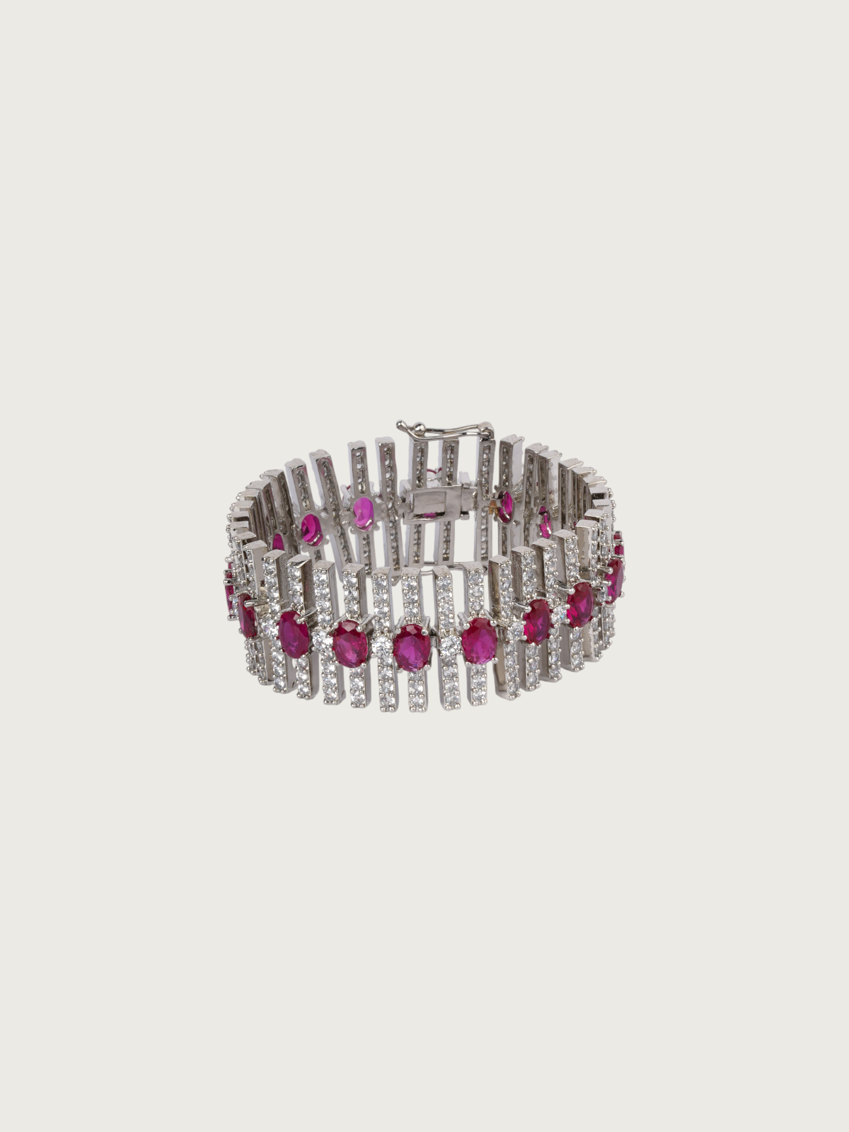 This elegant Tver bracelet features a bold interplay of pink and white stones set in vertical rows along a polished silver-toned frame. Each crystal is precisely aligned to create a striking contrast and rhythmic flow of light. Ideal for those who appreciate refined craftsmanship and modern glamour.