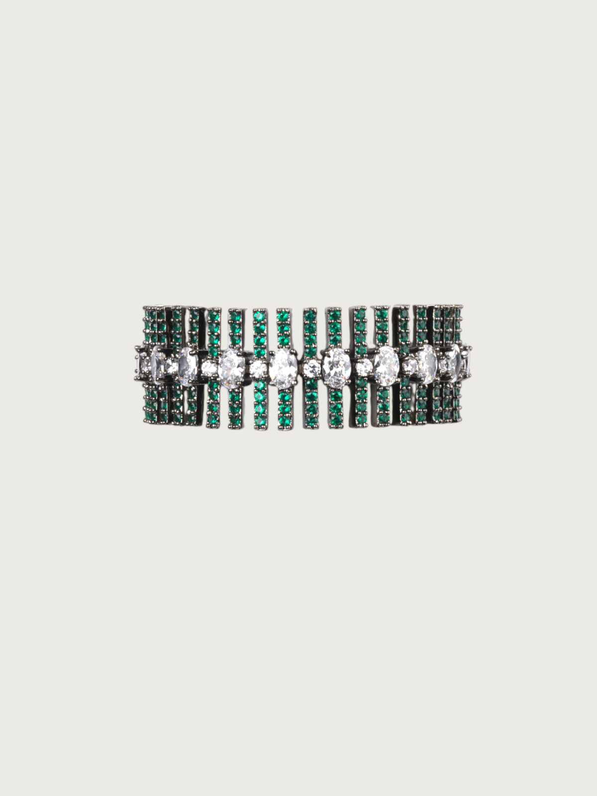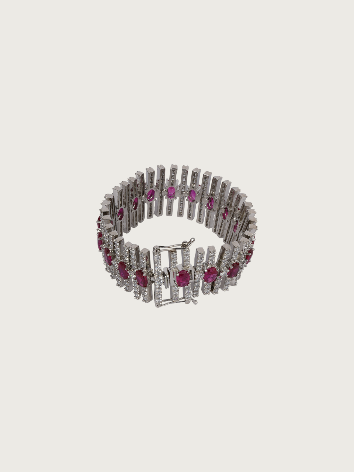 A bold and modern design from Tver, this bracelet showcases a geometric pattern of alternating pink and white crystals set in a sleek silver-toned frame. The refined arrangement of stones gives it a dynamic shimmer and architectural appeal. A piece that beautifully bridges classic radiance with a contemporary edge, perfect for elevating both modern and traditional styles.