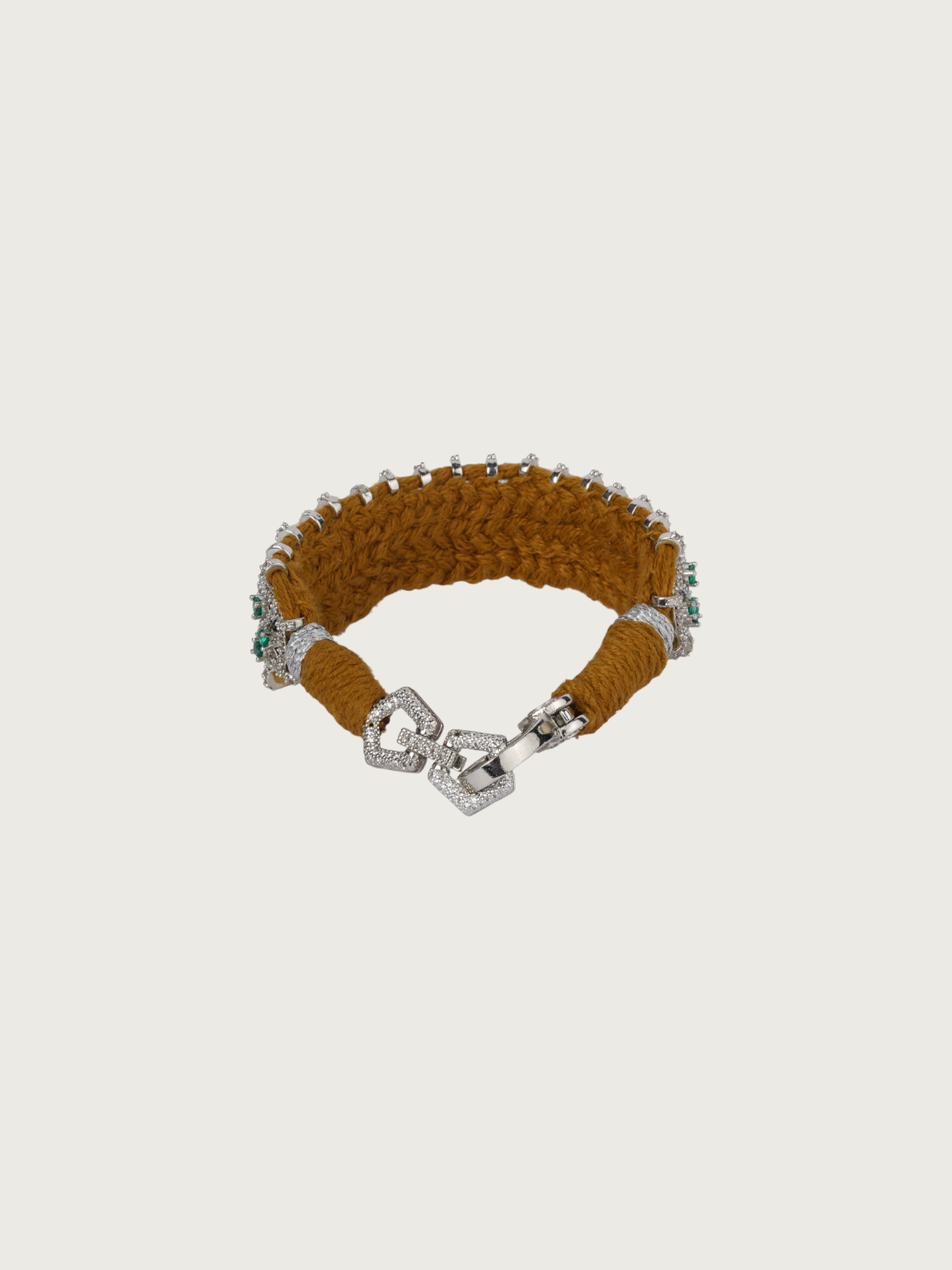 The Tver bracelet showcases a captivating fusion of mustard-toned threadwork and intricate silver-toned detailing. Adorned with a series of sparkling white and green stones in an ornate geometric pattern, this handcrafted bracelet radiates contemporary artistry with a traditional soul. The soft woven texture contrasts beautifully with the brilliance of its embellishments, creating a statement piece of refined allure.