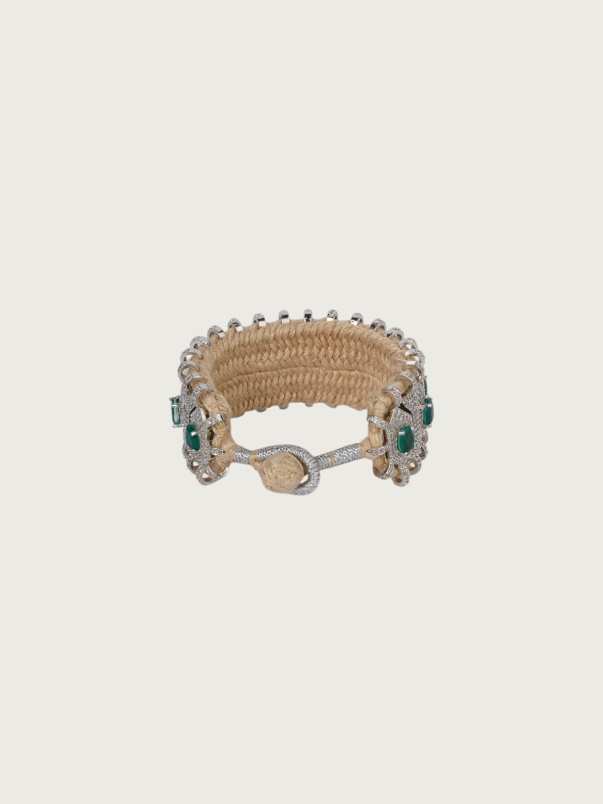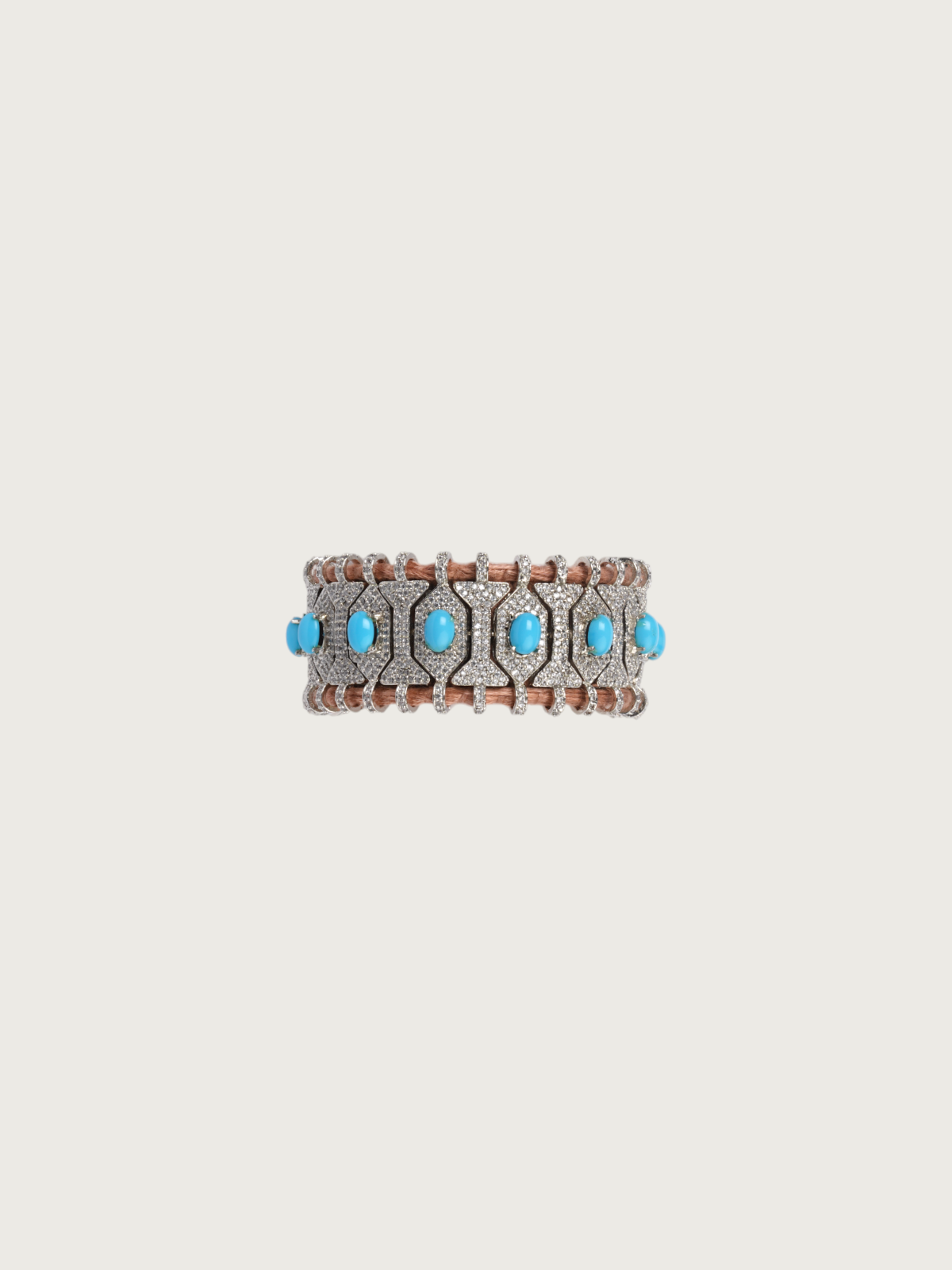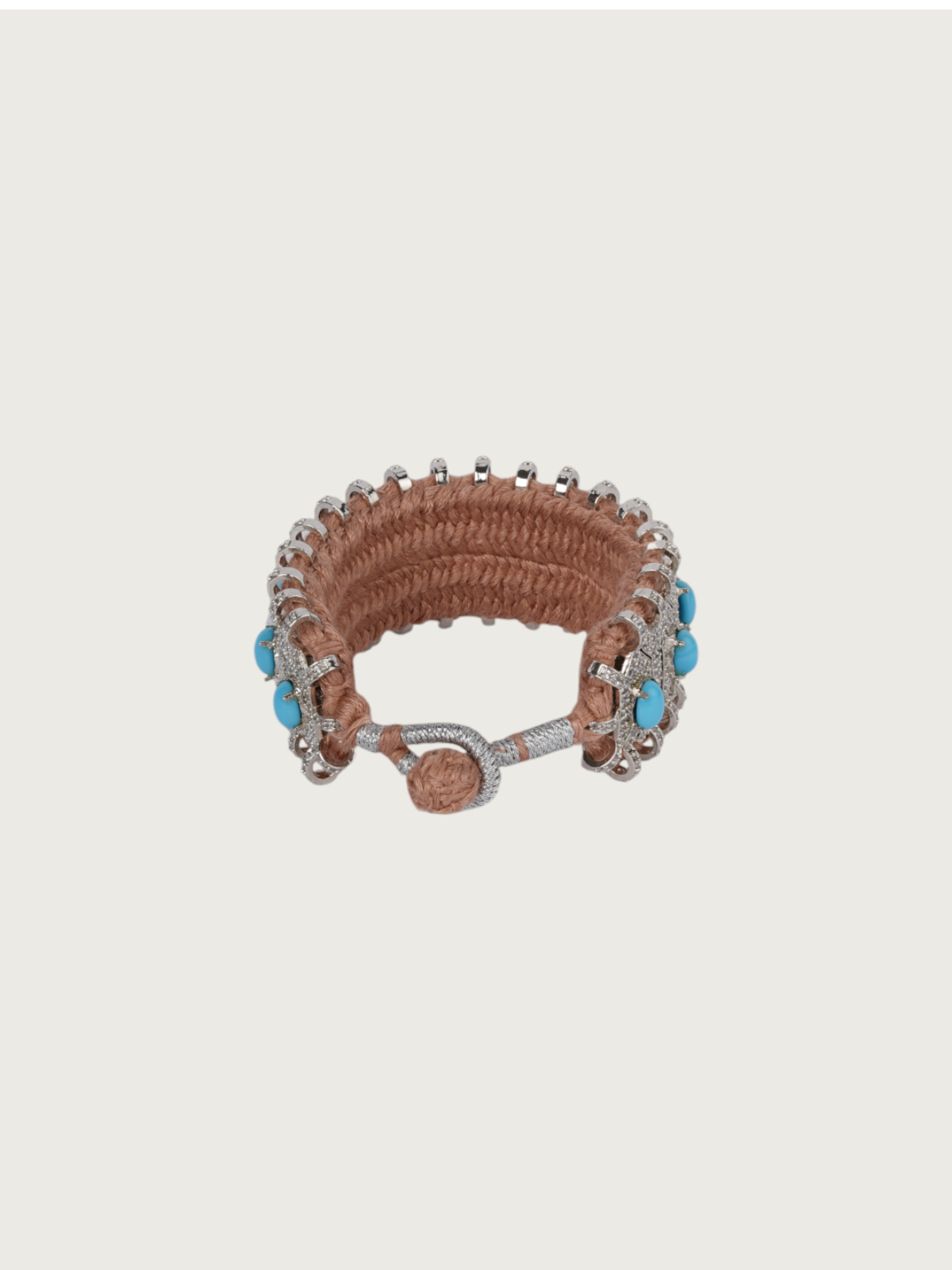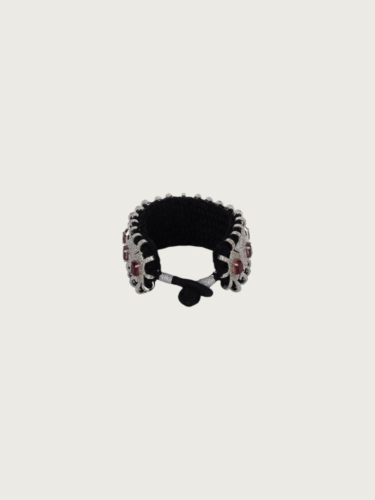 The adjustable fabric loop closure ensures a secure and comfortable fit, making it a versatile statement piece.