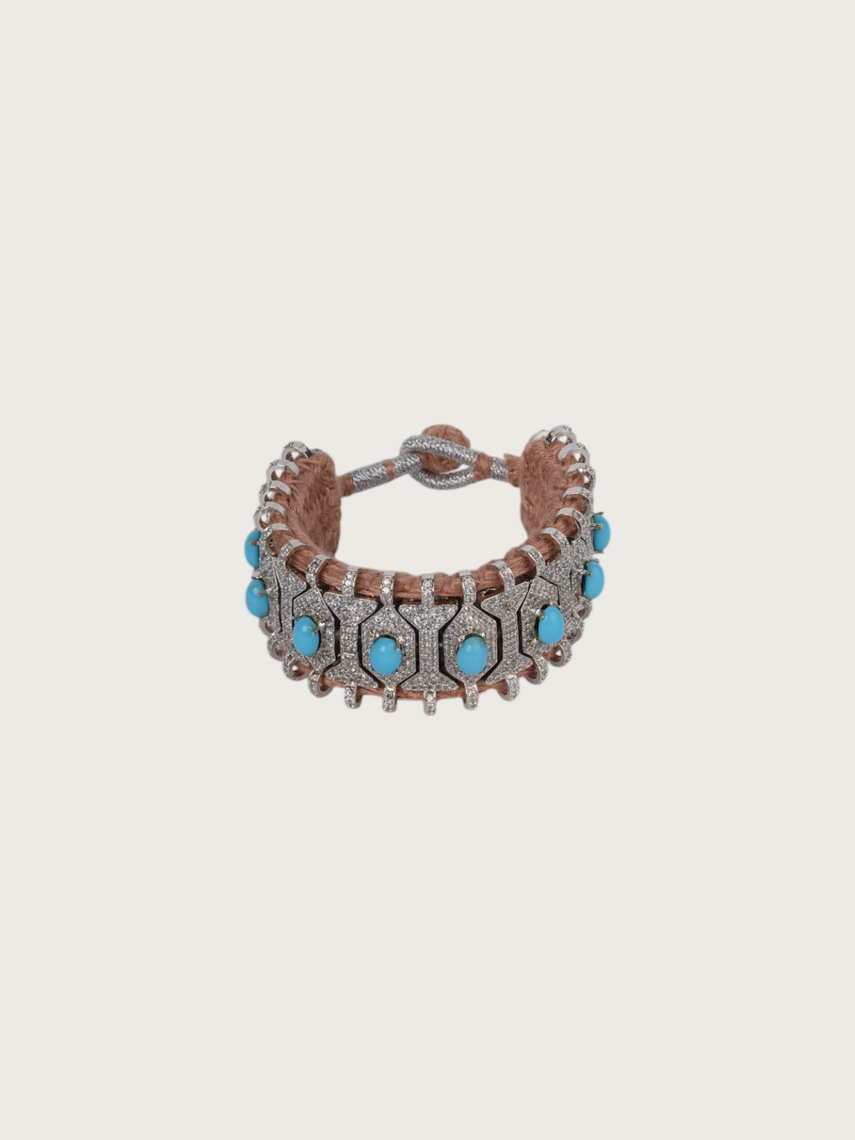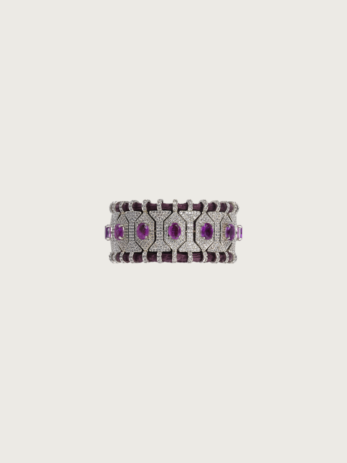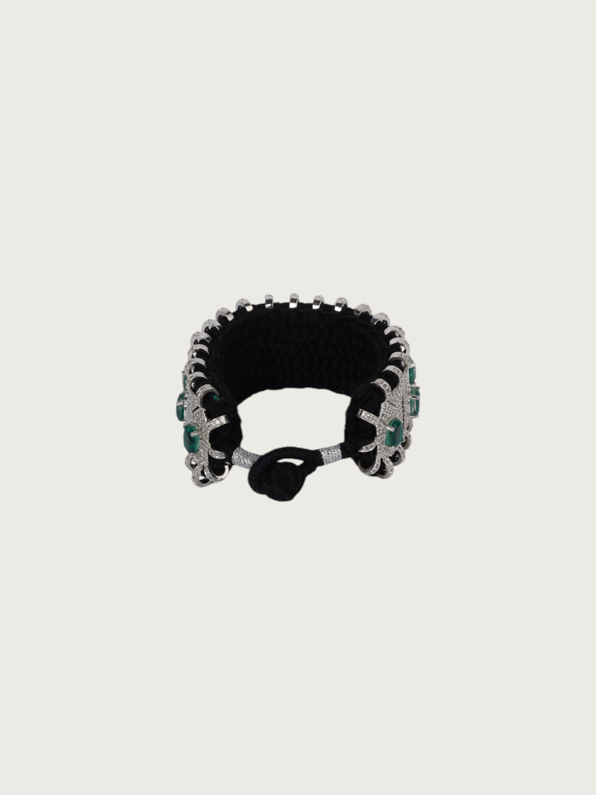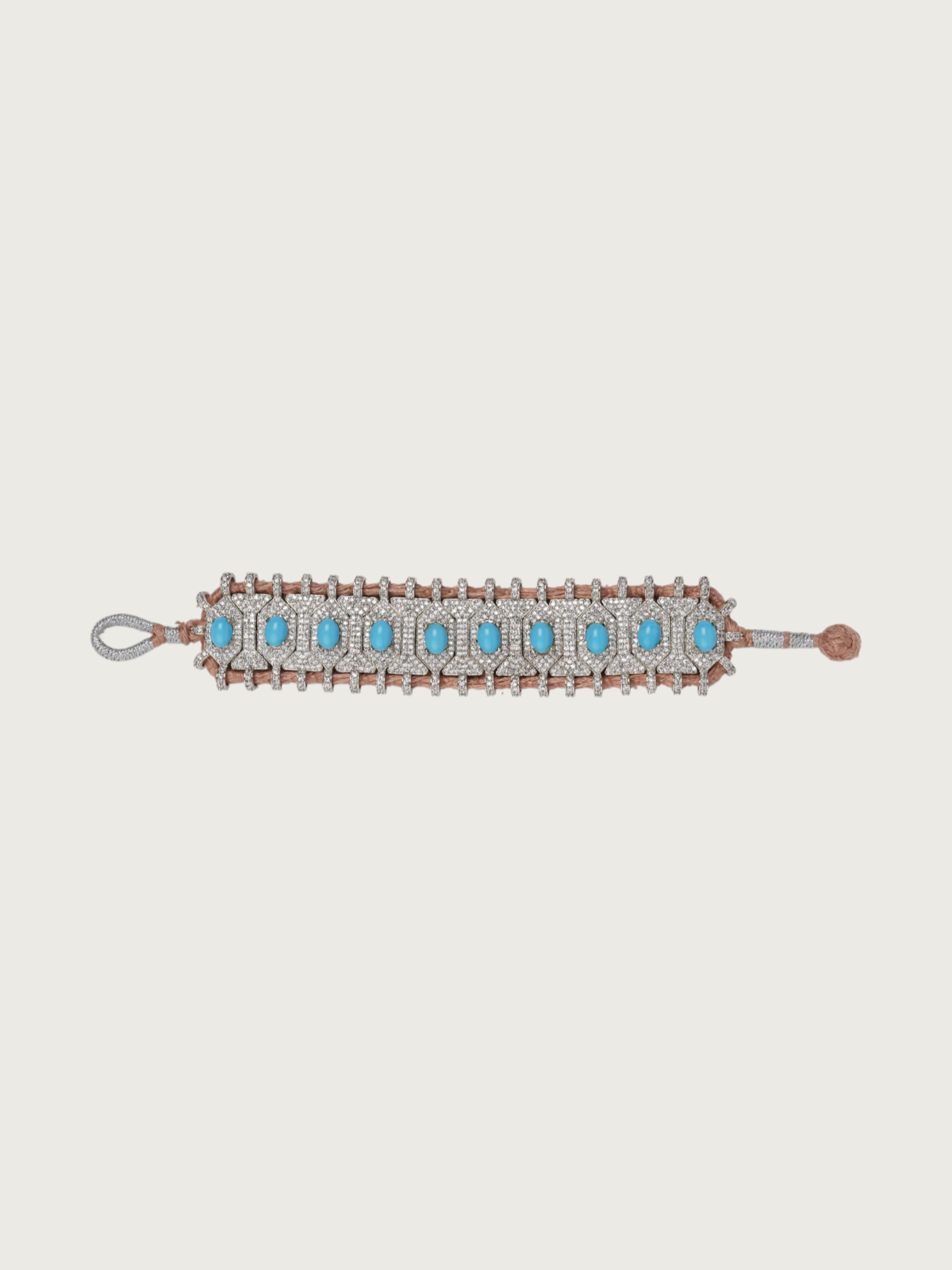 The adjustable fabric loop closure ensures a secure and comfortable fit, making it a versatile statement piece.