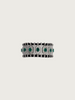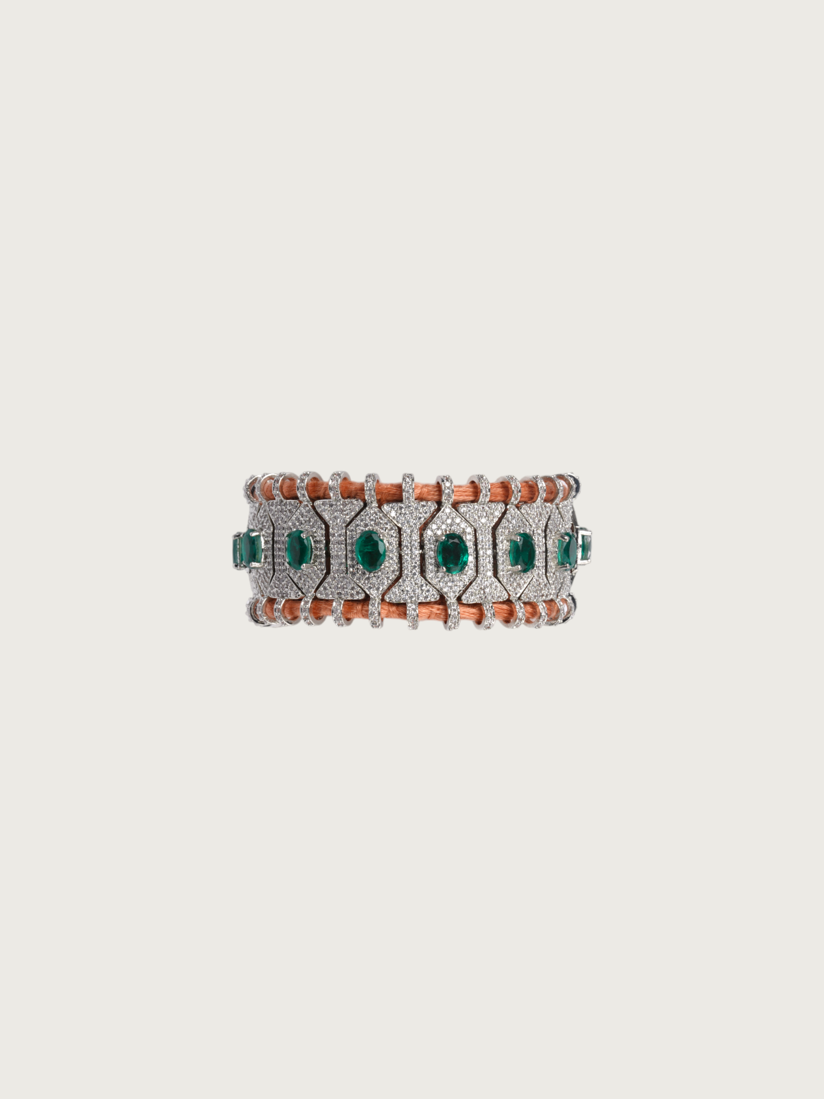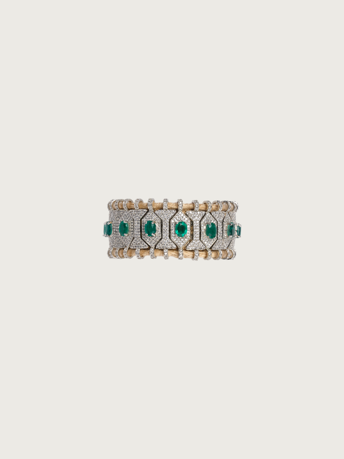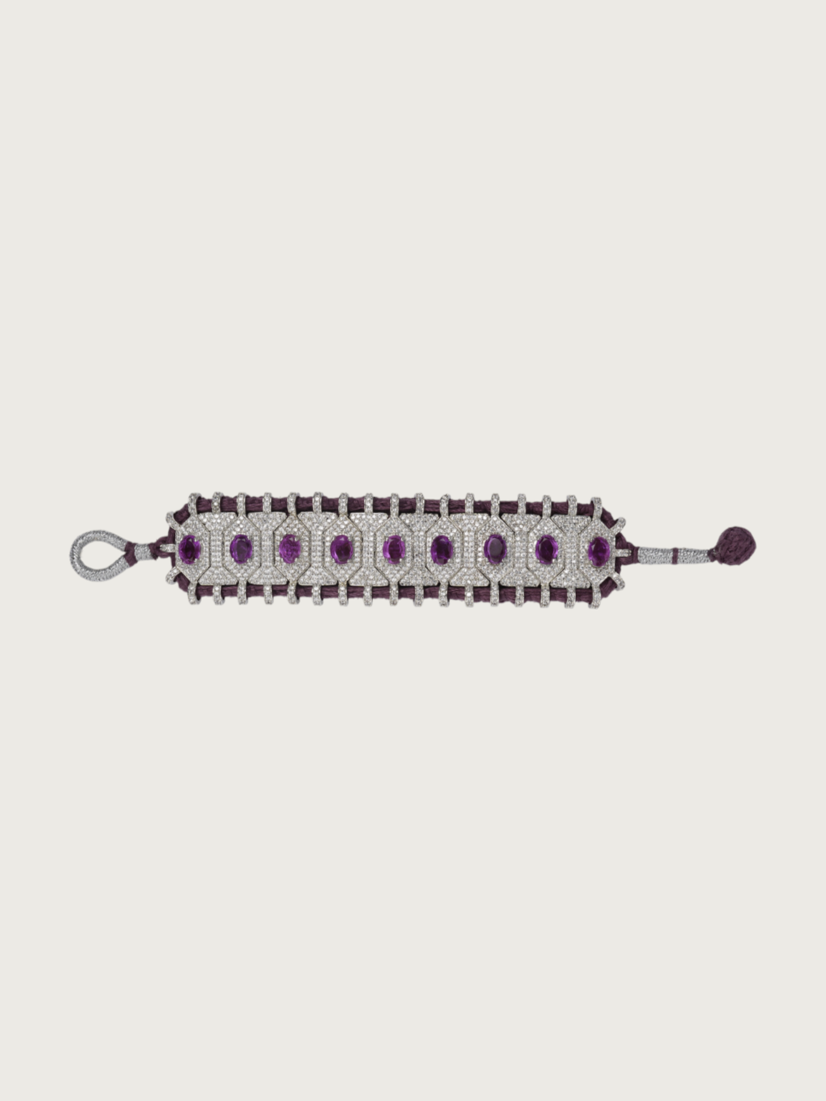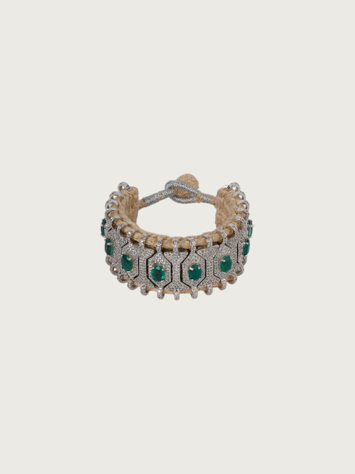 The adjustable fabric loop closure ensures a secure and comfortable fit, making it a versatile statement piece.
