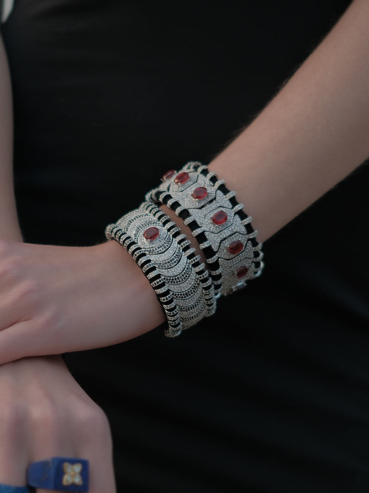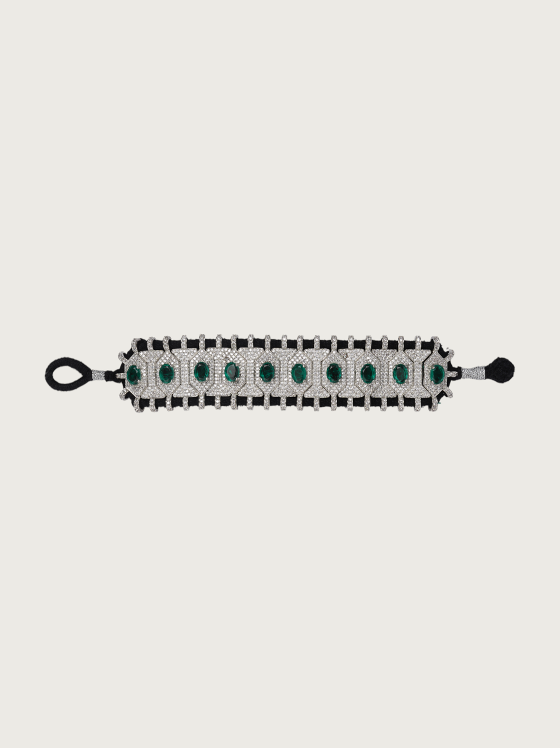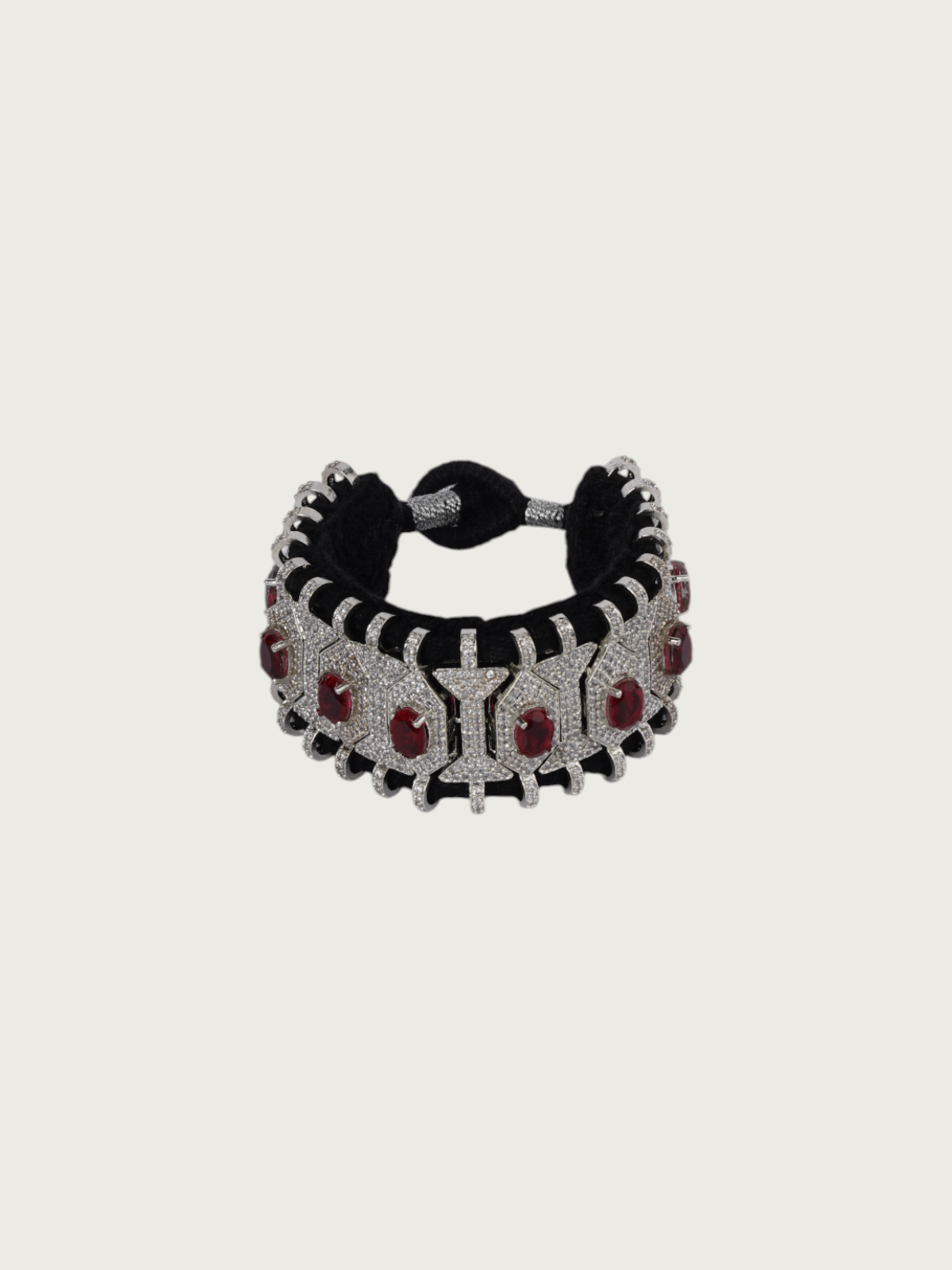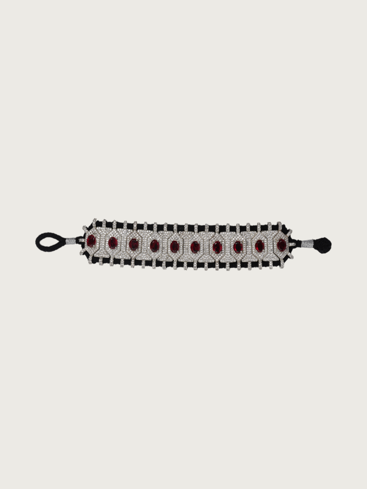 Experience the grandeur of royal Indian jewelry with this exquisite Mughal-inspired red bracelet. Featuring a stunning row of deep red, green, purple, sky blue stones set in a shimmering pavé-encrusted silver-plated frame, this handcrafted piece is woven with thread detailing for an elegant contrast. Designed to emulate the luxury of traditional heirloom jewelry, this bracelet brings the beauty of the past into modern elegance.